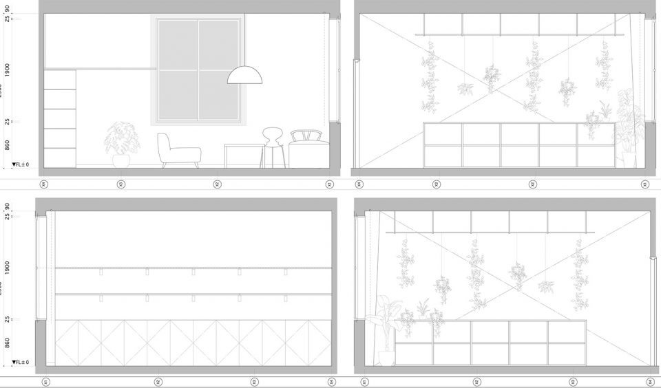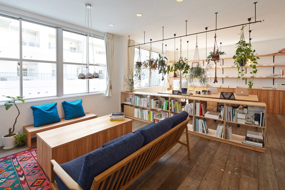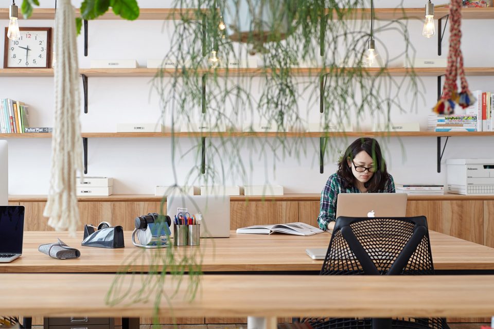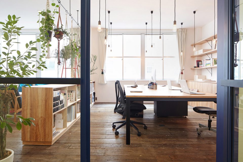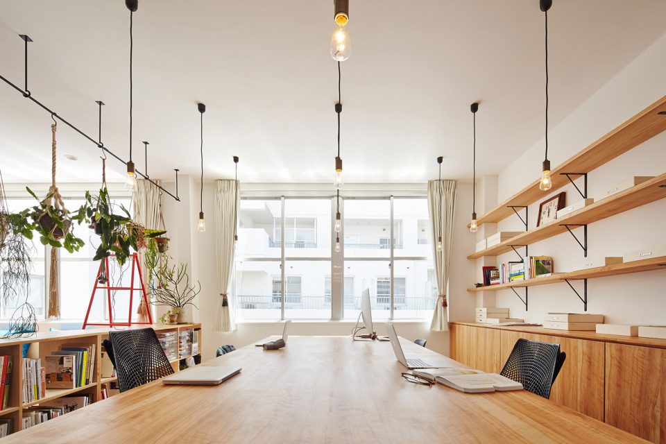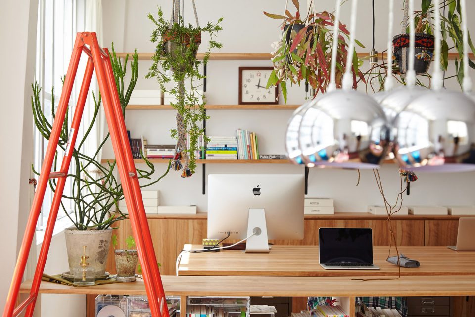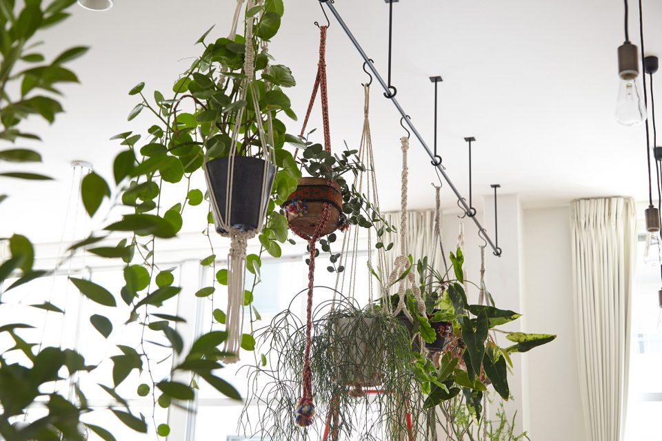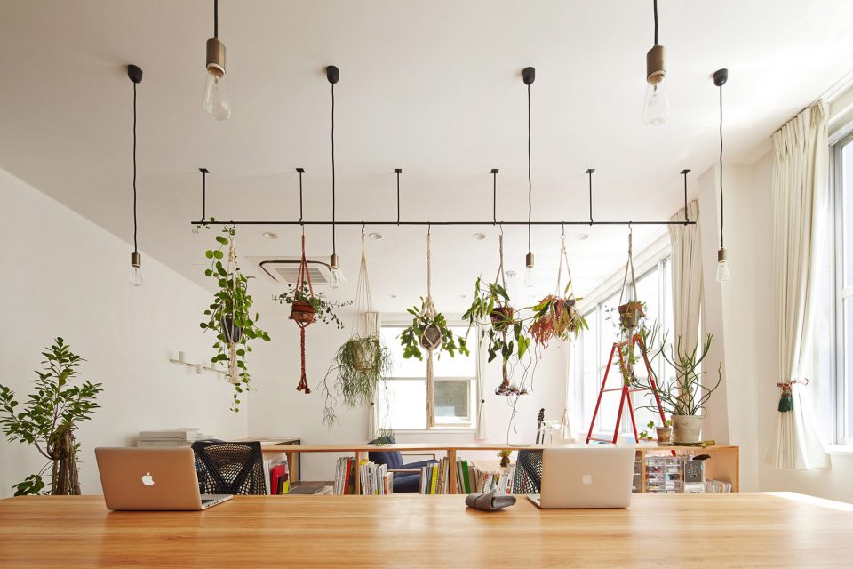 此次设计规避了以往的墙面隔断,而是在设计区域和洽谈区域之间设置了悬挂植物作为分隔。