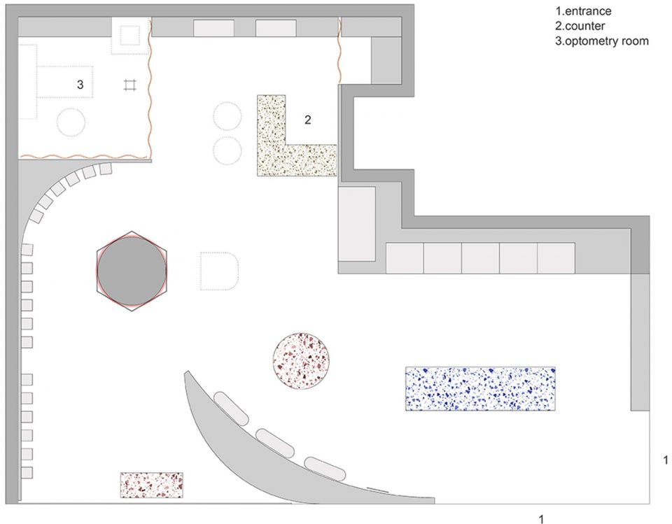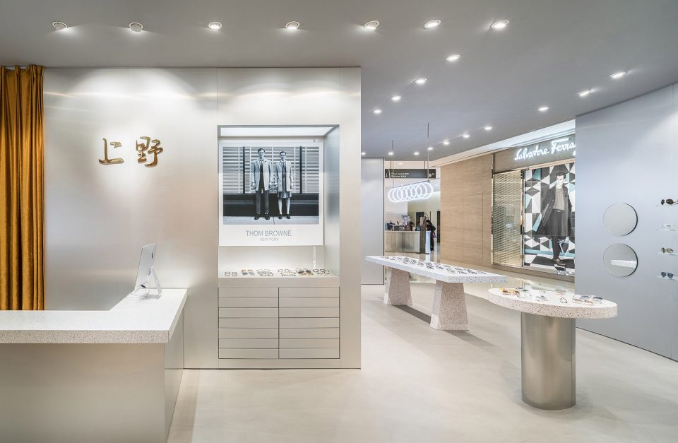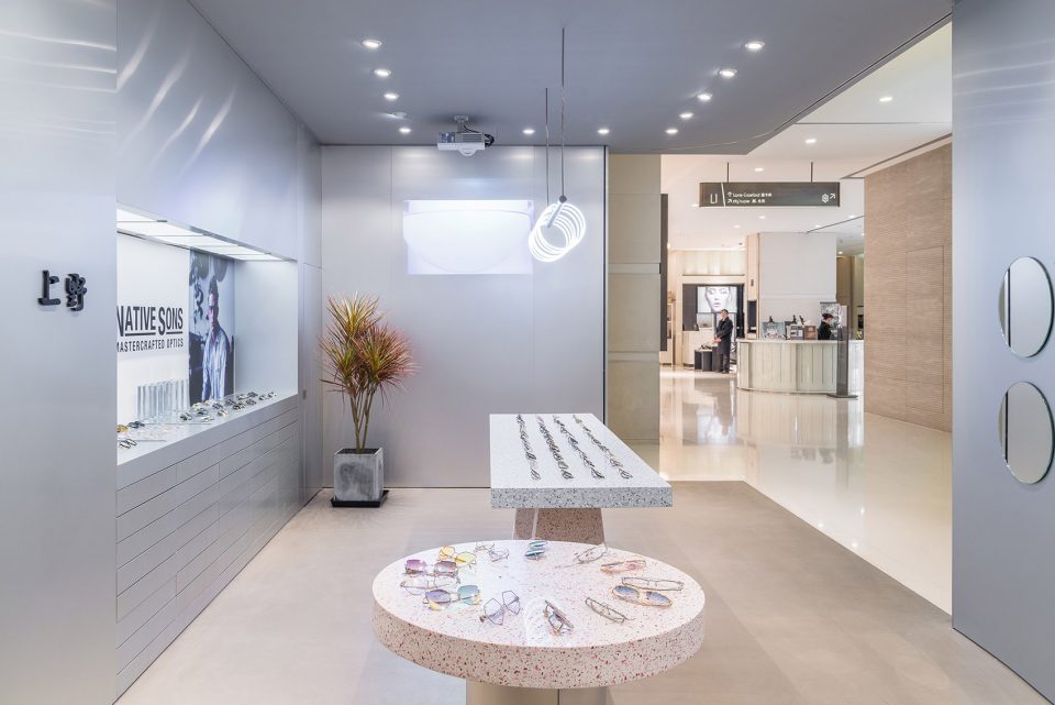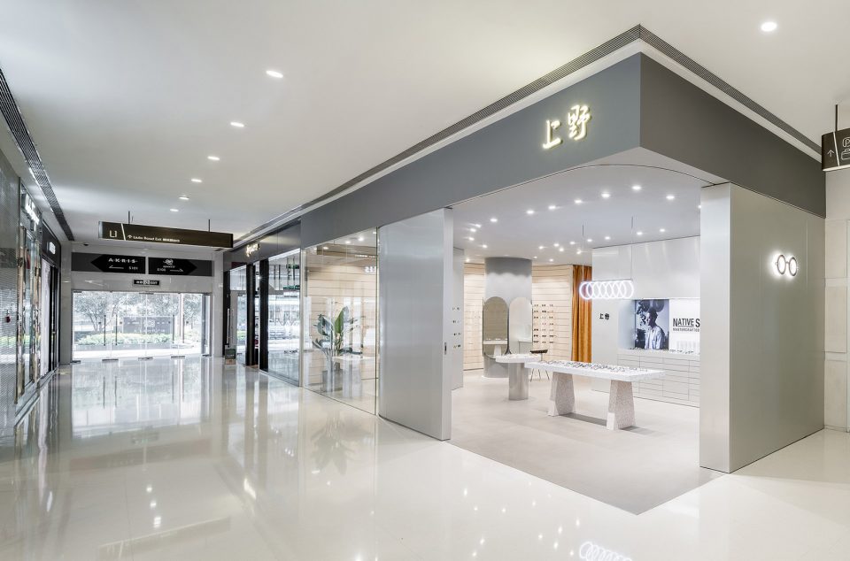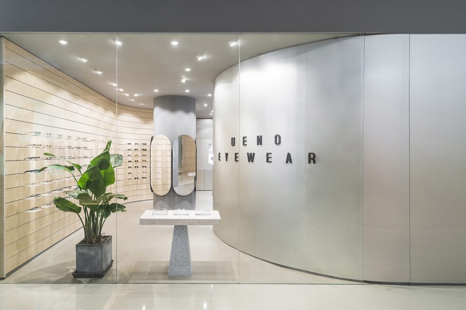 本次设计的“上野”眼镜店位于上海连卡佛商厦的一楼。商店的入口大幅开启在两条通道的转角处,将过往的行人引入店内。不同于一个静态的立面,设计上使用了曲面的墙,将视线汇集到内部现有的圆柱上,这样的布置也使得交通动线更流畅。