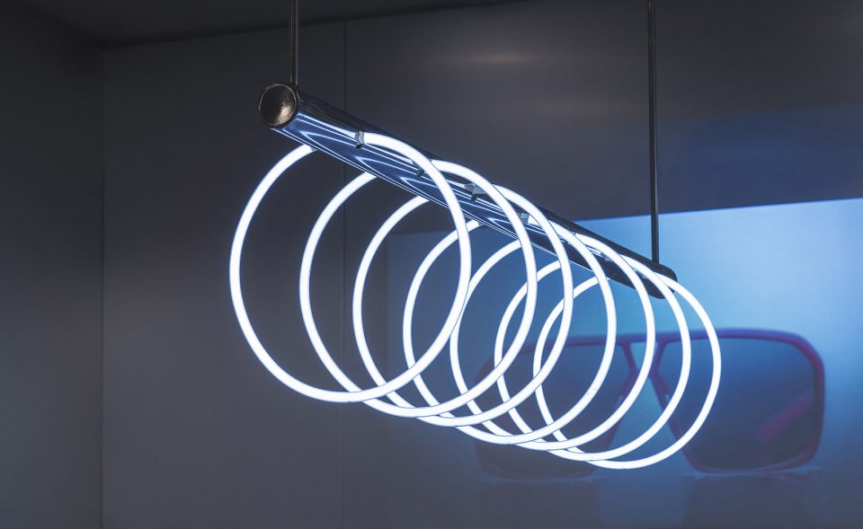 圆柱上安置了六面全身镜,像万花筒般反射着周边的景象,视觉上连接了不同空间,延展了内部场景。人们挑选着眼镜,看到镜中的自己,环步四周,继续购物。