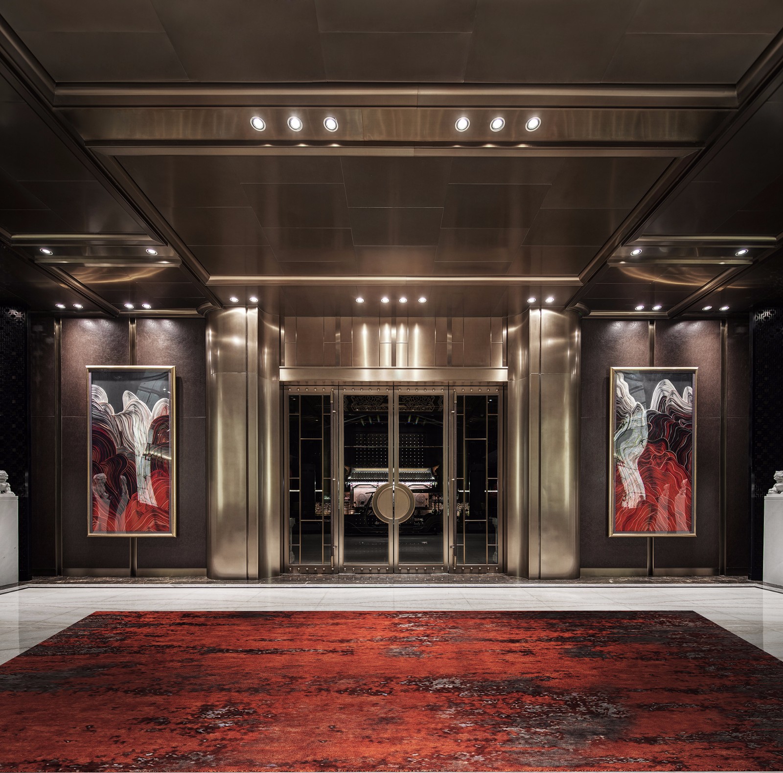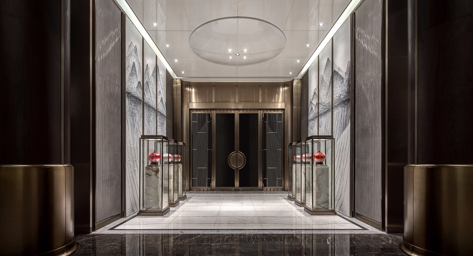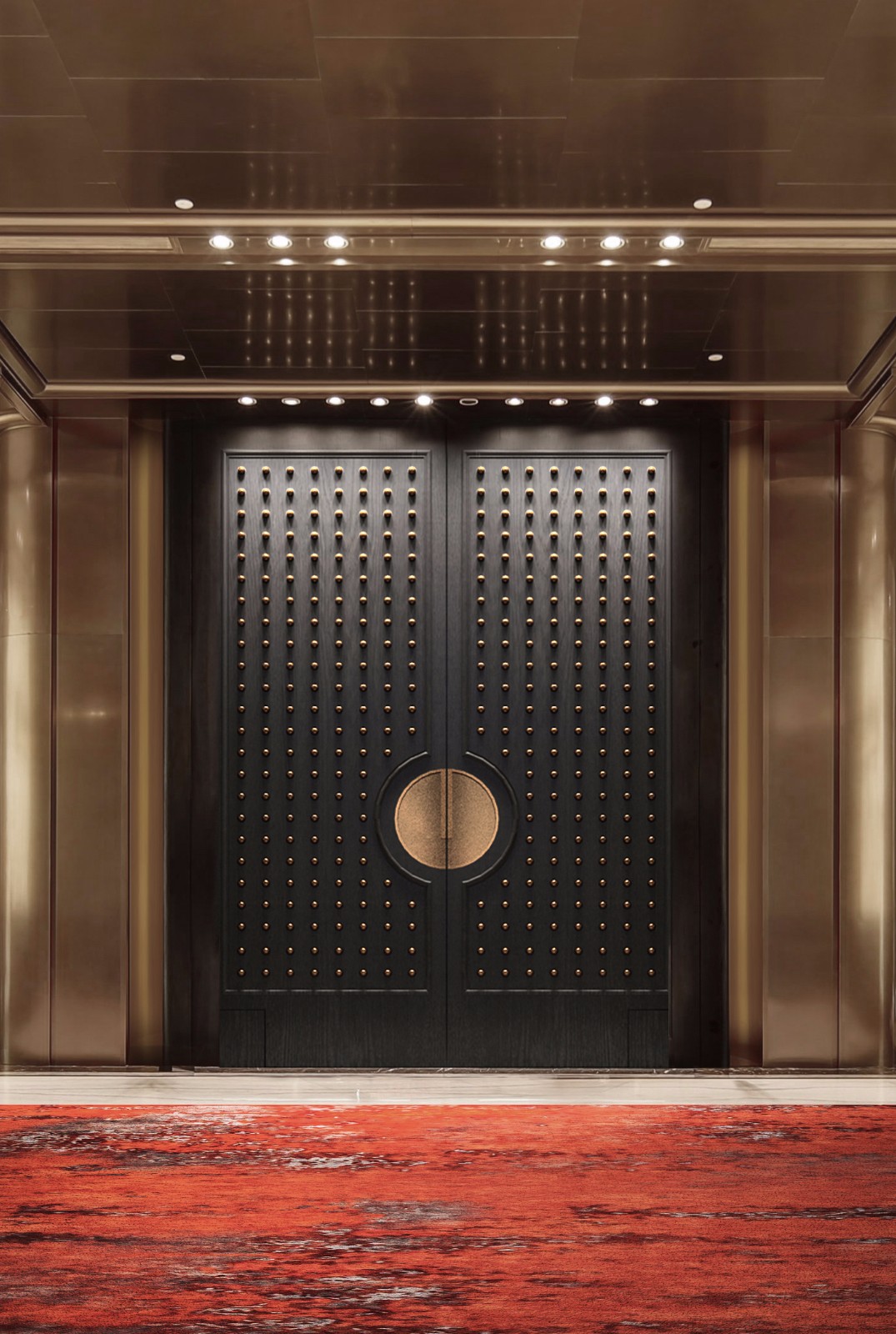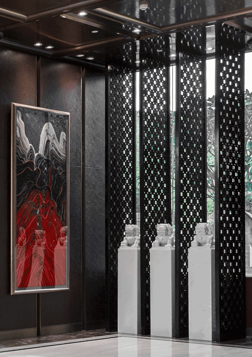 左右对称、方圆并举,简约别致的玻璃大门有框景作用,在现代建制中低调而巧妙地纳入古时的审美。推门而入,迎面而来的却是另一扇气势更为磅礴的门墙,沉厚的黑铜、丰饶的金,高贵古雅的气息扑面而来。门是中国建筑艺术最为集中的体现,也是古代礼制、形制的代表物。古建新制,具象到抽象,不变的是其象征的意义。