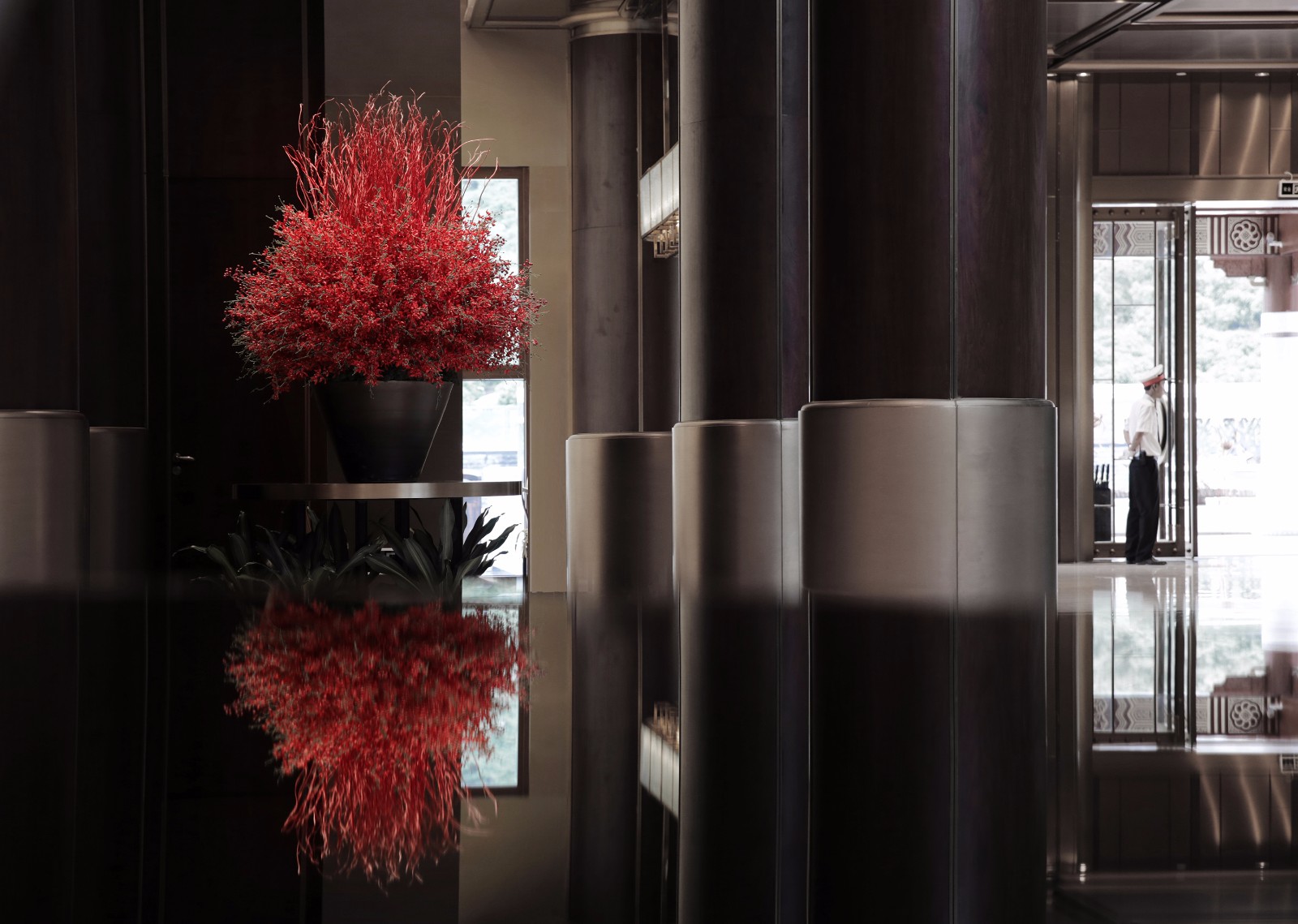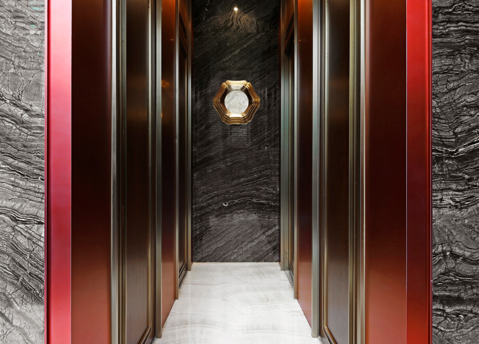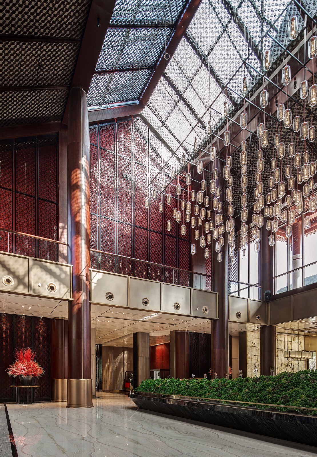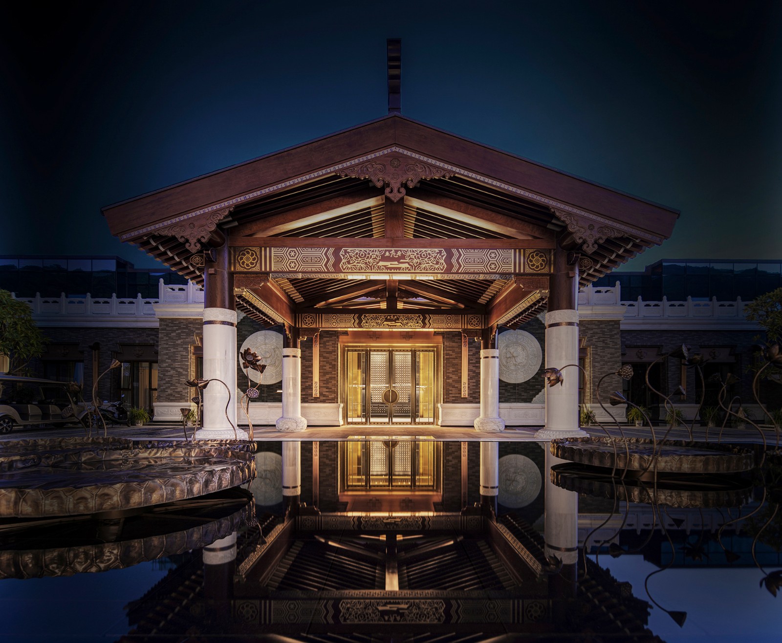 左右对称、方圆并举,简约别致的玻璃大门有框景作用,在现代建制中低调而巧妙地纳入古时的审美。推门而入,迎面而来的却是另一扇气势更为磅礴的门墙,沉厚的黑铜、丰饶的金,高贵古雅的气息扑面而来。门是中国建筑艺术最为集中的体现,也是古代礼制、形制的代表物。古建新制,具象到抽象,不变的是其象征的意义。
