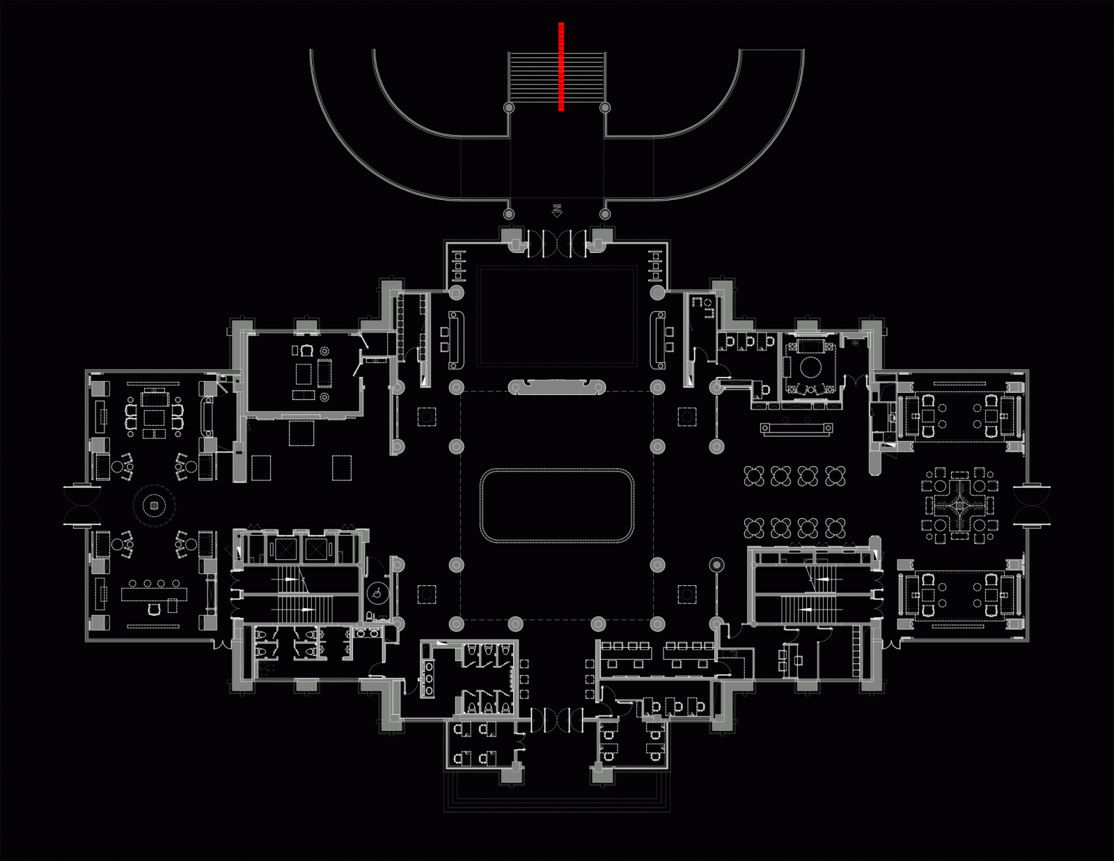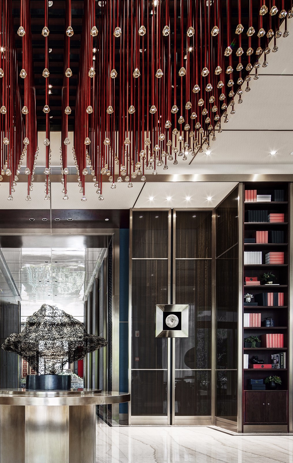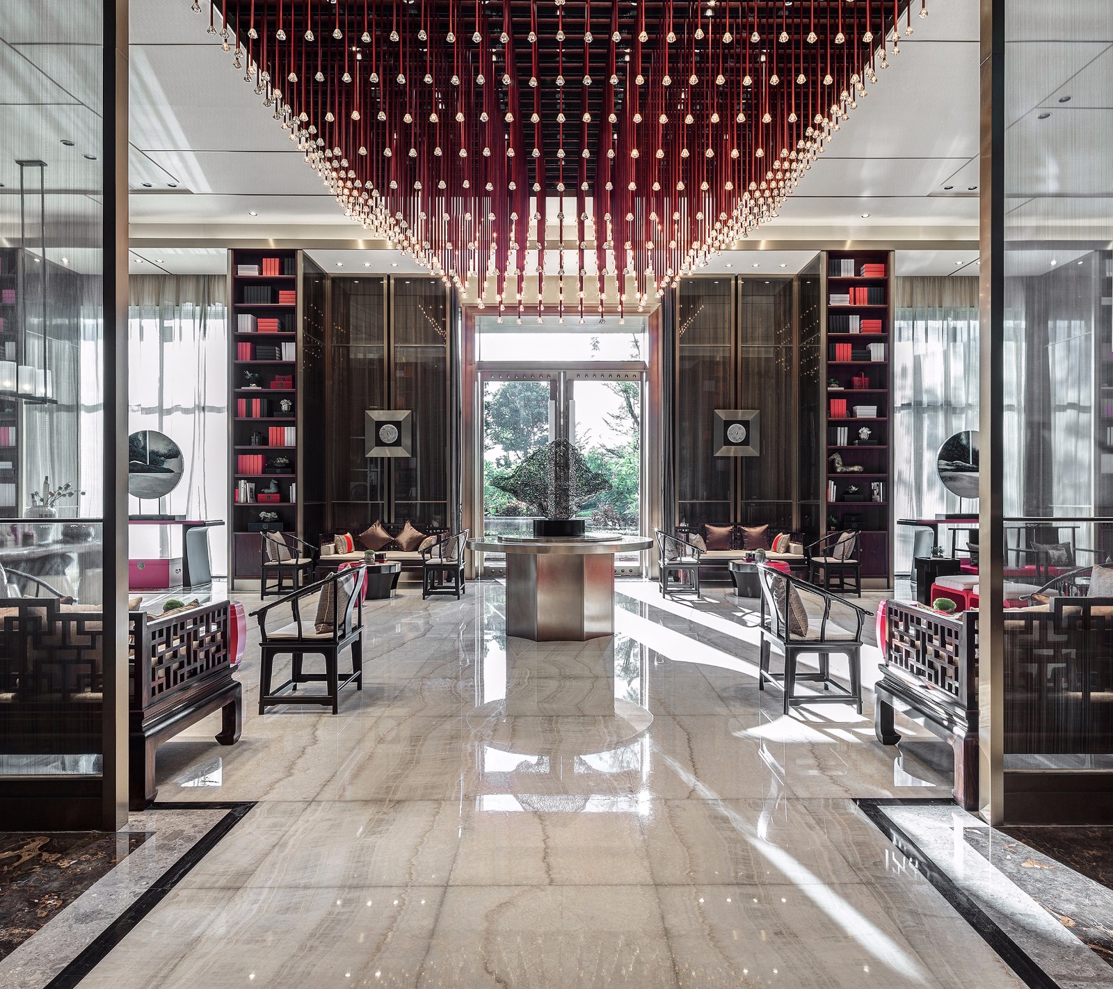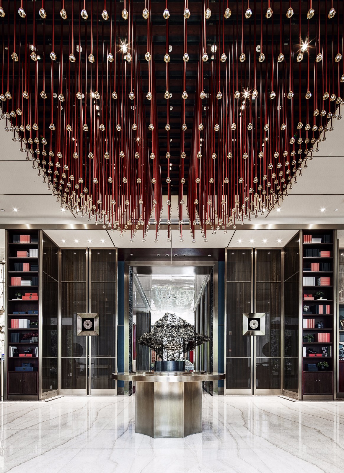 左右对称、方圆并举,简约别致的玻璃大门有框景作用,在现代建制中低调而巧妙地纳入古时的审美。推门而入,迎面而来的却是另一扇气势更为磅礴的门墙,沉厚的黑铜、丰饶的金,高贵古雅的气息扑面而来。门是中国建筑艺术最为集中的体现,也是古代礼制、形制的代表物。古建新制,具象到抽象,不变的是其象征的意义。
