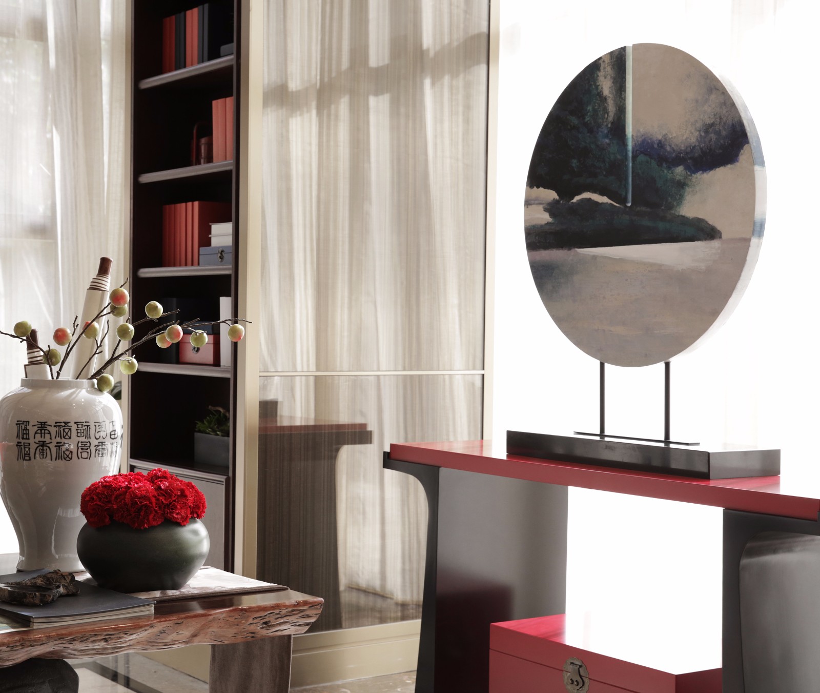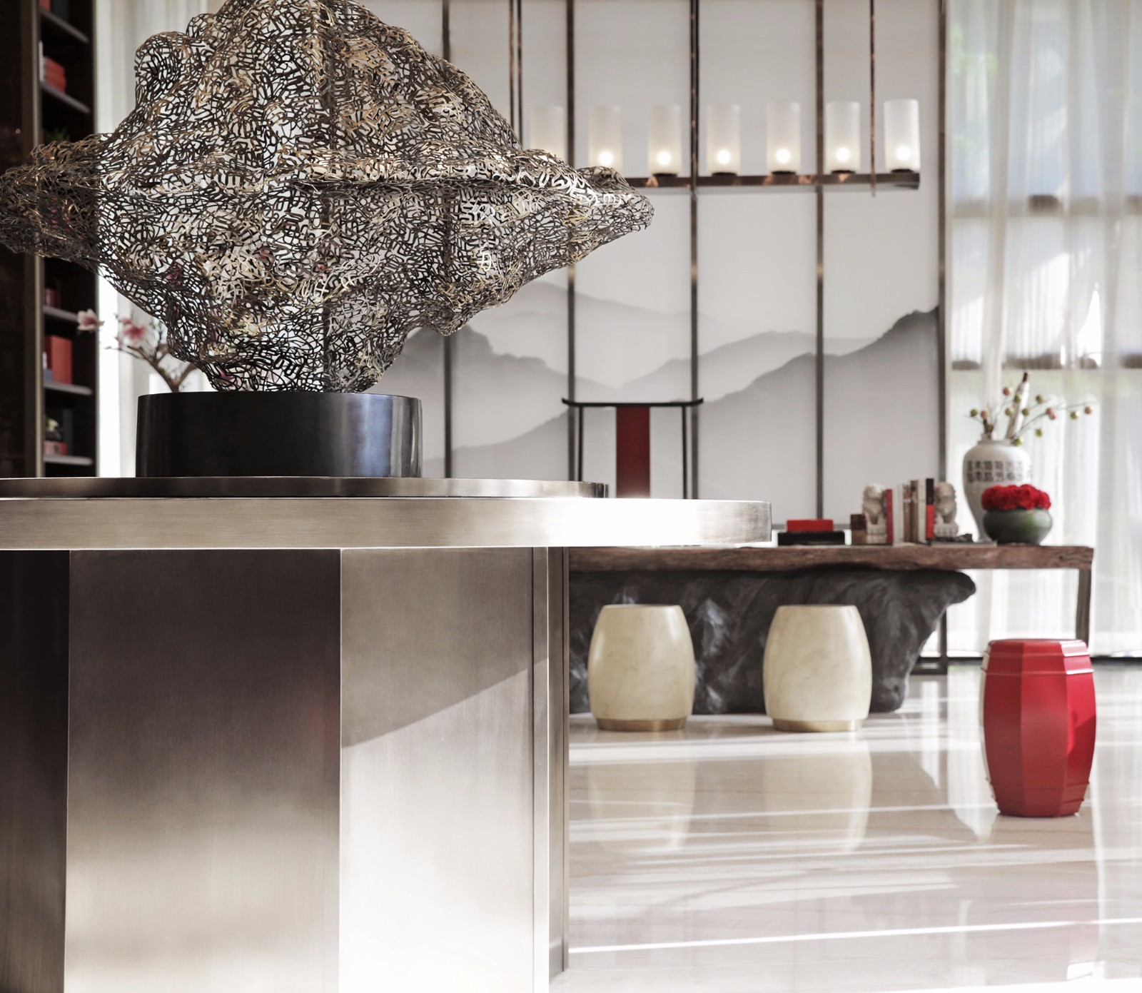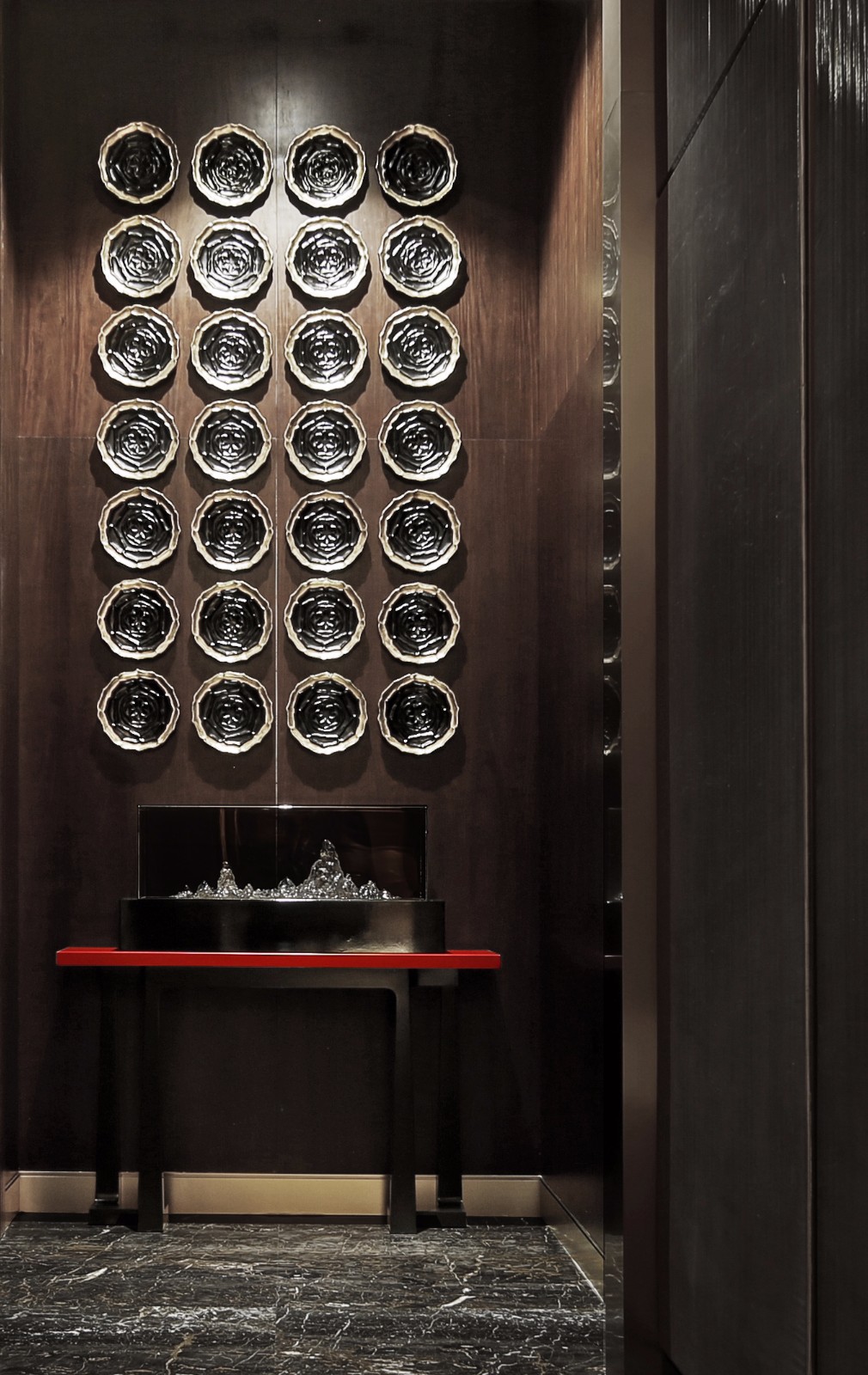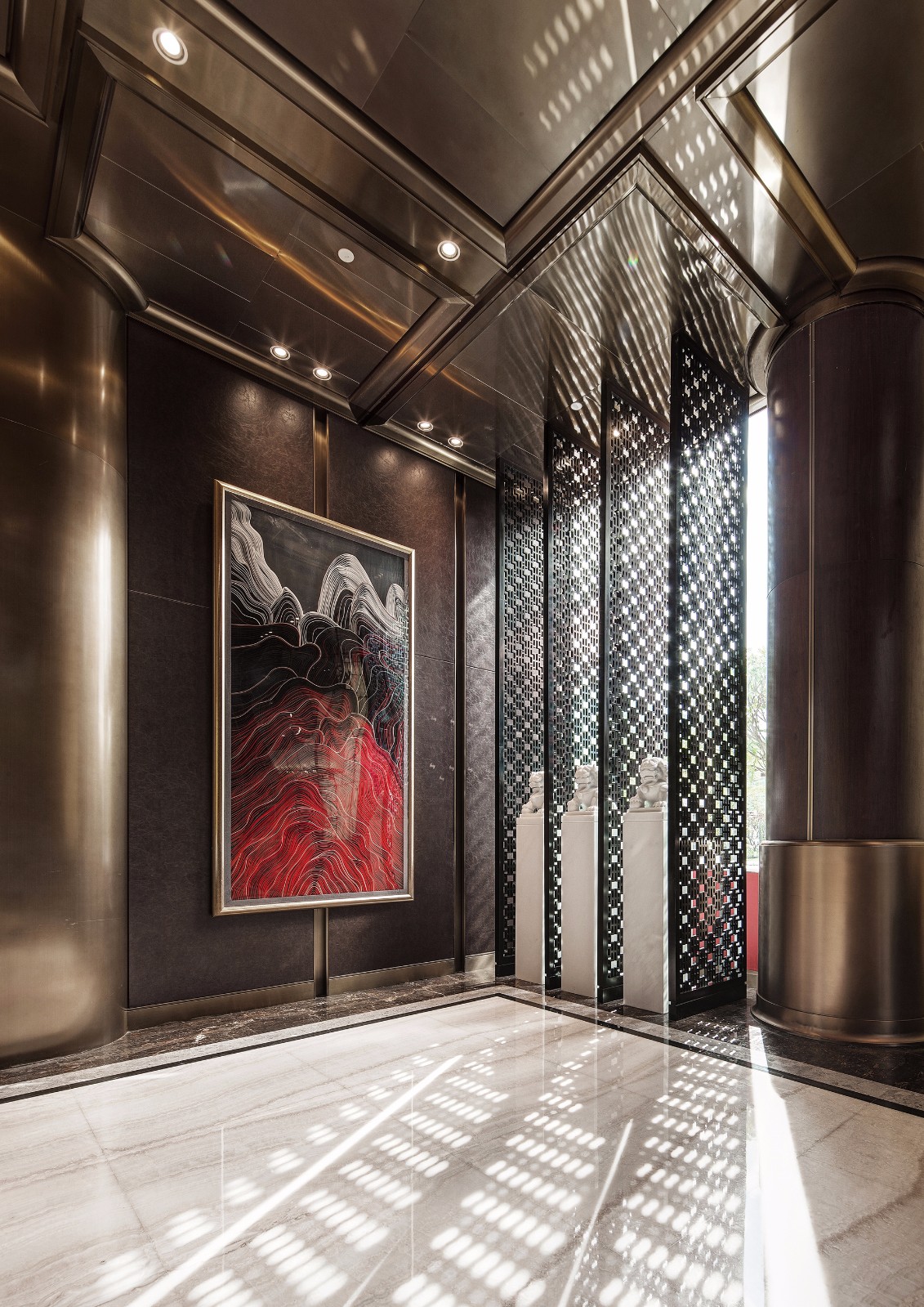 在东方式的审美意趣中,艺术灵感随处可见,走道的尽头又是一个瑰奇的精神世界。设计师以中国特有的文化艺术遗产瓦当、门钉元素构图设景,创意独具,韵致盎然。