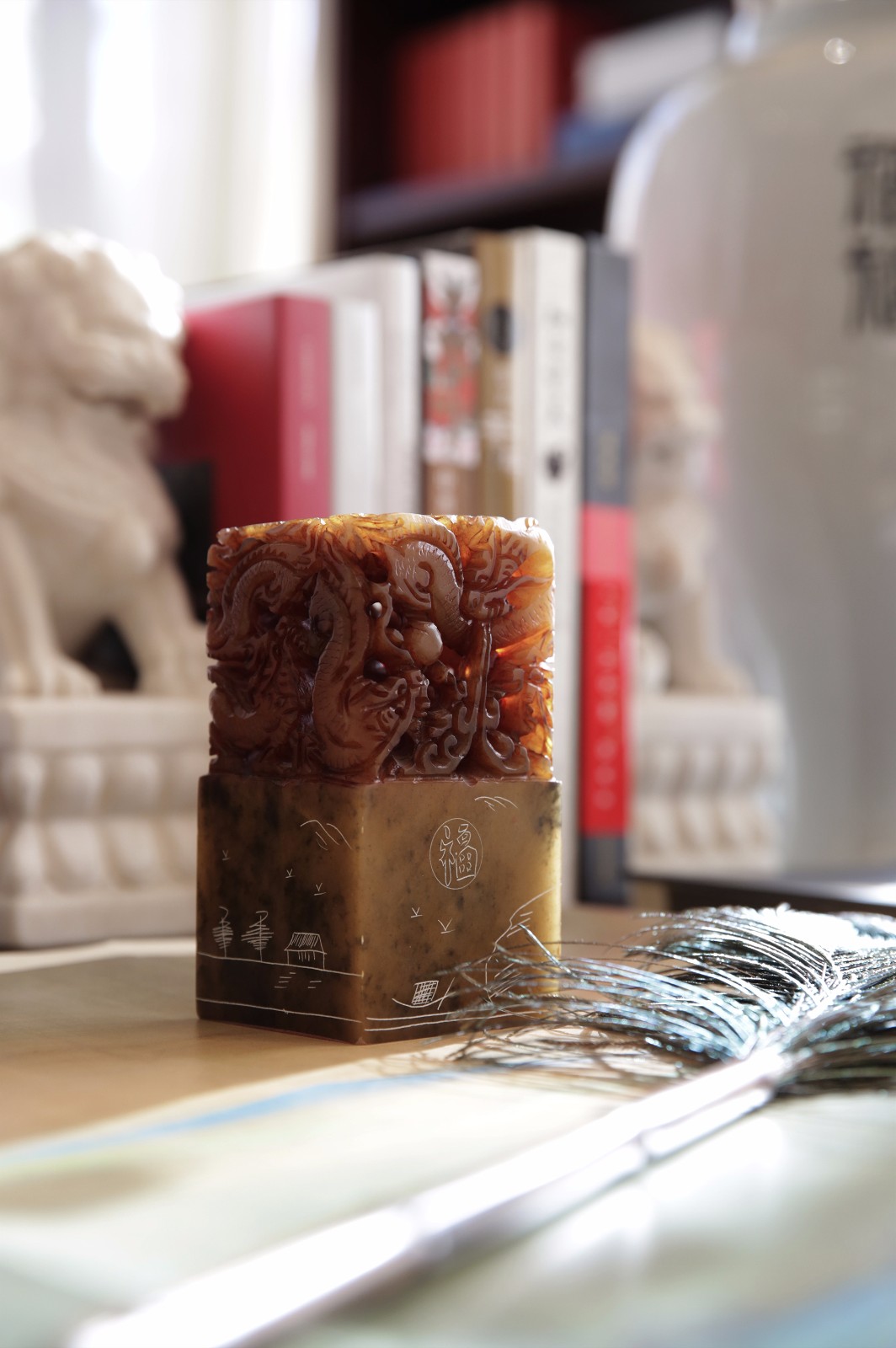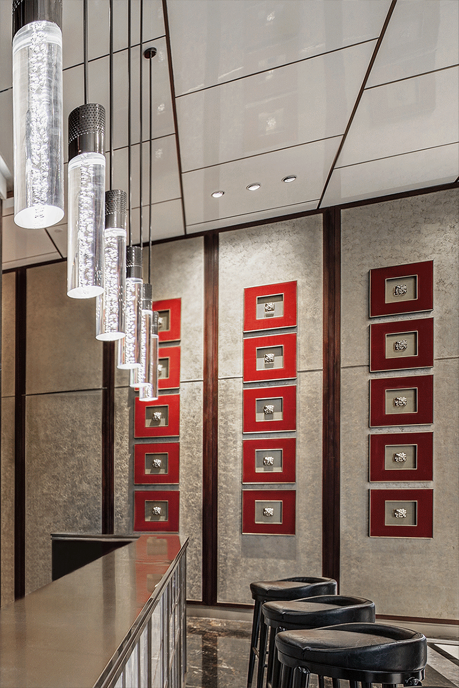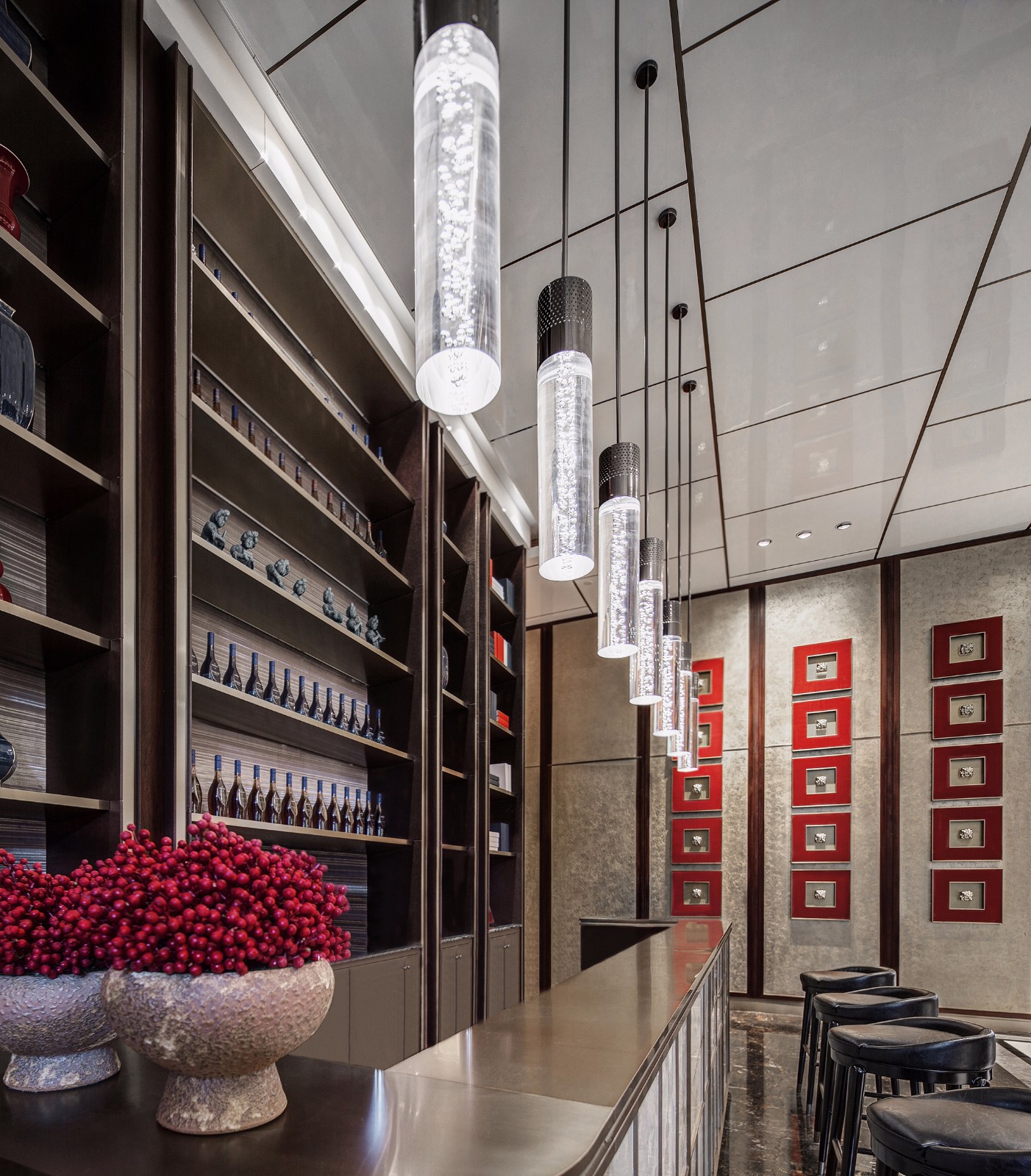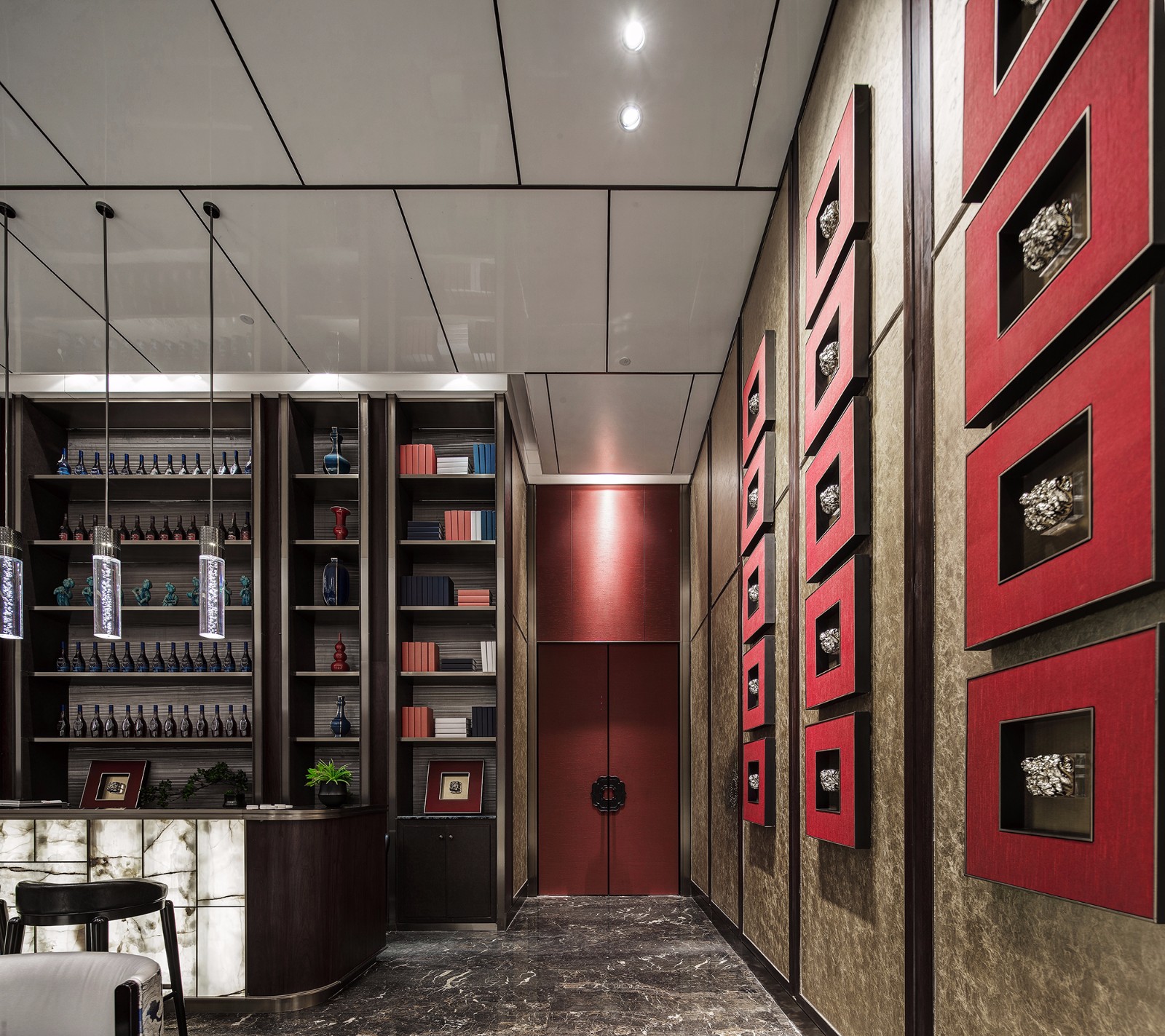 吧台右侧墙体是设计的妙笔,印玺等传统元素的规律组合,构思巧妙,穿越时空,似有红墙宫里万重门的历史风情。