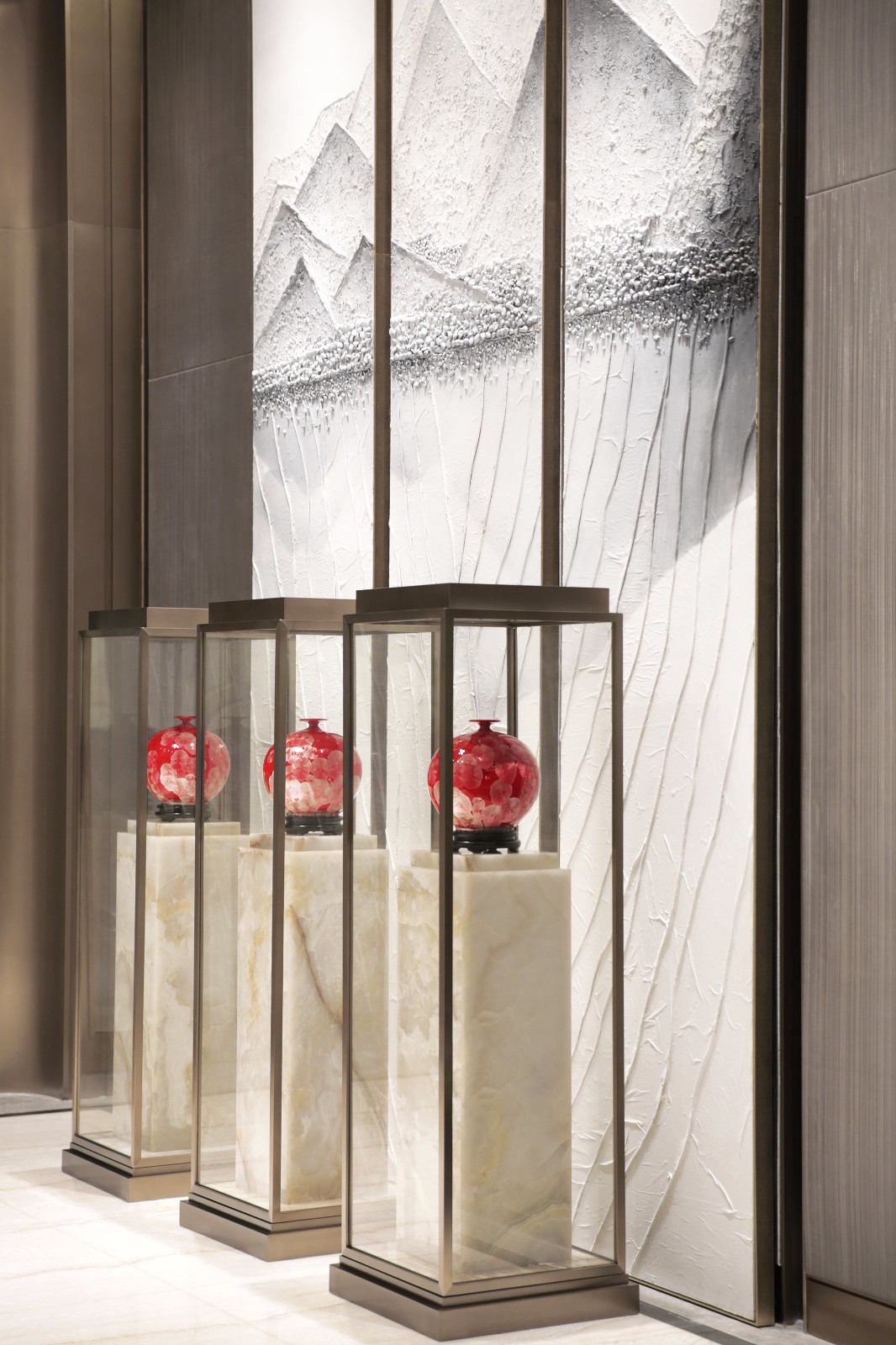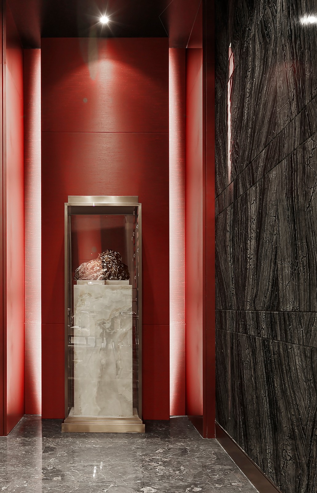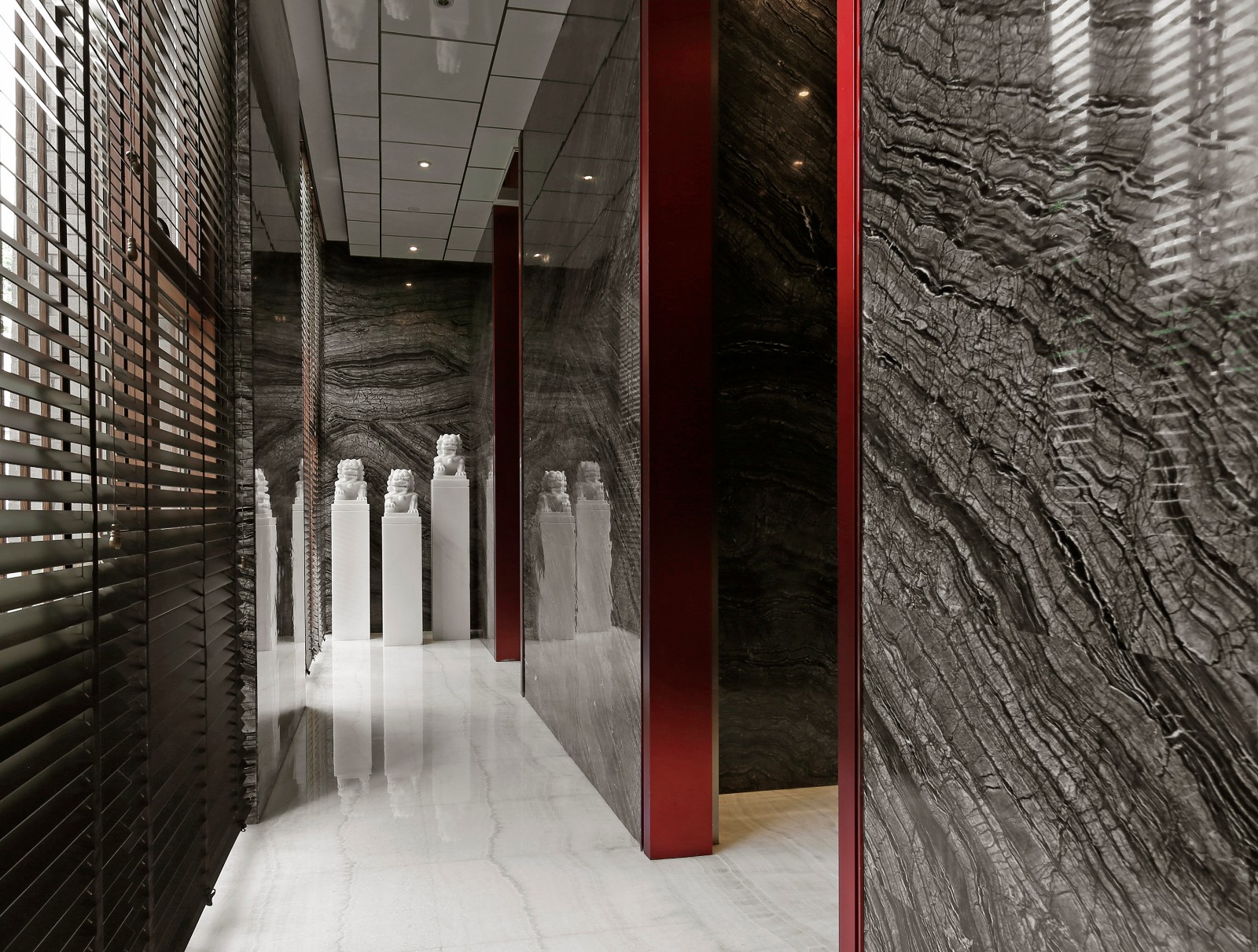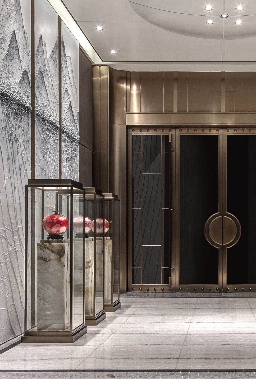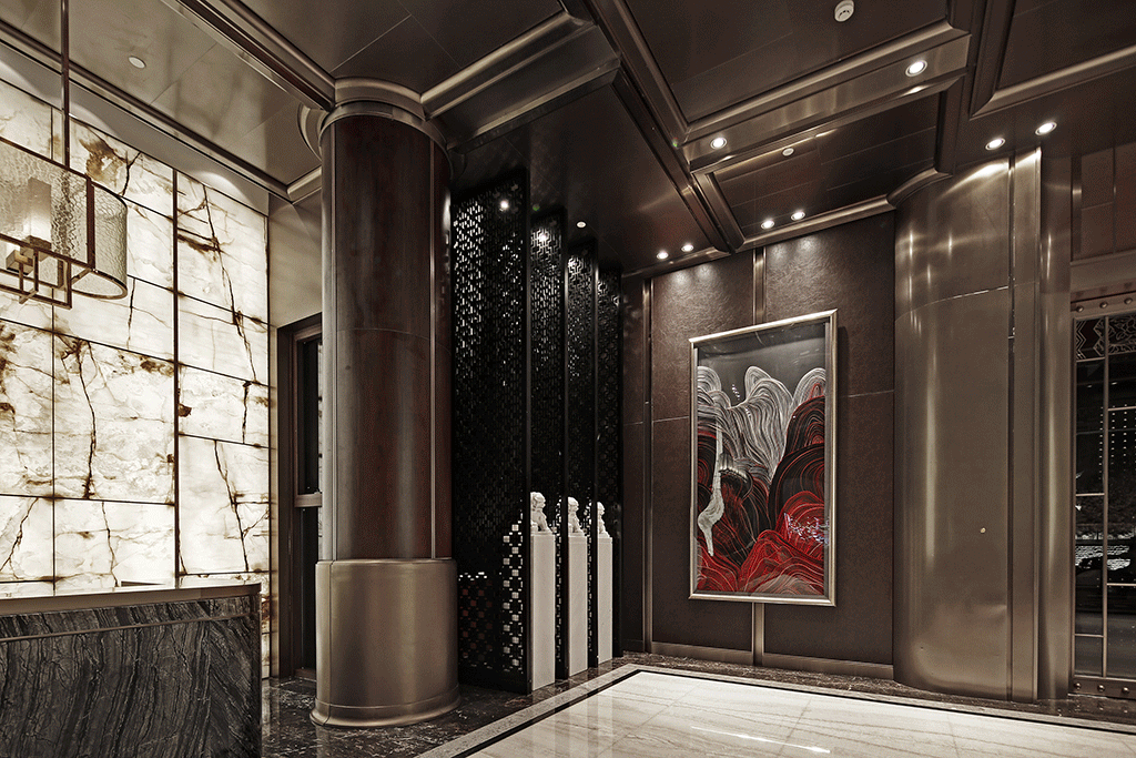 空间左右对称,白色大理石雕塑,聊为助意,增添了新的意趣。右侧的接待台安然静置,其后的云石背景墙,温润中散发熠熠光彩,吸引着观者由此步入下一个空间。