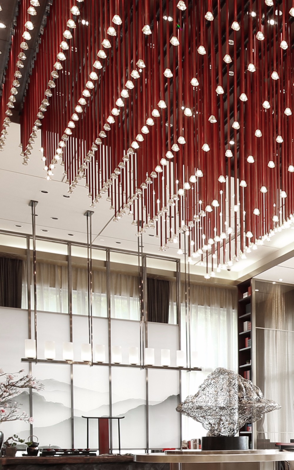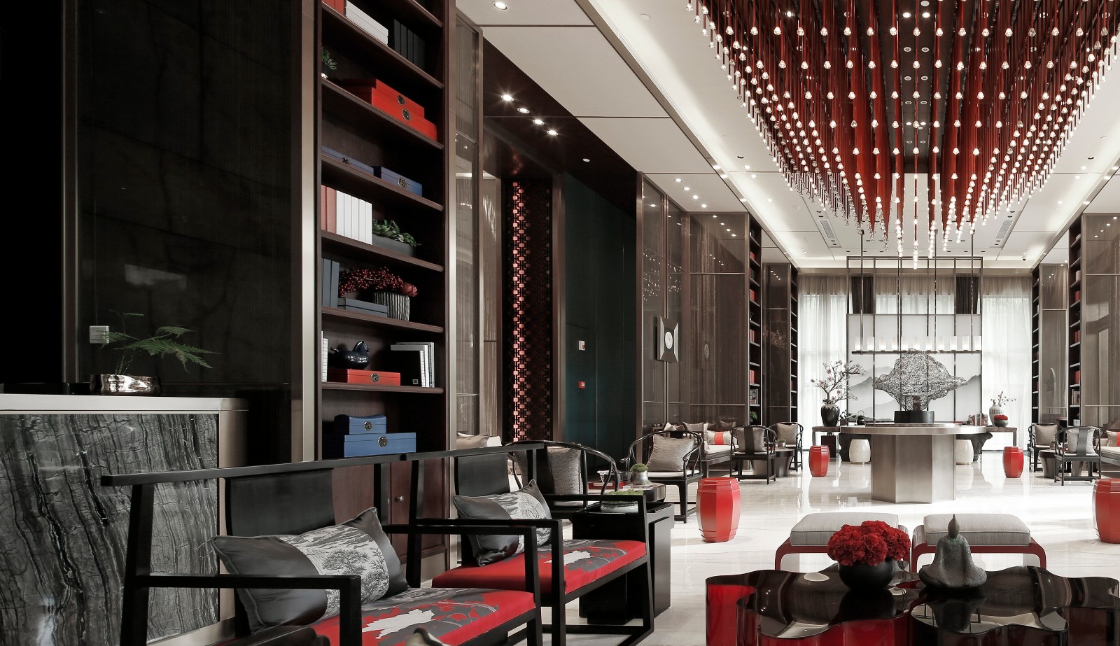 洽谈区设计古趣盎然,构架疏朗大方,设色和谐醒目。不可胜数的红线均衔着一枚枚小灯,悬于天花,排列有序,给人强烈的视觉印象,让人想起古时戏服上的流苏,皇家宫廷中的帷幔,层层出新,意蕴无尽。