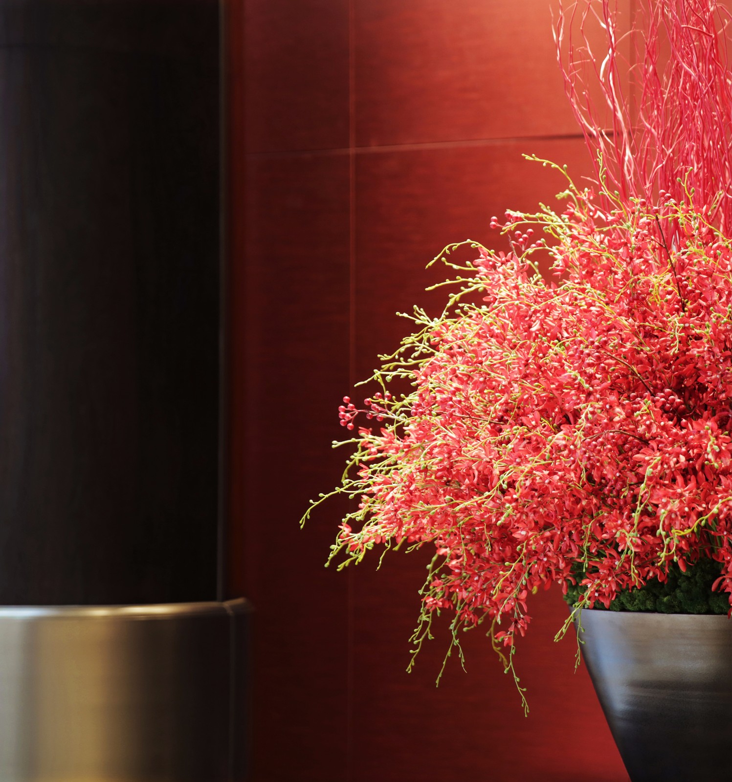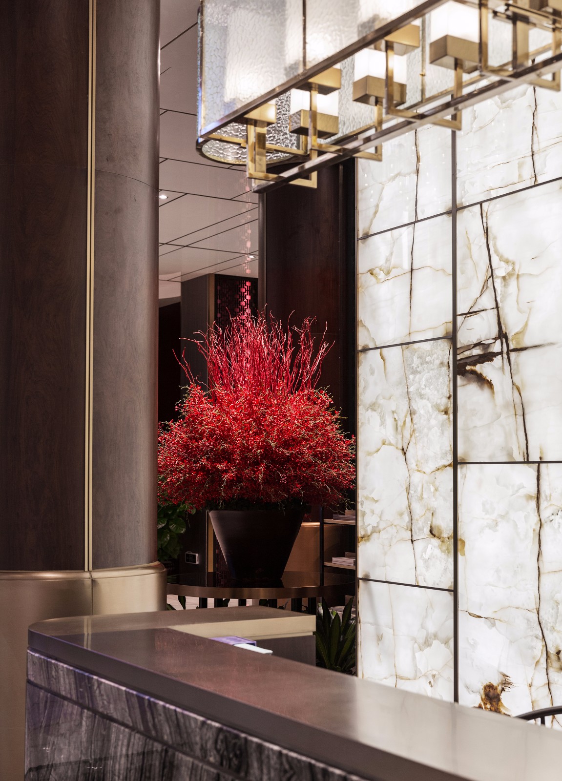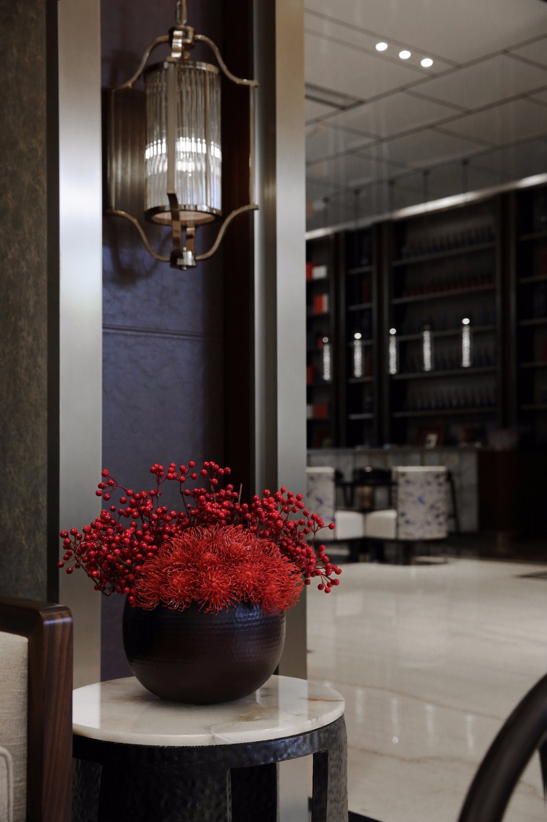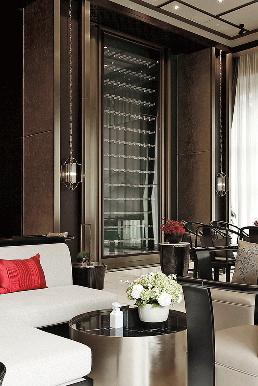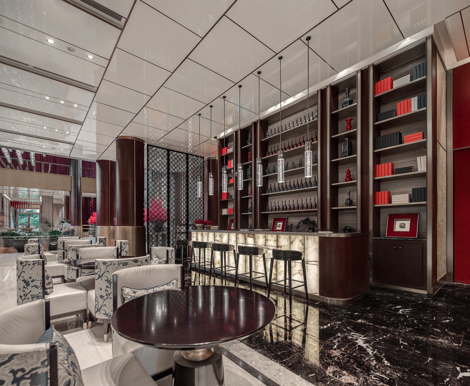 在两株热烈火红的花树迎接下,来到水吧区,古朴典重中带有怡然清雅之美,正统的红与贵雅的棕,凝聚着浓郁的精神元素,整体营造出一种气质独到的美学旨趣。地面以黑白两色大理石地铺区分活动区域,衔接过渡自然。黑色隔栅屏风有着幽微隐约的透景效果,白色的软包座椅妆点素雅,以惬意的姿态静待佳音。