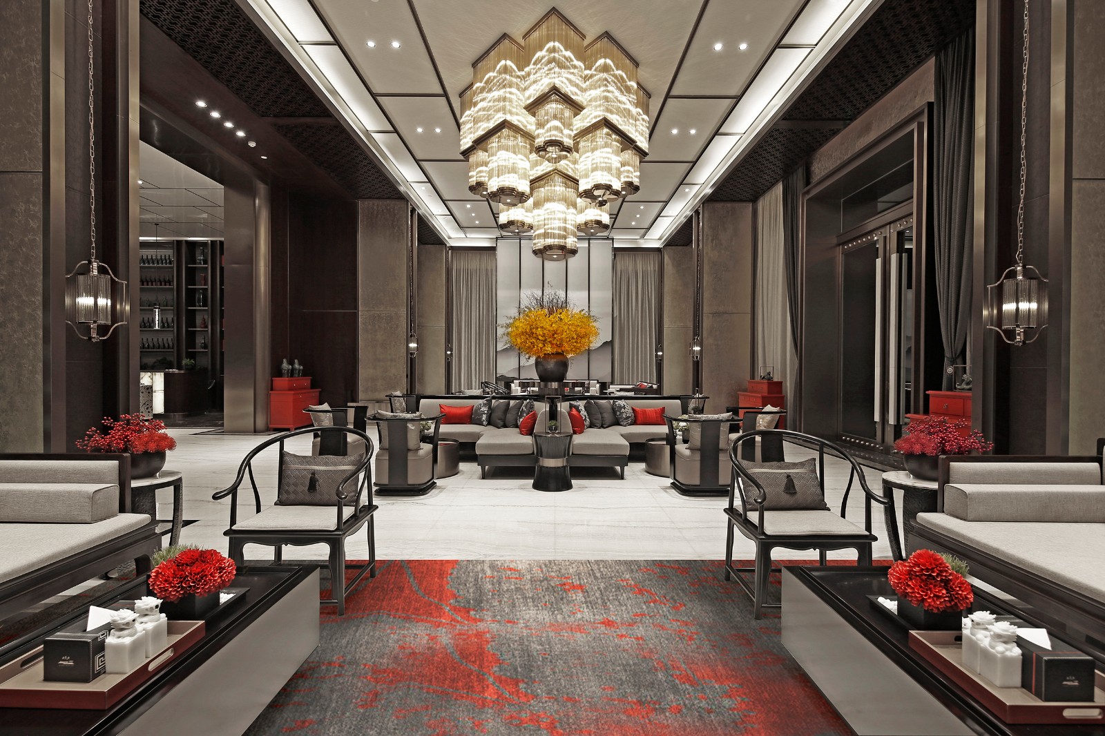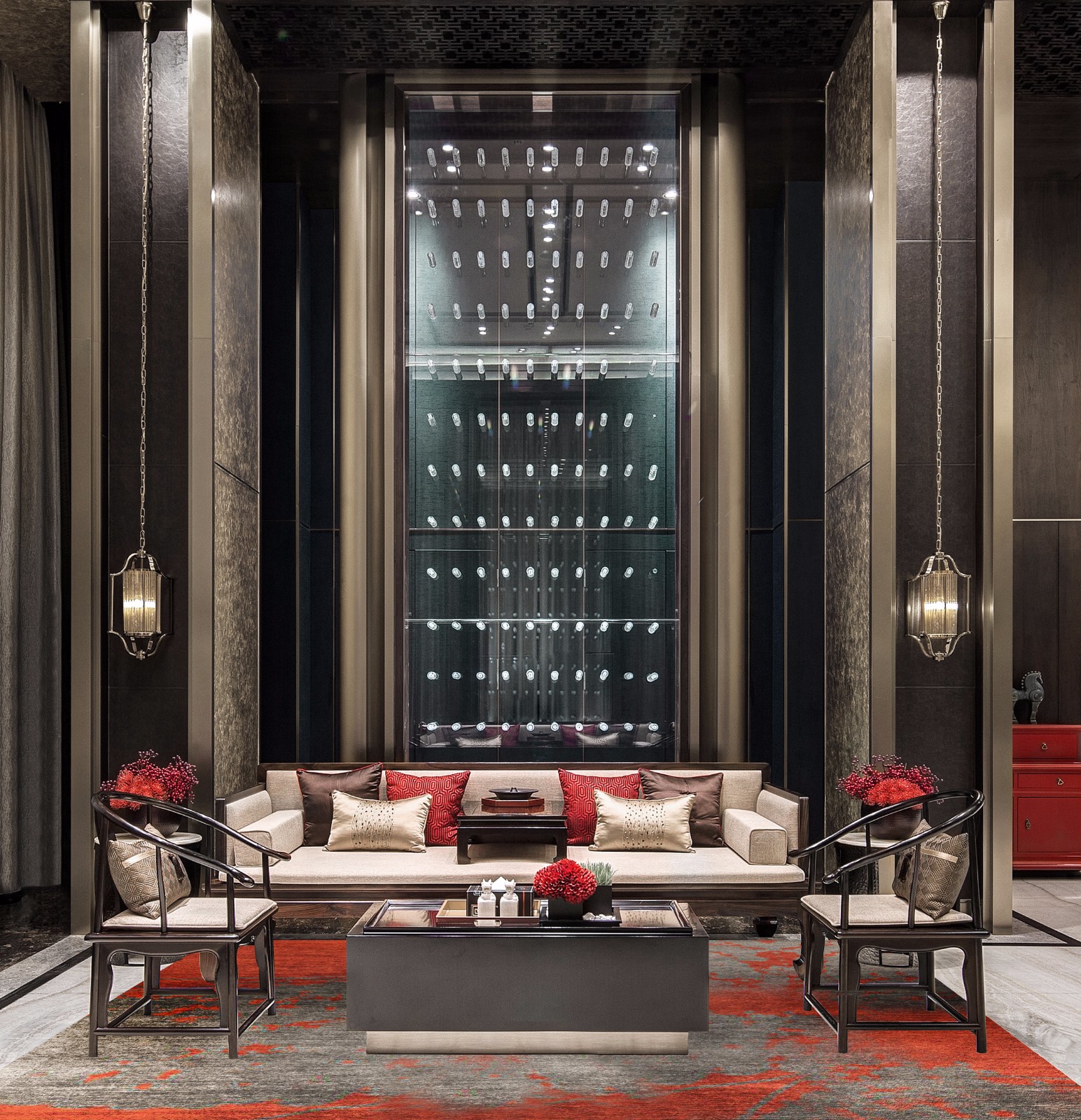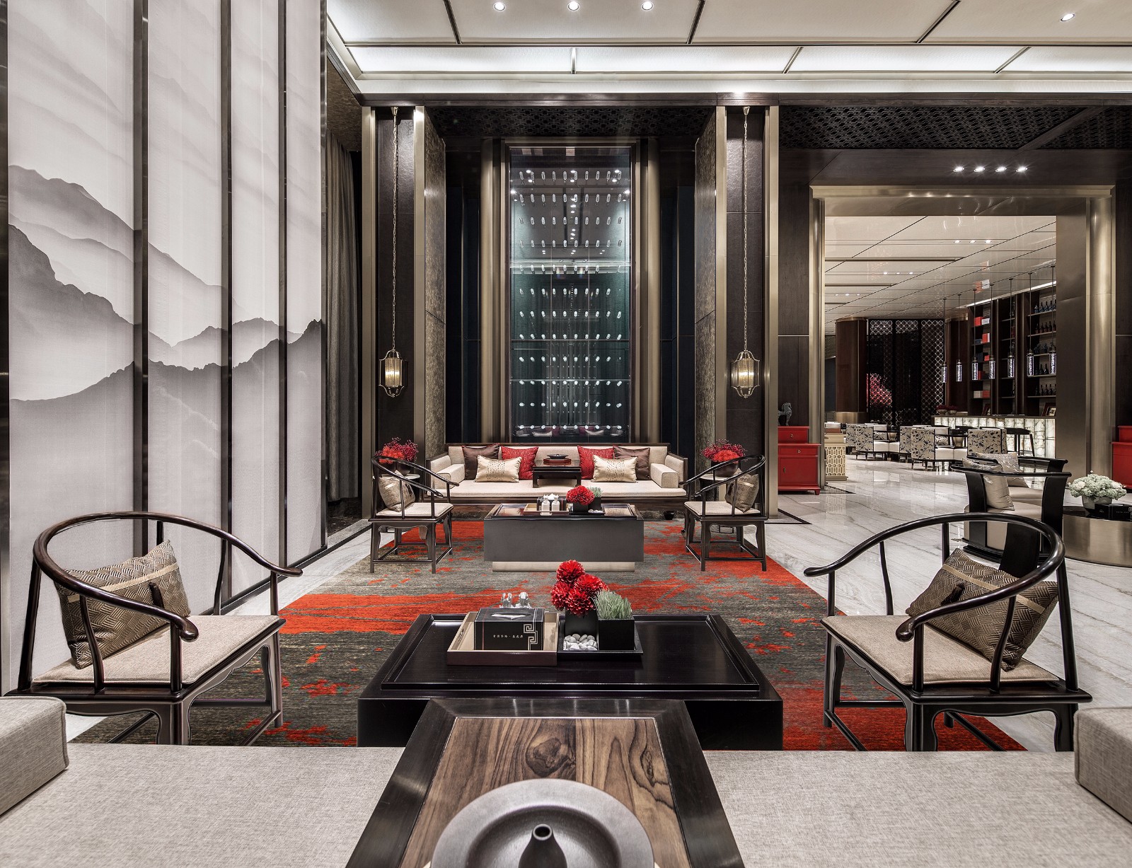 由洽谈区入内,是安静的贵宾接待空间。整个空间排布稳重而富有节奏,形成平衡稳定的视觉效果。一派堂堂皇皇中,明艳的朱红、橙红,增添了空间情韵,倏尔引发历史的遐想。
