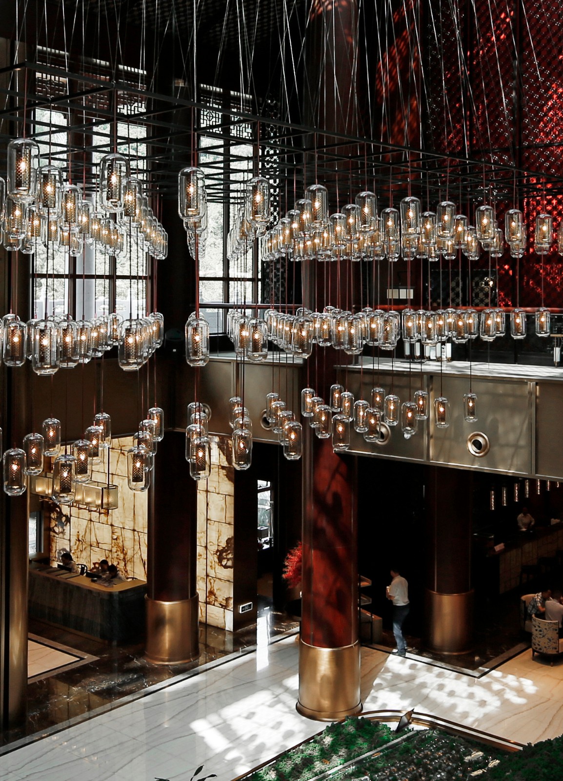 沙盘区设计借鉴了中国古典建筑艺术,恢弘庄严的空间架构,厚重的立柱形态,深厚沉着的色调,在海潮暗涌的力量中,恰如其分地融入古典的画意诗情。灿烂的阳光投射在红墙上,粲然夺目的“天灯”悬挂上空。大殿中,一览江山,谈笑间,悠然自得。在穹顶天花的处理上,设计师创造性地采用了镂空设计,蓝天白云透过细腻的古典框格,与室内空间