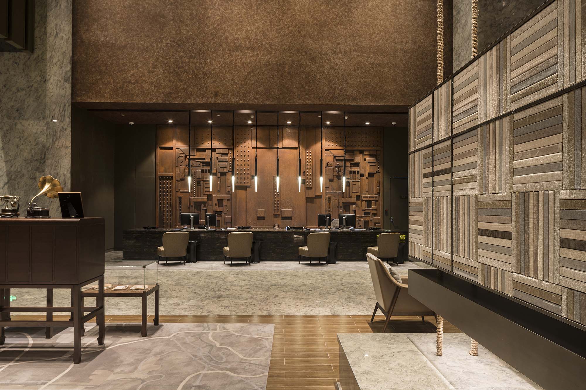 “这里有你找寻的故事,关于民国、关于文艺、关于情感、也关于‘你’”,空间设计以浓重的民国风为主,仿佛将南京城那段既美丽又心酸的绮梦真实的展现在人们眼前。在大堂的设计中,采用具有年代和历史感官的金属板组合拼接构成艺术墙,象征着民国时期坚强的爱国精神和勇于接纳新事物的态度。沉稳的木质家具,被引入空间,一点点填充,这是一种时间的记忆,安静兼顾力量。