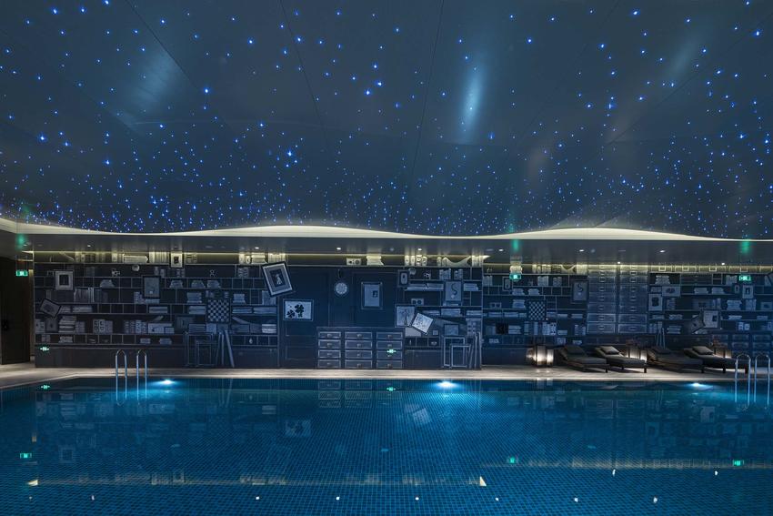整个酒店是一场空间的诗意叙事,多重的历史符号经过有序的梳理和重构,被一一展现,文化的脉络也顺理成章地依次展开。比如排列于天花之上的窗格、倒置其中的首饰盒;比如那魅惑的紫色、镂空的金属格栅;再比如时隐时现的旧画报。空间的故事性和可读性被设计的符号语言完美诠释,并用诗意的方式娓娓道来,让人置身繁华的现代都市却能在此步入一场时空旅行。