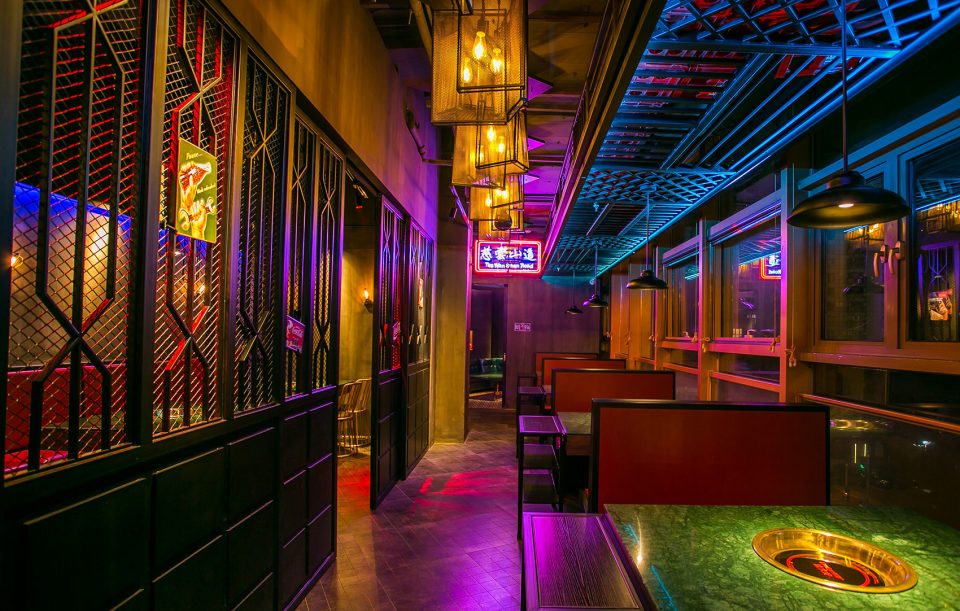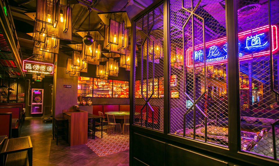 设计手法:借鉴了旧时香港的街头夜景,用于多彩的霓虹灯,复古的定制地砖,特制的铁艺造型,以及顶面开放的结构明露,诠释了香港市井的情怀,在这里你不用西装革履,不用正襟危坐。在这里你会有种王家卫电影场景中的恍惚与暧昧。