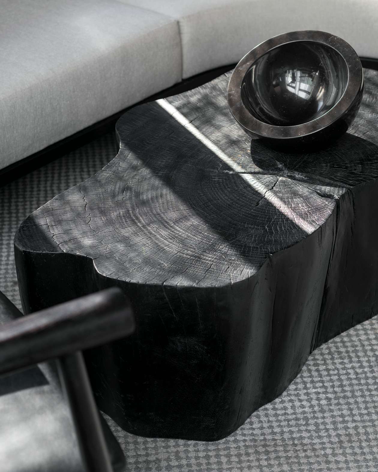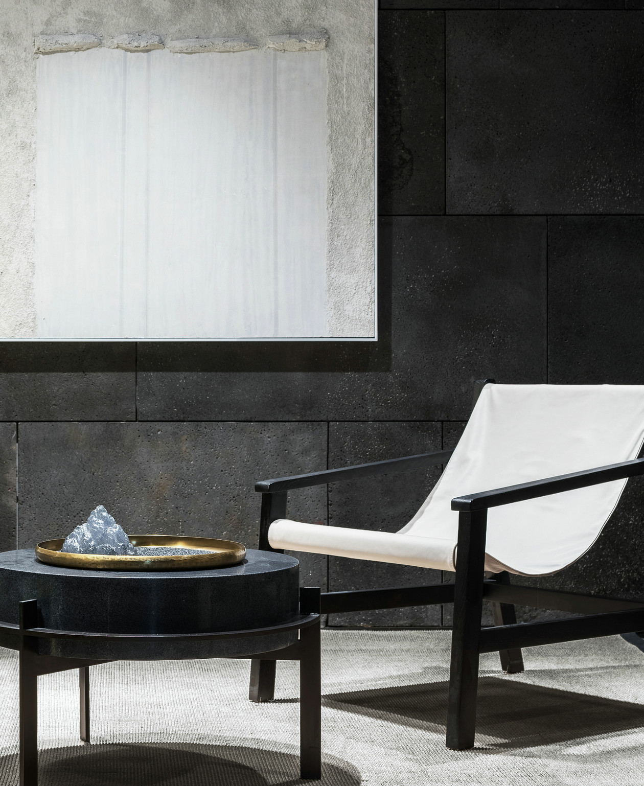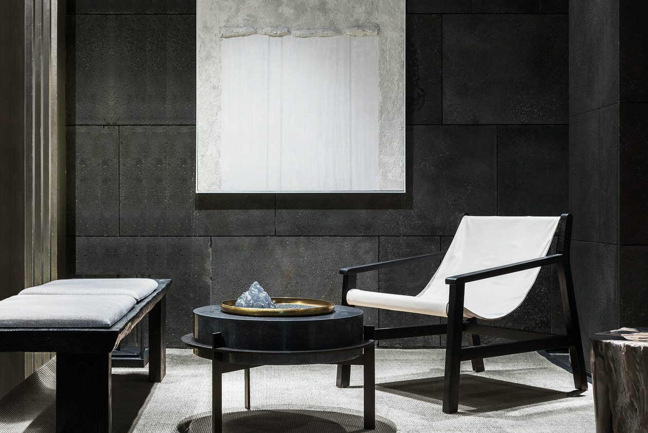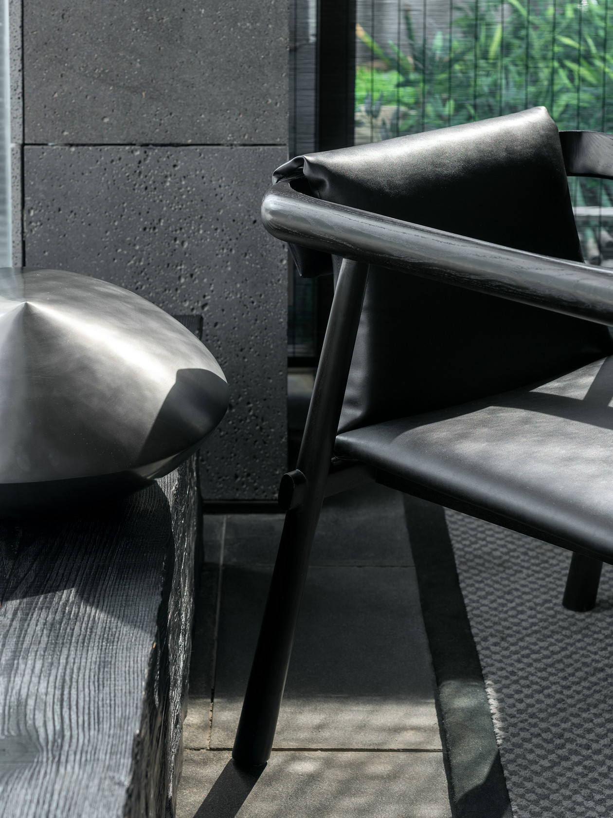 西班牙艺术家帕奇希娅·奥奇拉设计的阿勒泰椅,由黑漆榉木架构与皮革黑靠背软垫组合而成,与沉厚的树墩桌搭配组合,碰撞出新颖而沉凝的意蕴。黑白简素清雅,清水混泥土浑然内敛,整个空间禅而不寂,细细品味,方能领略细节处隐藏的奥妙。