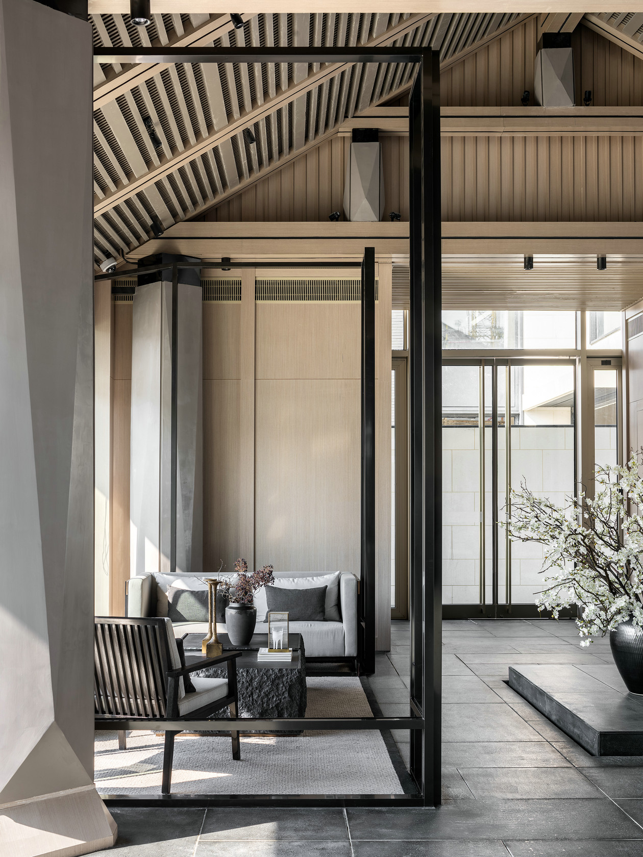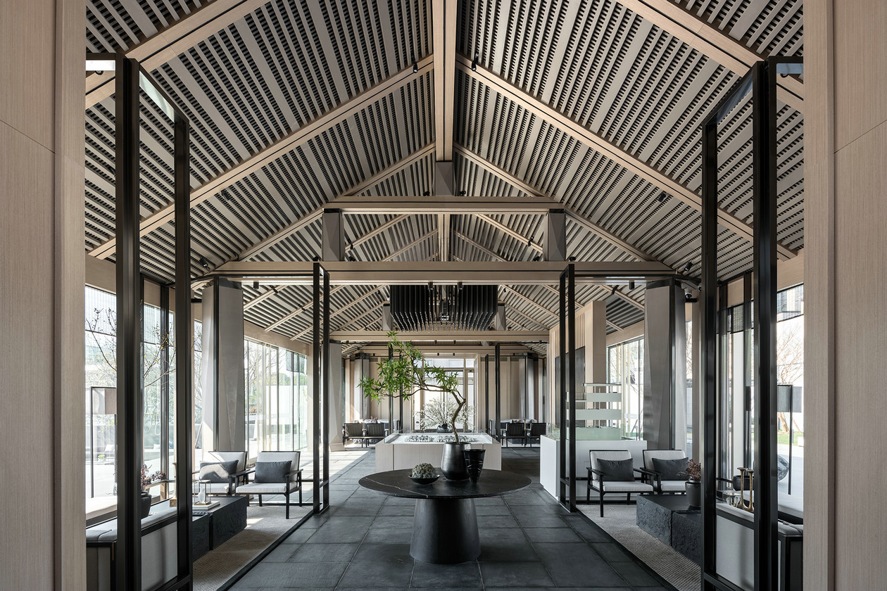洽谈区空间,人字形的挑高空间,纵向与横向线条自然组合,呈现出一个富有旋律的简洁空间,素雅的背景和装点,赋予空间谦和宁谧的气质。素雅的色彩、自然的材料、粗糙的肌理,带有岁月痕迹的家具陈设,体现一种静态的时间流逝,让身处其间的人们感受到一份宁静的淡雅和沉淀的安然。玻璃墙、通透开放的门廊设计,打破空间与空间之间的界限,让自然的气韵自由穿梭。