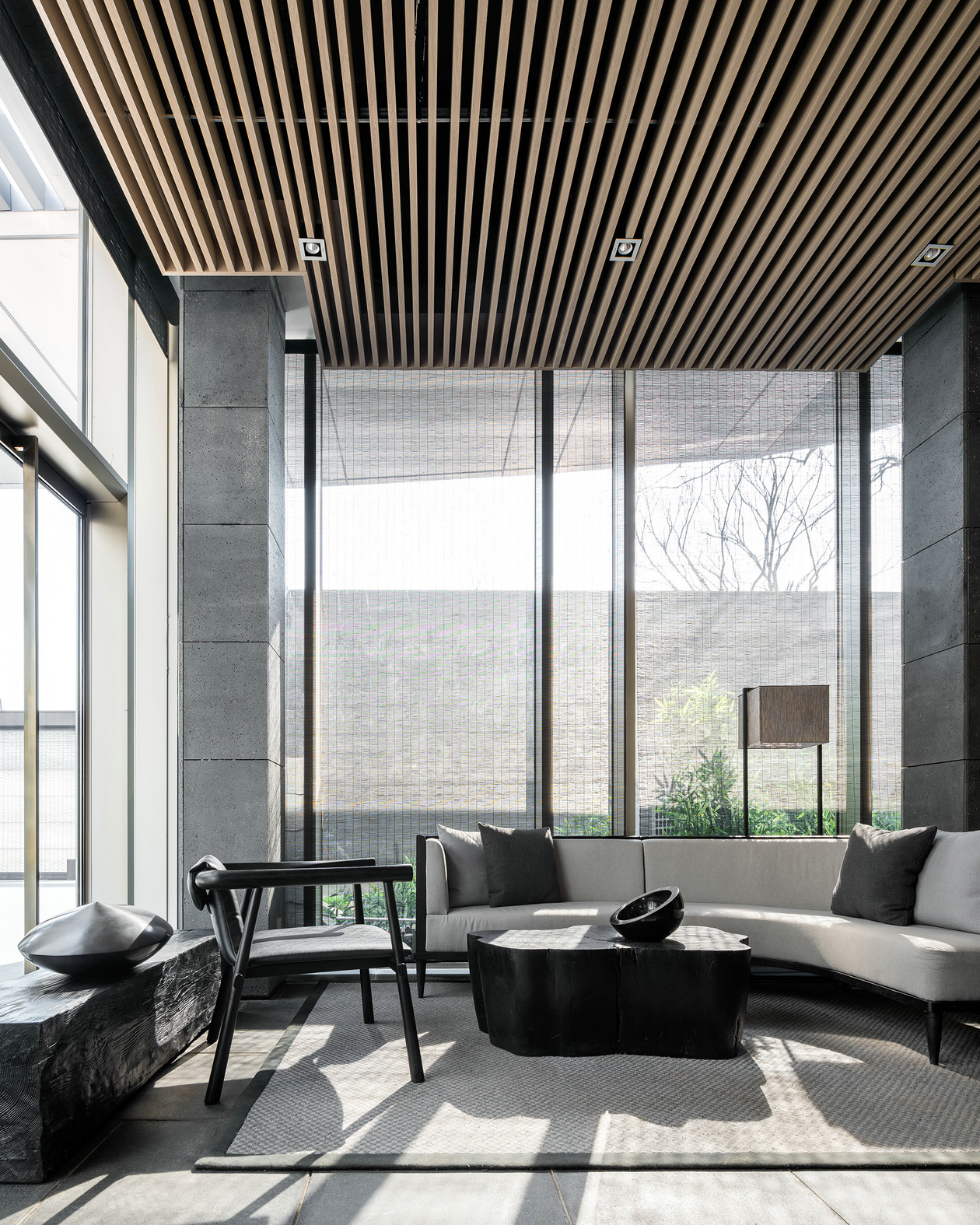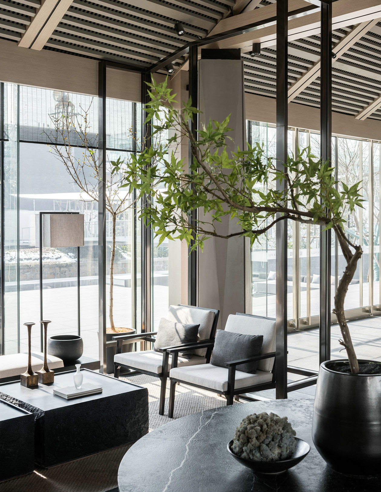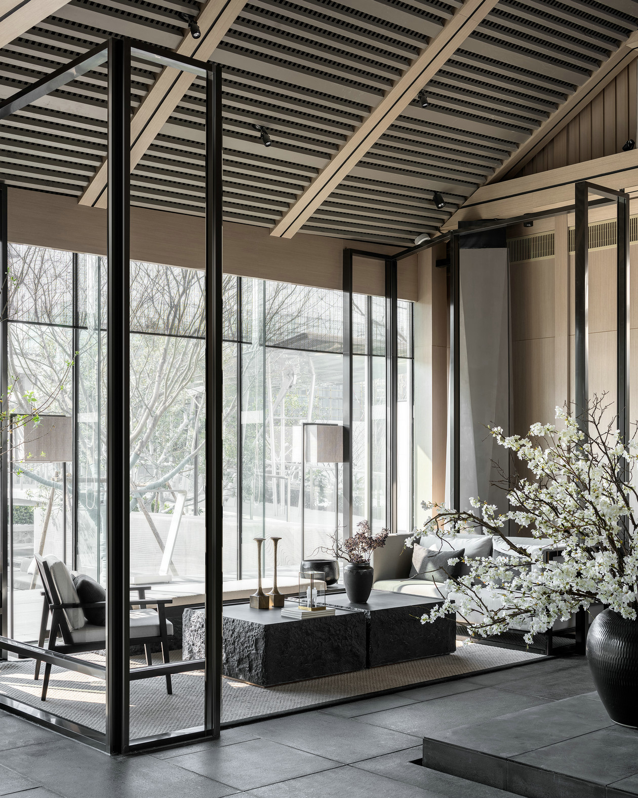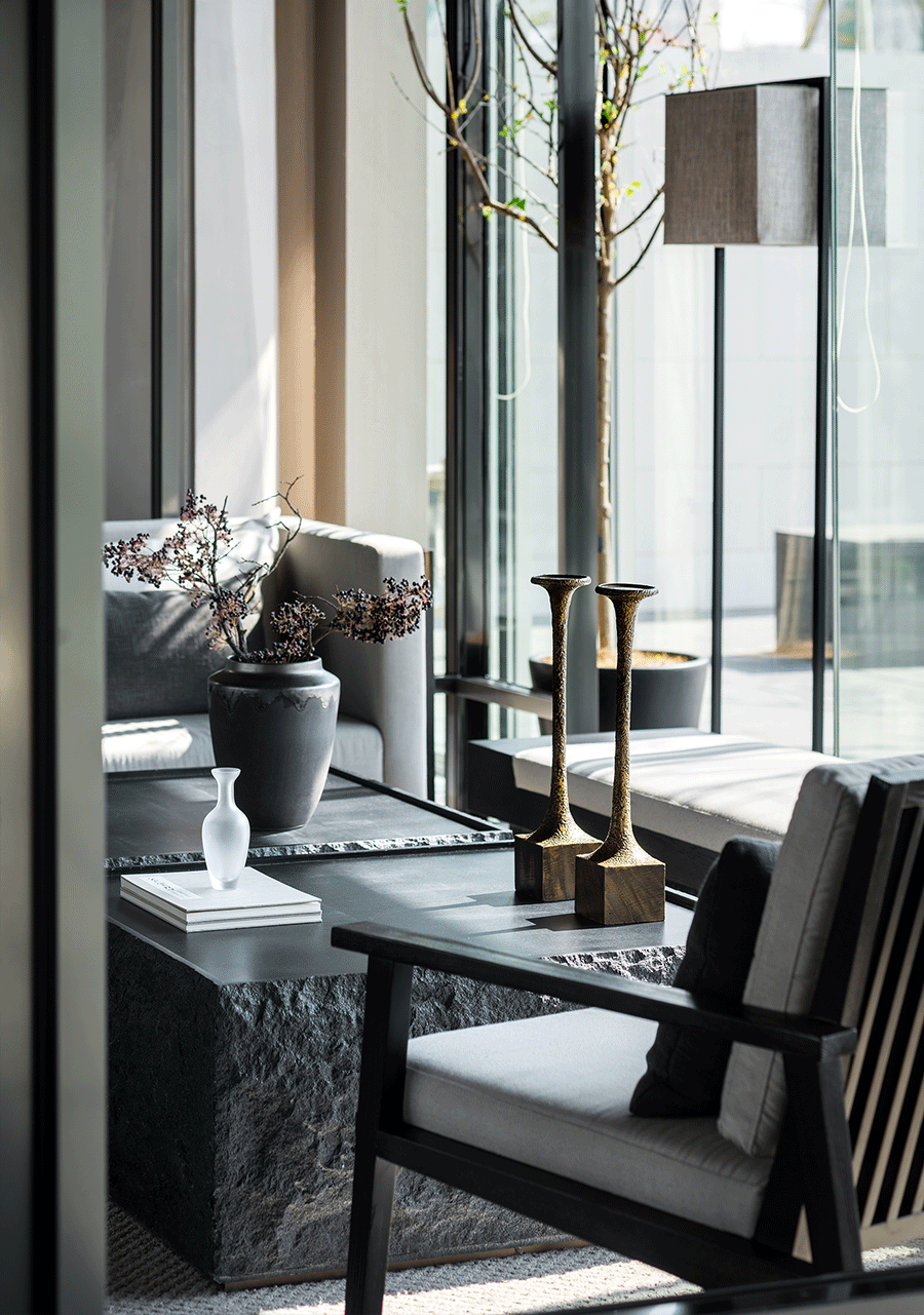 夏目漱石说:“自然力的可贵处,在于顷刻间陶冶人性情,使之醉意朦胧进入清醇的诗境,这就是自然。”株树亭亭,花枝轻软,花木就是天地写就的诗篇。那份自然沉静,在石材和原木的质感烘托下,那种无惧岁月的涵容,正是贯通空间内外的气质。