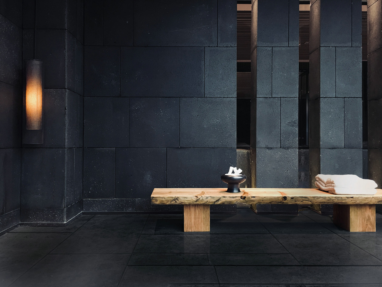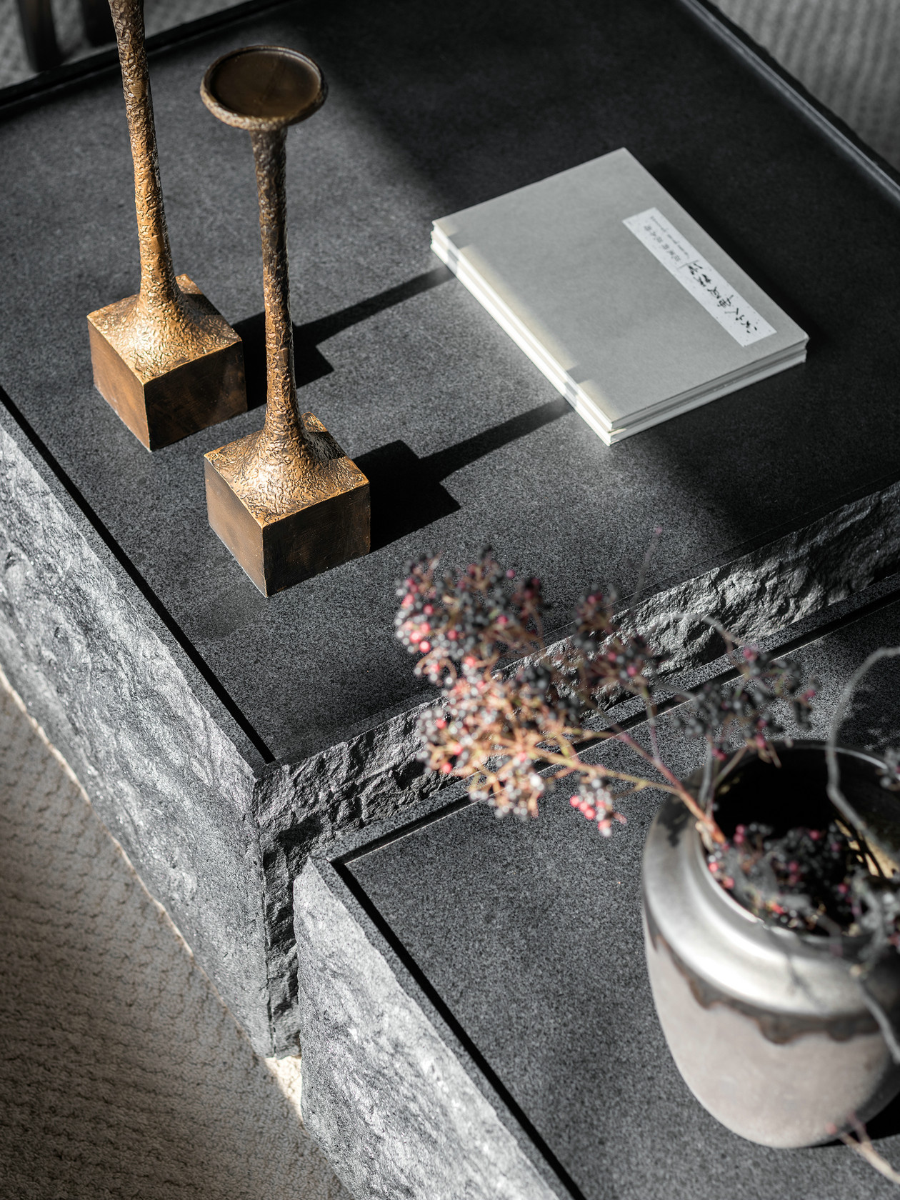 预接待区设计清雅低调,回归空间自然质朴的天性,低调而真实的肌理变化、沉静清淡的色彩,让整个空间的氛围显得舒适放松。设计通过材质与质感的对比、器物的语言,隐喻了“少言、行远、去杂、至巅”四种富有禅心雅韵的人生境界。