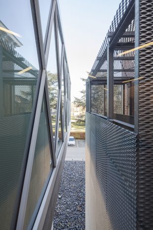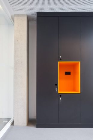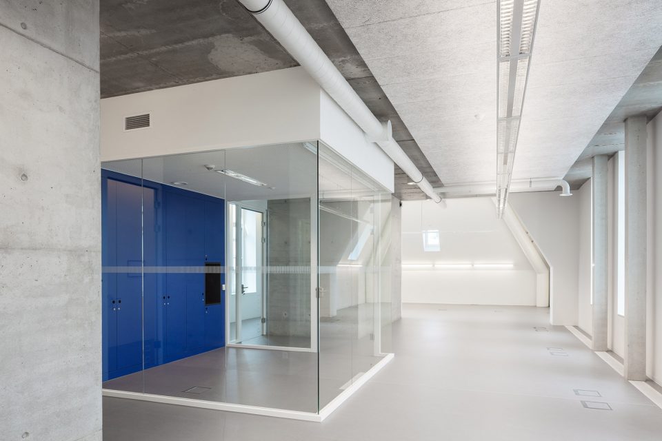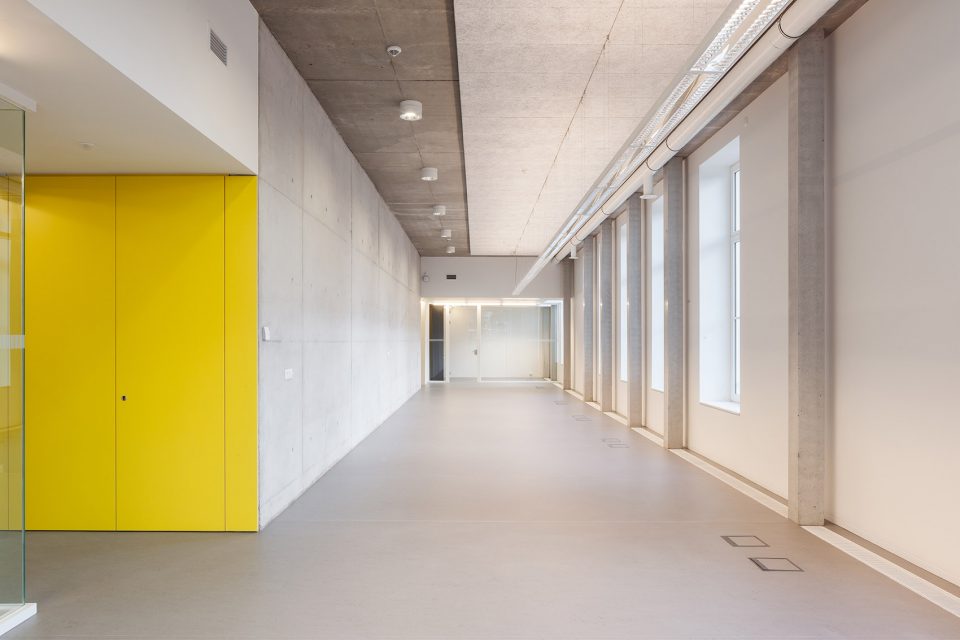 附加的建筑部分采用了混凝土和玻璃作为基本材料。除用拉伸钢材作为第二条紧急逃生楼梯的外部结构外,设计师还用这一材料对原建筑中建造于60年代的电梯井进行加固与装饰,以彰显这两部分的不同。