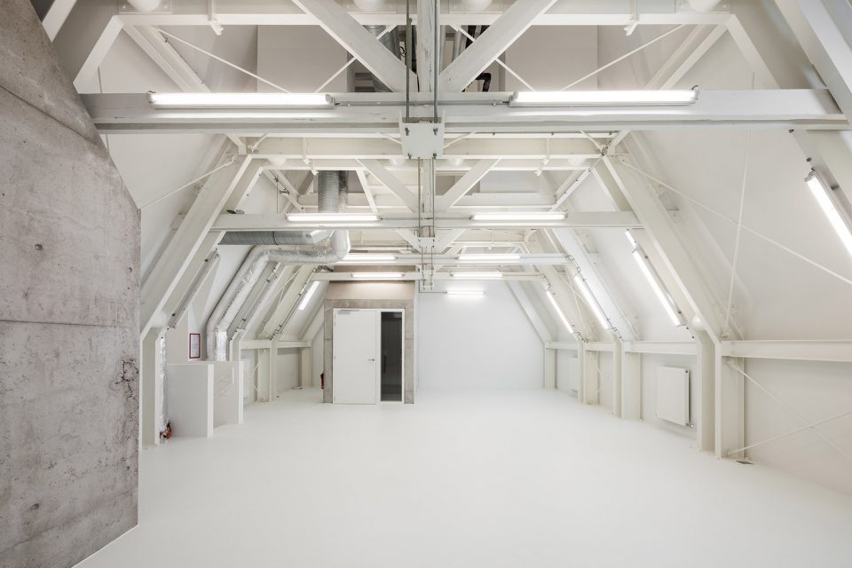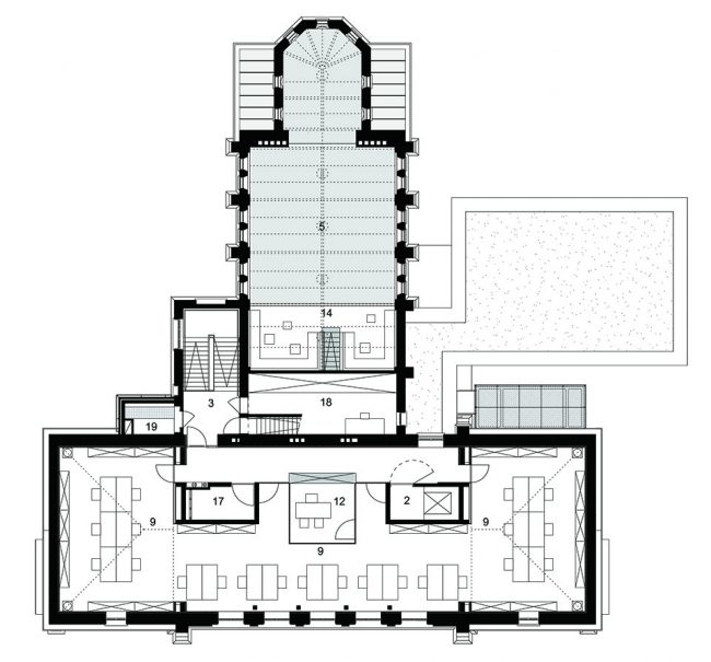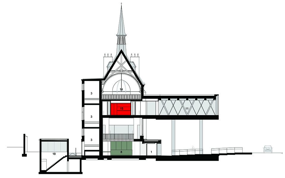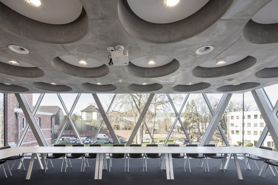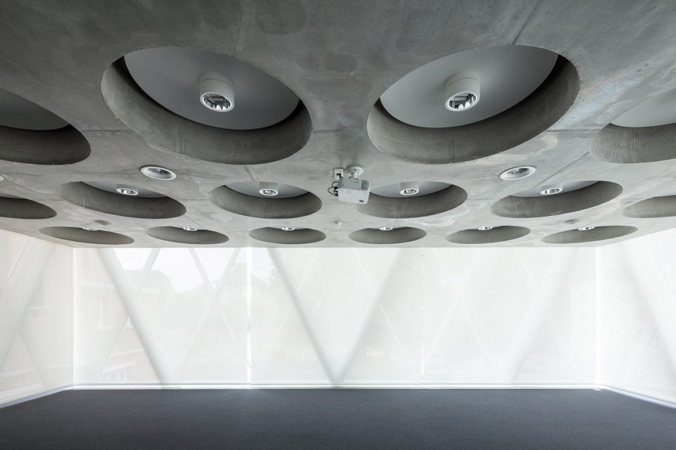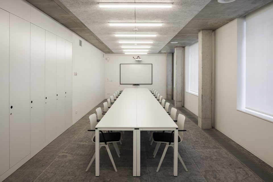 此次改建仅保留了建筑的外貌,在内部嵌入了全新的柱式和楼板。并尽最大可能将混凝土结构、天花板和柱式暴露在来访者面前。与此同时,附加于三层两侧,用于支撑四层档案室的钢结构也被暴露在外。新置入的多功能会议室外立面全部由玻璃幕墙铺设。这一外立面的结构设计灵感来自于礼拜堂的玻璃花窗。礼拜堂的花窗拥有钻石的形状,而这间多功能厅的玻璃幕墙、天花板和隔音墙恰好映射了这一钻石形状。位于天花板上的圆形凹槽则是为了节省对混凝土材料的使用。