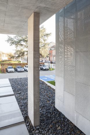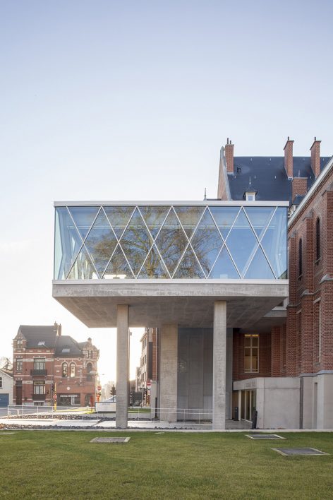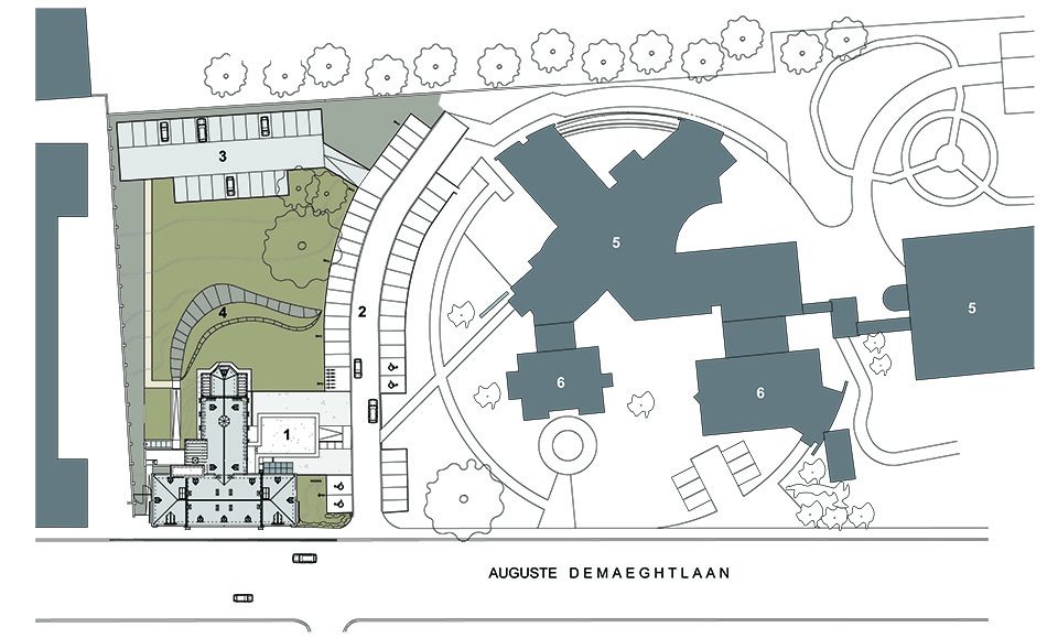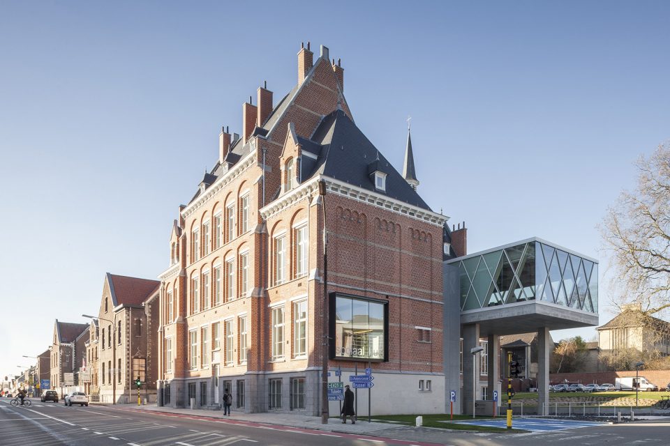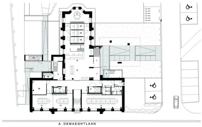 2008年,WAW赢得了由OCMW Halle 和 Flemish Government Architect组织的建筑竞赛。该项目旨在通过最低限度的空间介入,令这栋始于1900年代的Old Orphanage众多外部历史特性得以保留。应客户要求,全新的Social Welfare Office需与相邻的OCMW场地之间建立良好的视觉联系。为实现这一目标,设计师在新大楼右侧毗邻停车场和OCMW的建筑立面嵌入全新的公共出入口,悬挑于新入口之上的附加结构是建筑最引人注目的部分,时刻提醒着人们入口的所在,该部分体量被用作多功能会议室。原有的临街建筑入口被保留,但如今它仅作为仪式性的出入口存在,从此处进入,来访者也可抵达前侧会议室。