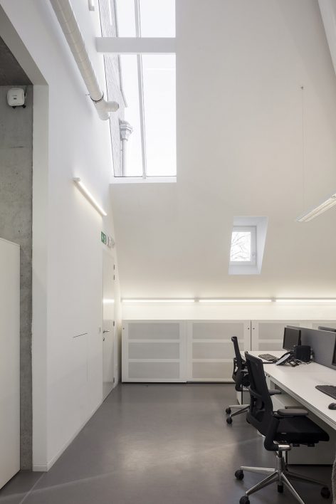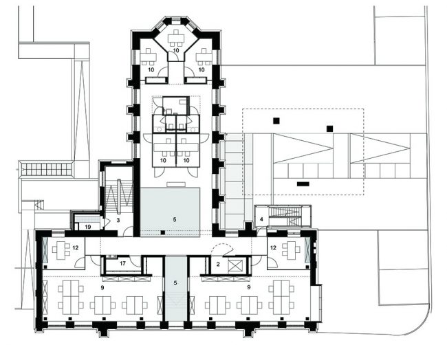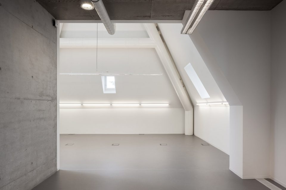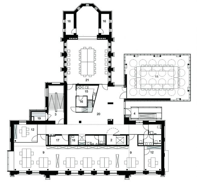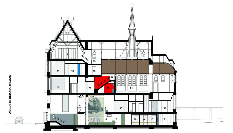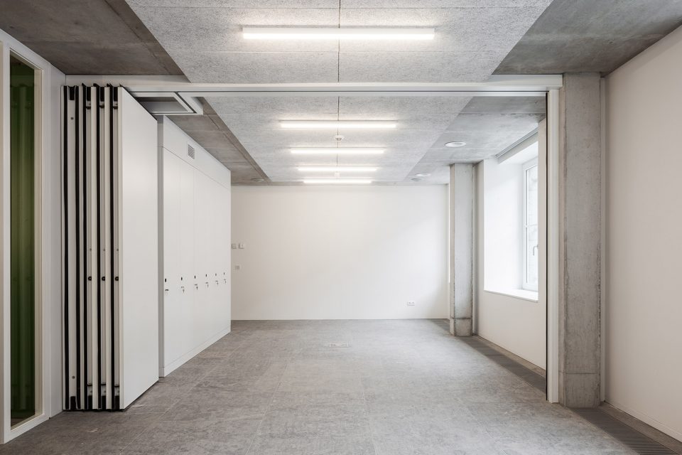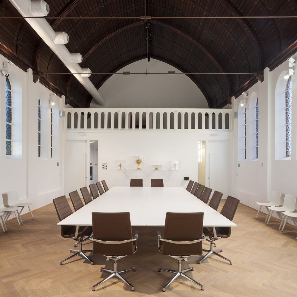 位于一二三层的办公空间维持开放的特性,只有部门主管的办公空间拥有封闭的玻璃围墙。新嵌入的多功能会议厅两边设有休息室和小厨房,而同样位于二层并与之相邻的礼拜堂,则被改造为OCMW委员会议会厅。礼拜堂的氛围是封闭而亲密的,而多功能会议厅的氛围则恰恰相反。与其他办公大楼不同,该建筑的档案室并没有设置在地下层或地面层,而是位于阁楼顶层。