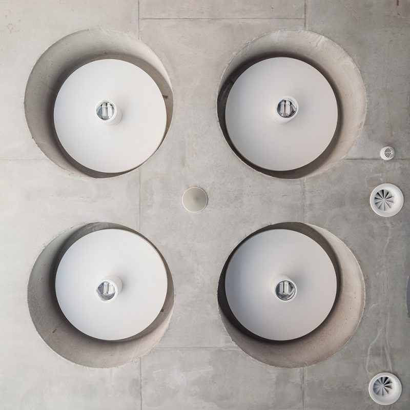 一个开放的建筑空间对隔音效果有严格的要求。开敞的办公室和会议室的天花板均安装了隔音板,此外办公室内部还特别安装了带有滑动隔音板的家具。在大型多功能会议室中,两个隔音板采用方格形图案,呼应了礼拜堂和多功能会议室的花窗。除集成照明系统外,多功能厅的内凹混凝土天花板内还嵌入圆形隔音板。