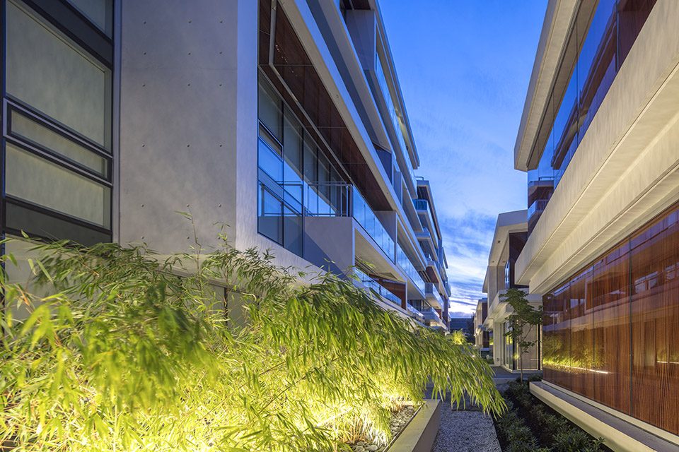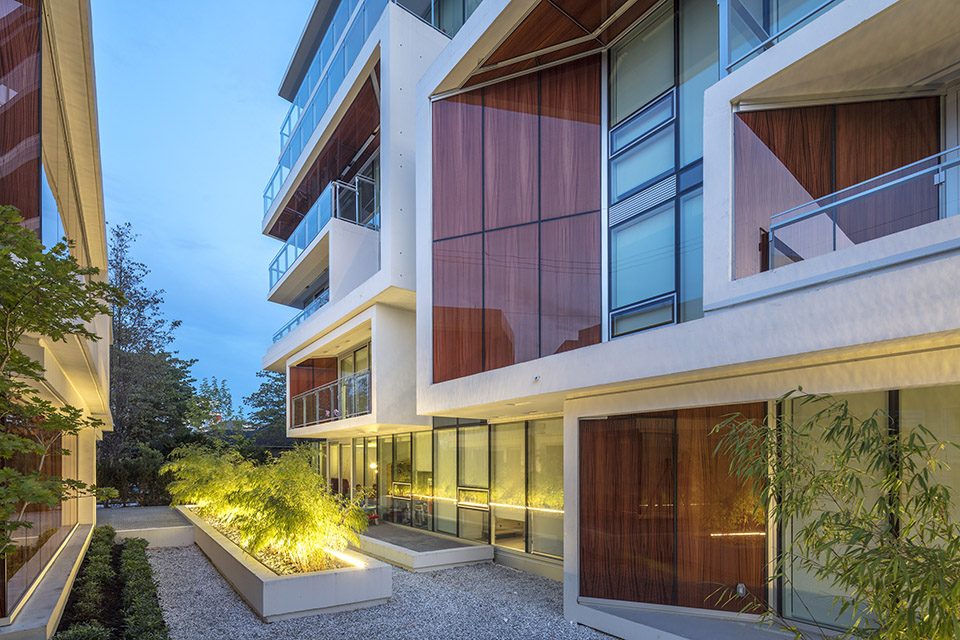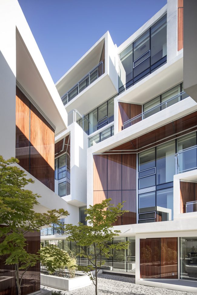 项目街区于流水花园与竹林小院处一分为二,让光影在建筑间折射留存,为居住生活营造明亮的空间环境。由一室公寓到带有车库的三层独栋别墅,该混合居住项目的内部多样性呼应了周边社区环境。层次分明的建筑外形呼应了中世纪的都市建筑风格。巨大的悬臂平台和水平线条强调了建筑的轻盈之感,弱化了庞大的建筑体量。