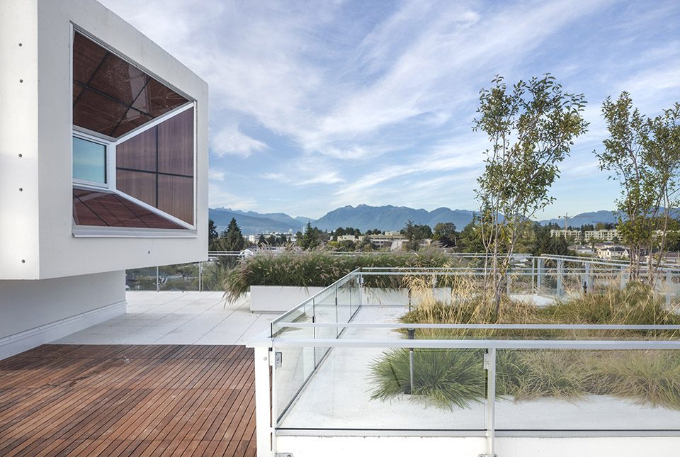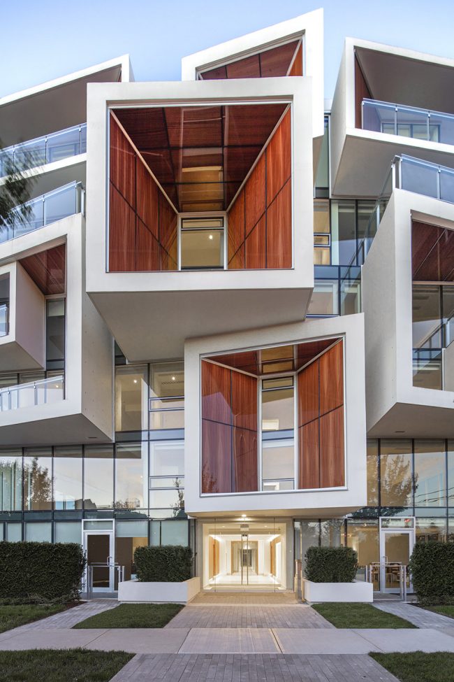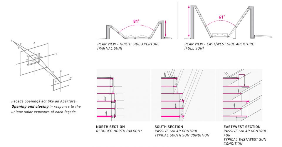 外立面悬挑为建筑提供了被动式遮阳,外悬的独特结构如同光圈一般,随着南北立面的光照条件,该光圈结构由深邃逐渐变浅,以对不同立面的光照效果做出回应。该建筑以 LEED金级为建造标准,采用高性能暖通空调系统,低流量装置及高性能建筑外围结构。雨水收集与排放系统设置于屋顶之上。