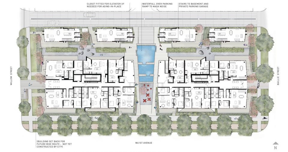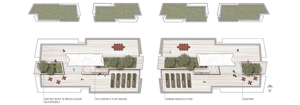 该项目回应了环公共交通站地区的公共通行网络延伸,及营造步行交通网络的愿景。在与当地社区居民的交谈和对定向群体的调研结果均显示,该混合社区的理想居住人群为寻觅第一套住房的年轻人,和探寻亲密社区的空巢老人。对年轻的购买者来说,小户型更受欢迎,且每栋建筑的屋顶露台增加了居住者的社区融入,同时为居住社区营造了城市农业和儿童游乐场所。对空巢老人来说,他们更关注社区的无障碍设施。在该居住公寓中,宽敞的门房和浴室为轮椅提供了无障碍通行环境。而联排别墅的内置电力井道空间及可拆卸面板,让居住空间具备容纳小型升降梯的可能性。