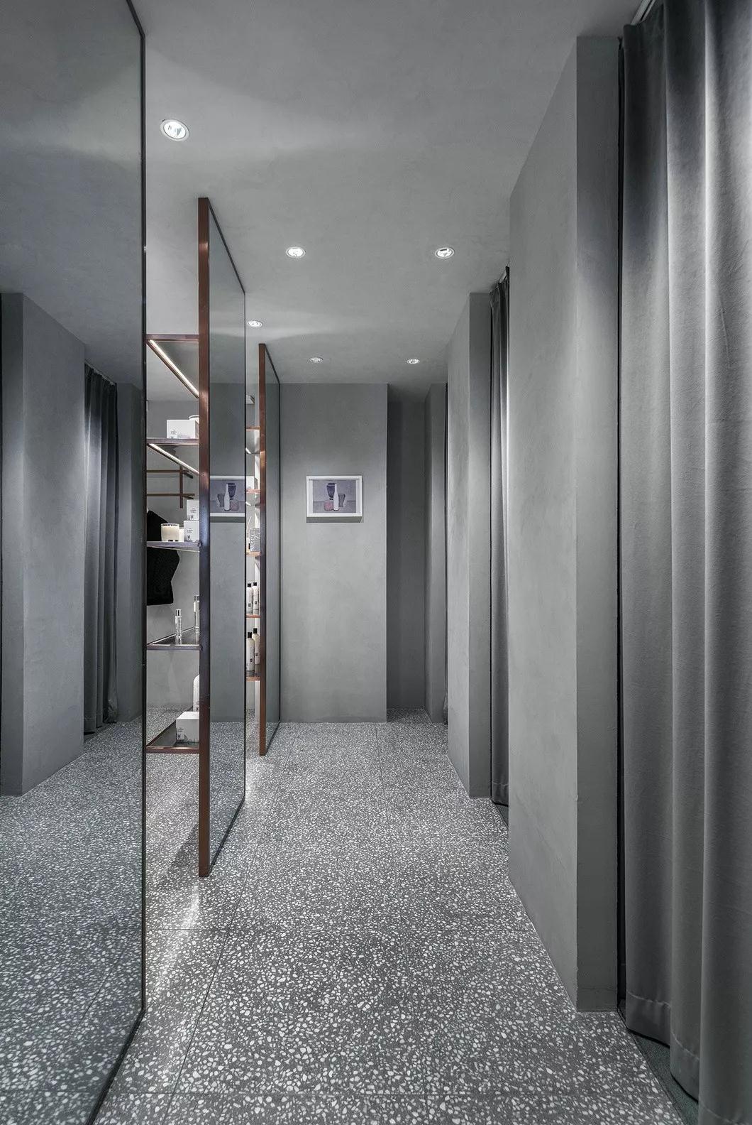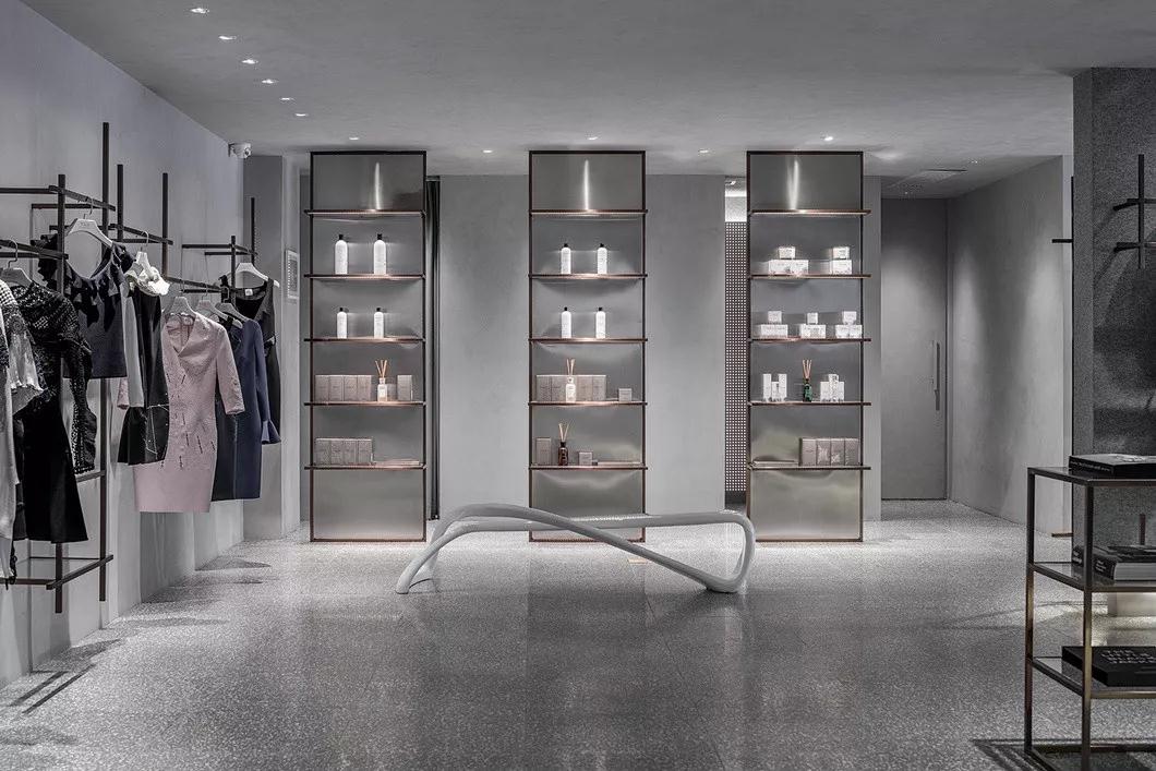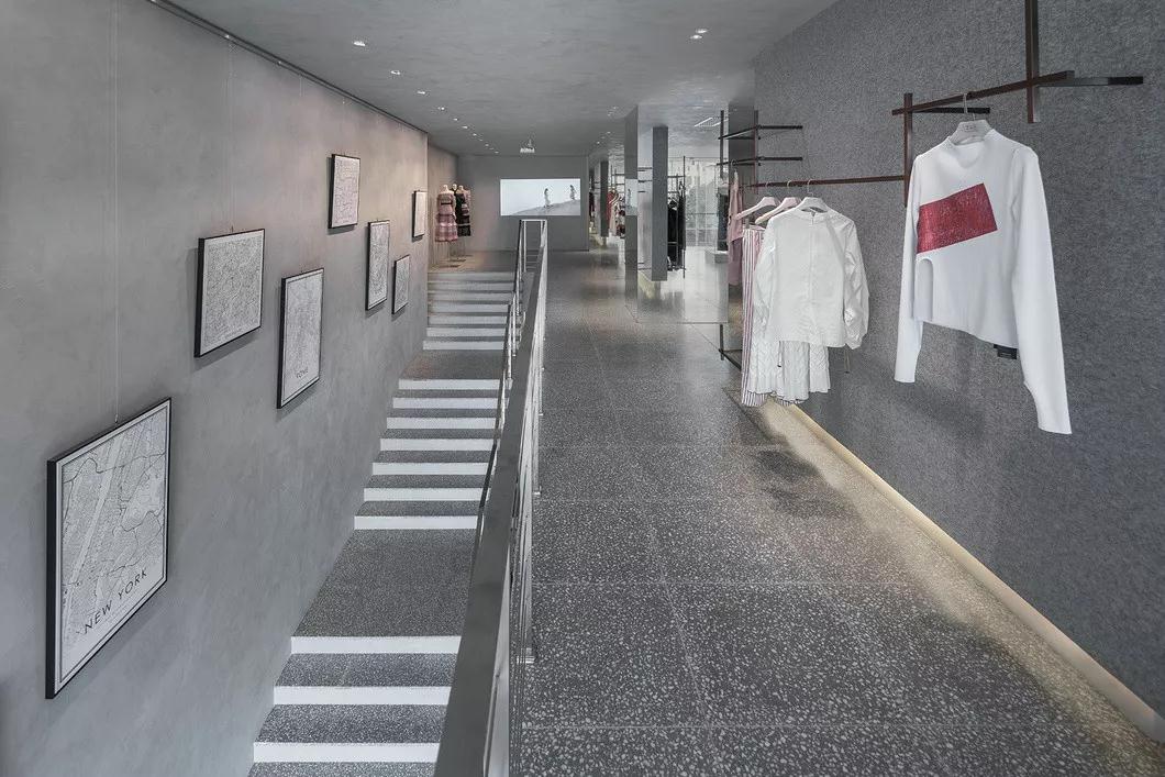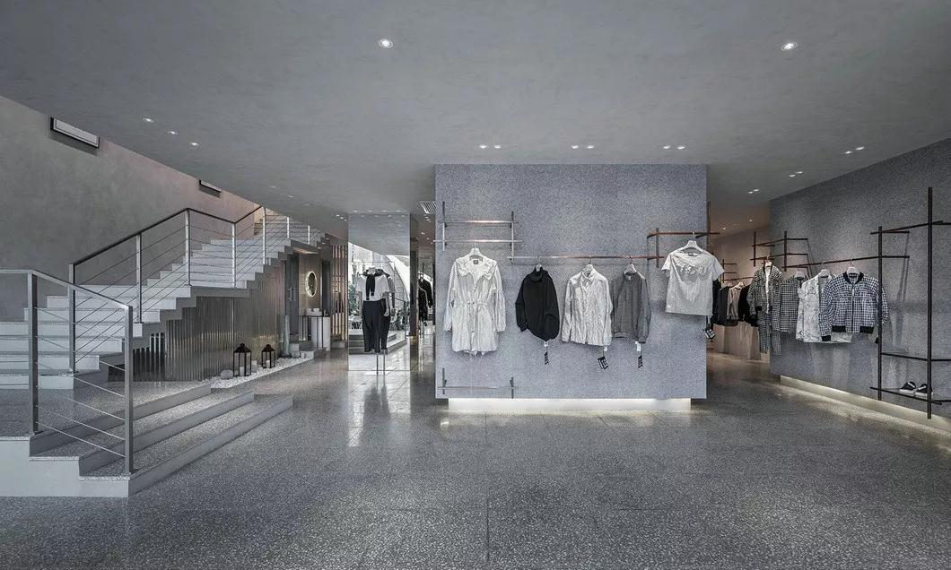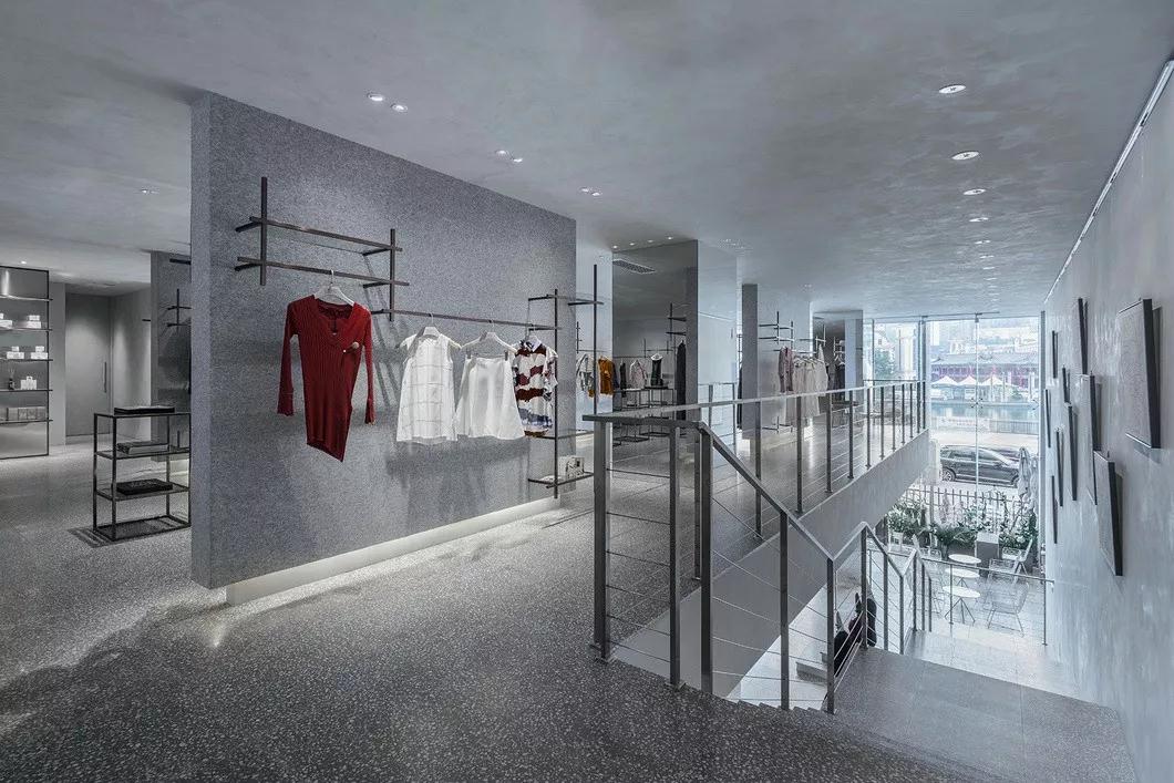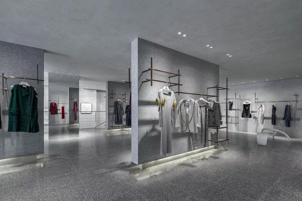 在自然光和人工照明的配合下,这个灰色的空间透出淡雅宁静的气质,犹如莫兰迪的画,静谧而迷人。同时灰色“艺术馆”空间所具有的仪式感和神秘感,使得陈列其中的商品获得了艺术化的升华,增强了设计师服装的品质感,有效的提升了人们的购物体验。
