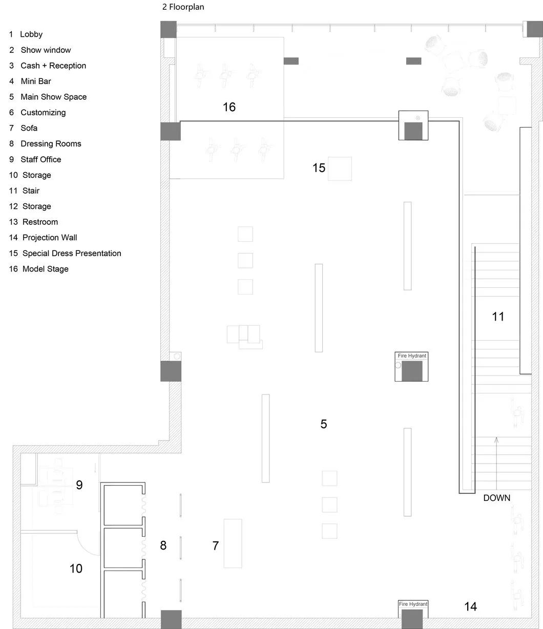 TAG是一个多品牌的融合空间,售卖男、女装及配饰;风格上既有正式礼服,又有街头风潮衣;既有走秀需求,又有咖啡吧。头脑风暴中我们找到一种“比拟”的空间修辞,通过它,TAG的设计雏形便清晰可见。