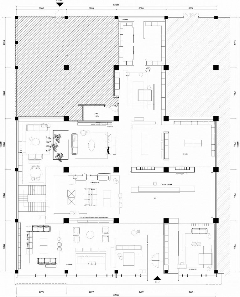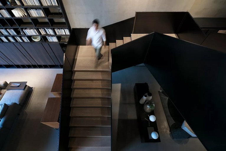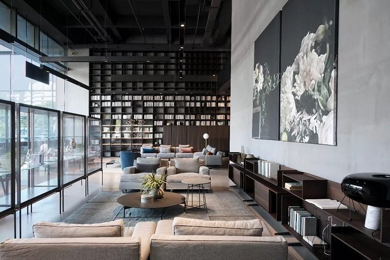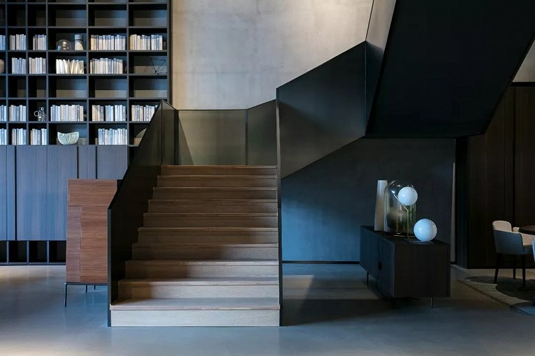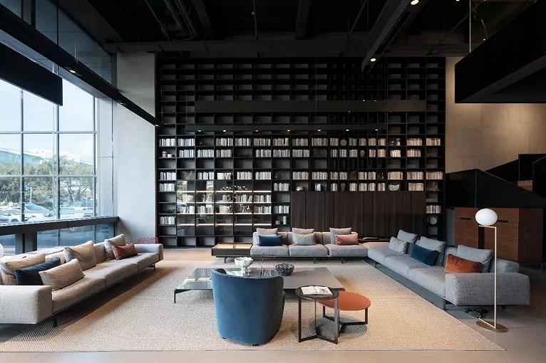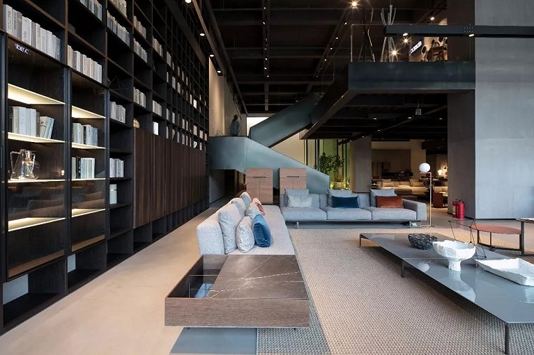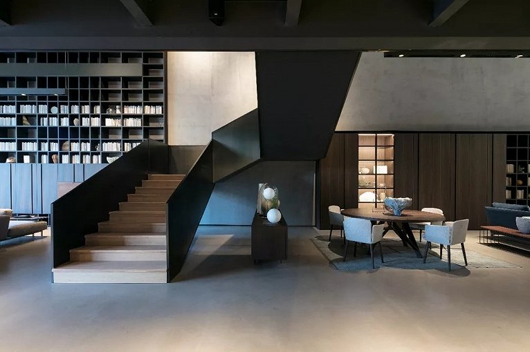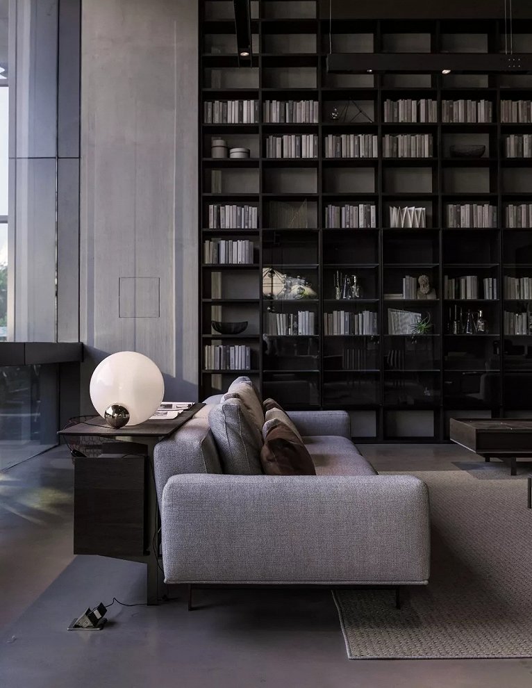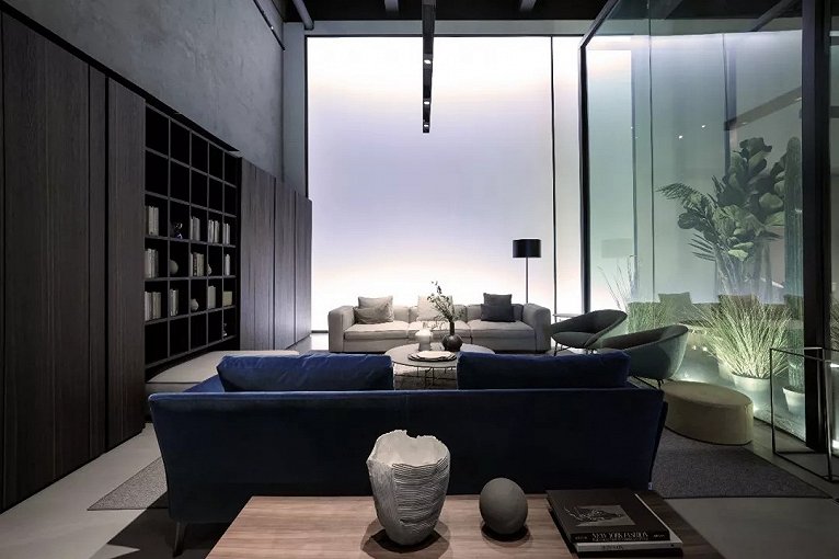 挑空空间特别给LEMA精致的的书架系统和大客厅家具以充分的展示舞台。对现代豪宅的尺度与氛围的无限想象就在这样的场景下激发。
