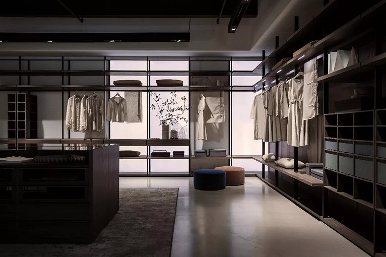 廊桥之下的延展空间,让更多尺度的家具在层层的小序列中平行展开,更有专属的衣帽空间展区,让家具品质下的优雅生活悦然眼前。