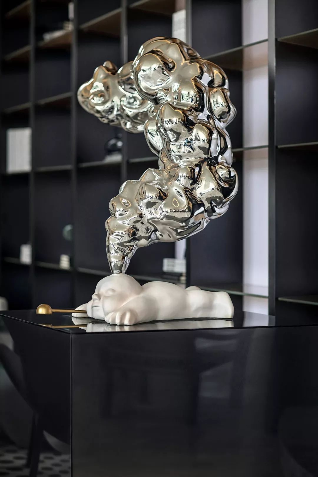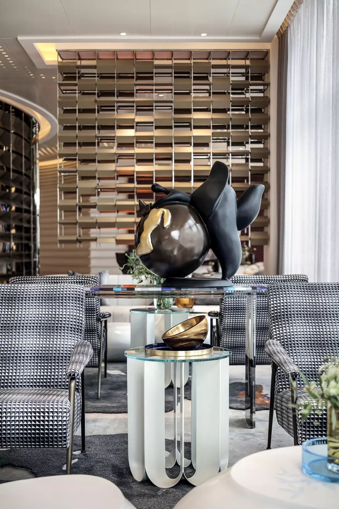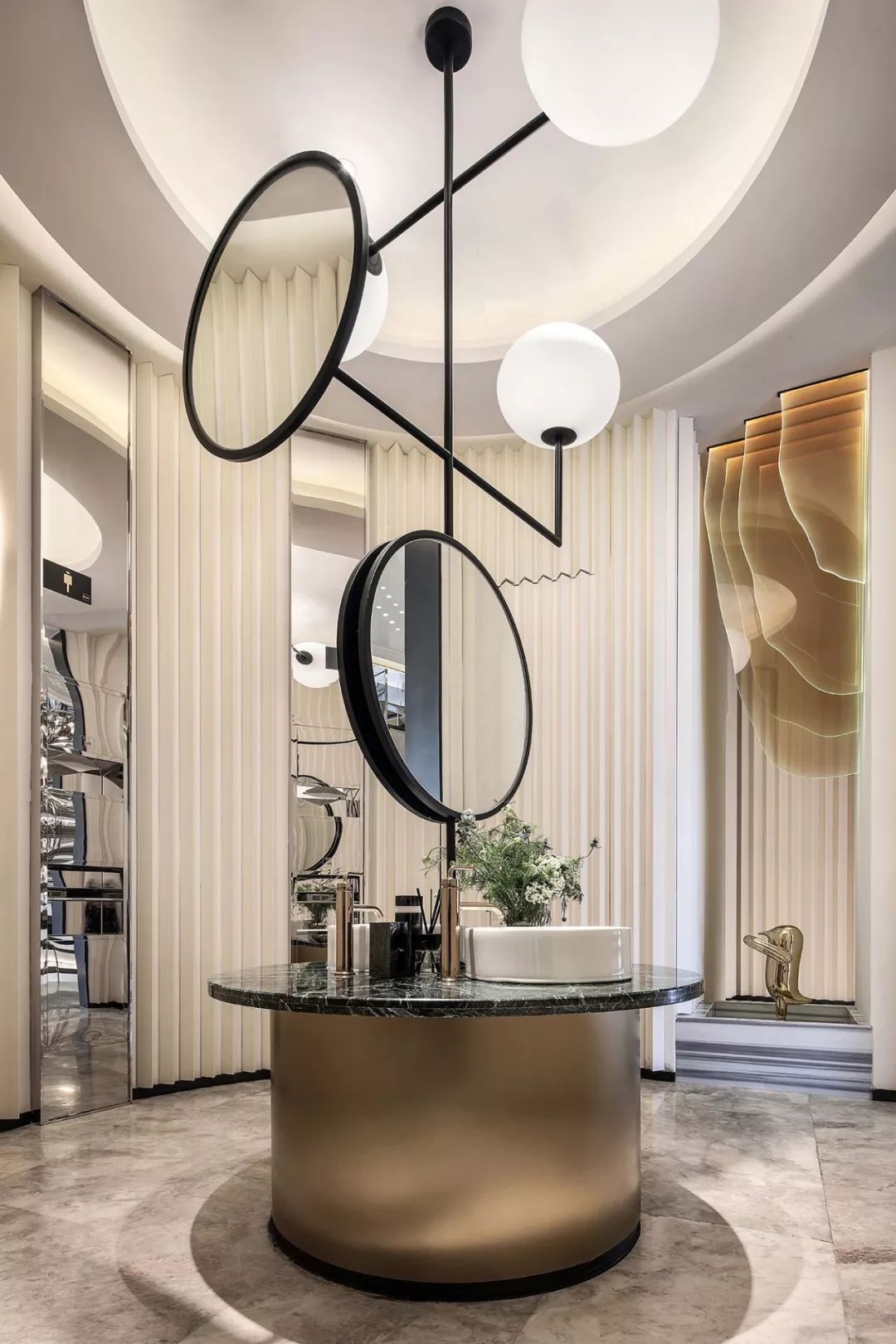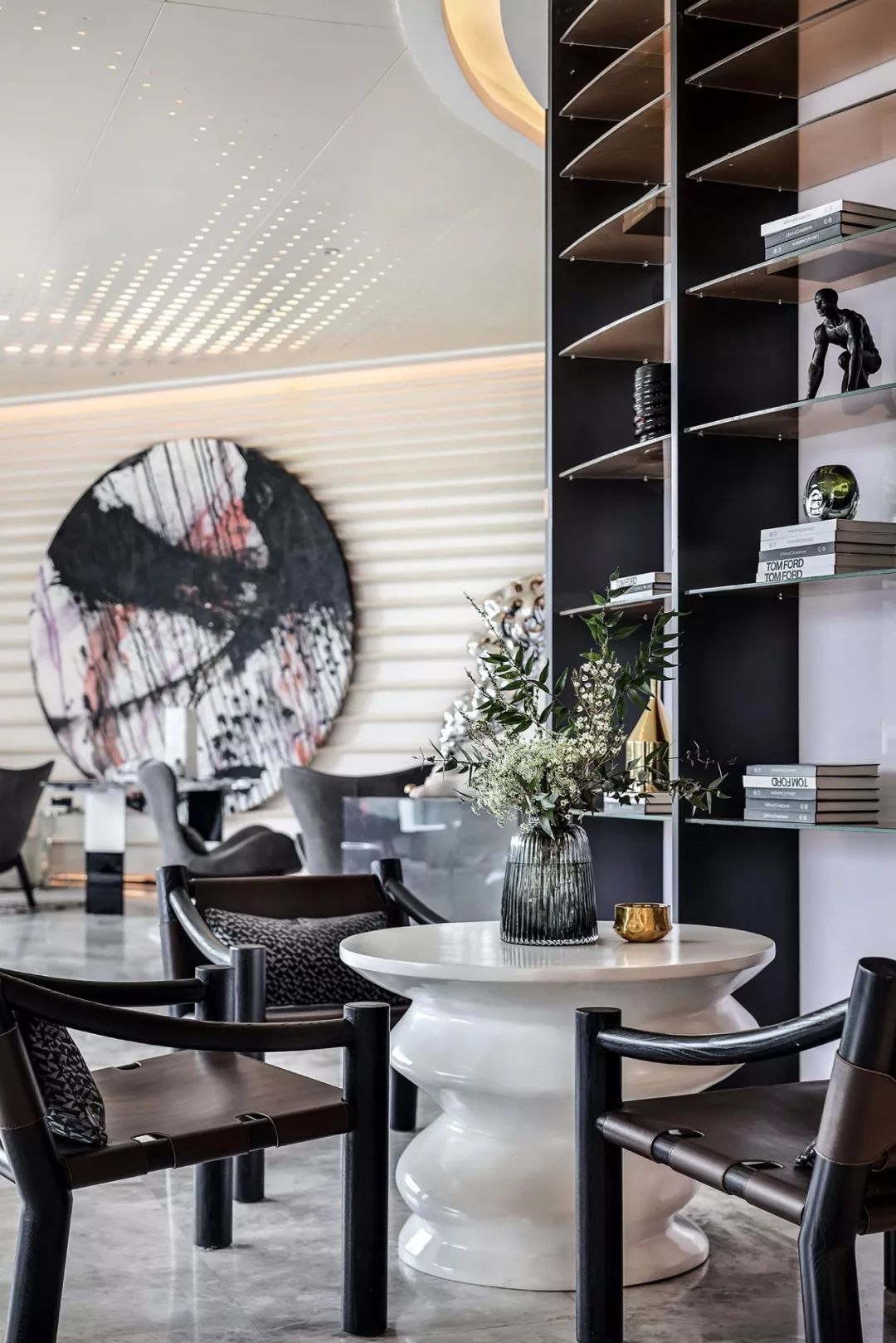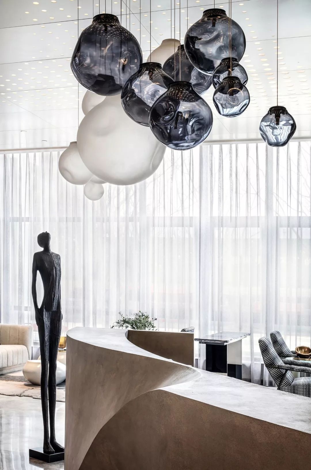 艺术雕塑立于吊灯之下,仰望场景的思考,是软装情景带入感的表现,更是室内美学思考的高级营销手段,这也是艺术运用商业空间的非凡意义。