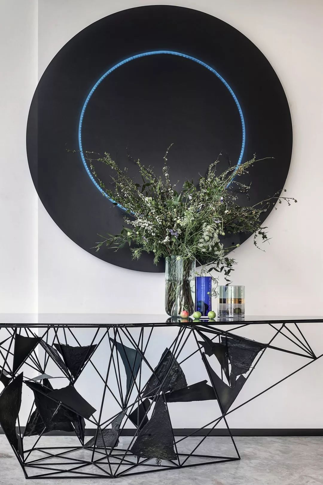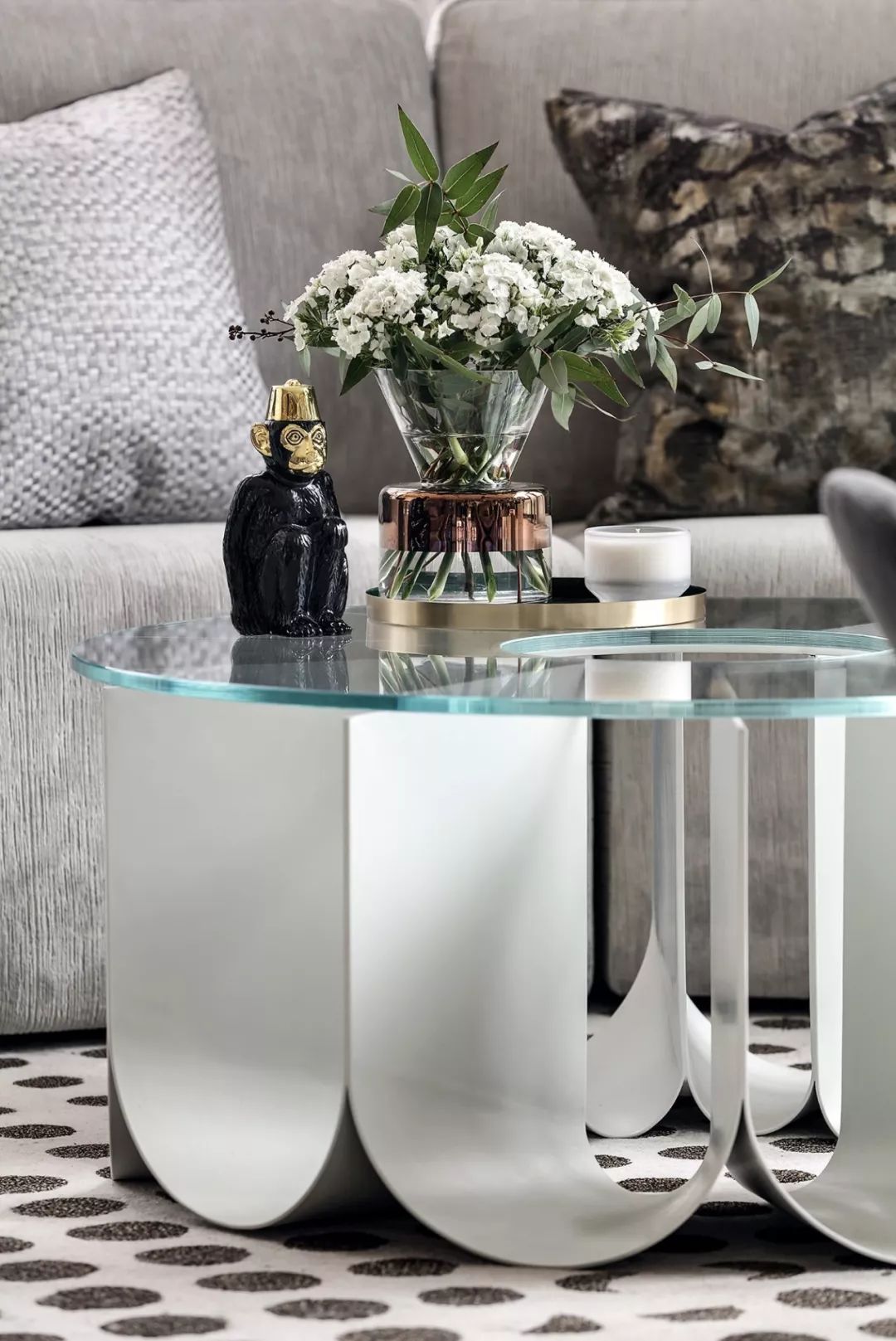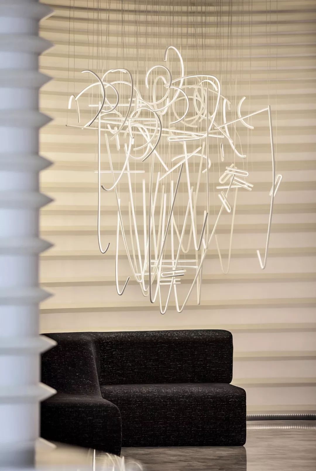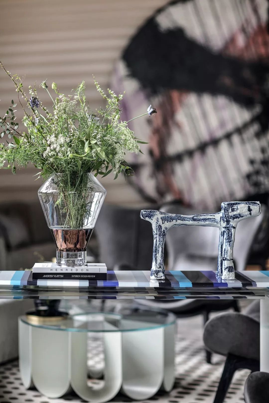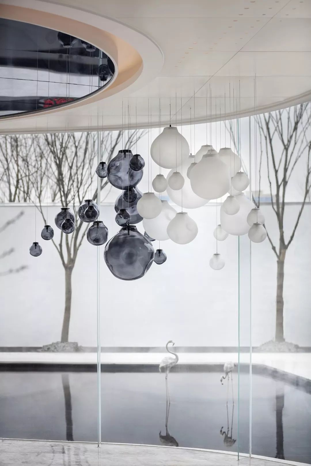 艺术雕塑立于吊灯之下,仰望场景的思考,是软装情景带入感的表现,更是室内美学思考的高级营销手段,这也是艺术运用商业空间的非凡意义。