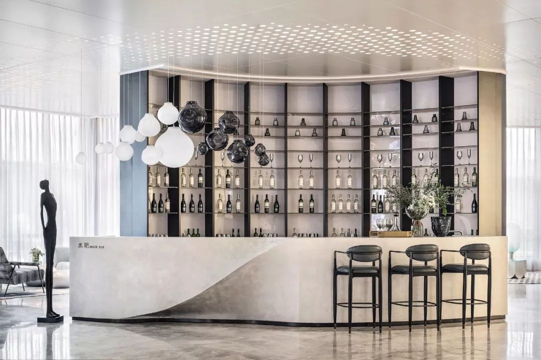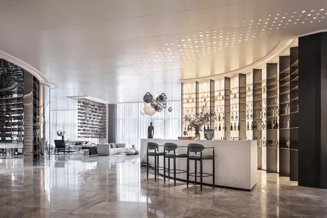 没有人可以定义空间该有的样子是什么,而SCD一直在尝试空间该有的可能性是什么,这种可能性是从设计师不断的尝试和变革中,慢慢呈现出来。设计师将数字化设计运用与吧台呈现完整的“S”切面,和整体空间形成契合,弧面比例精密准确,优雅细腻,配合天花板“S”的灯光流线,浑然一体,在极具现代几何美感的画面中仍流淌出诗意,是美感赋予空间的气质。