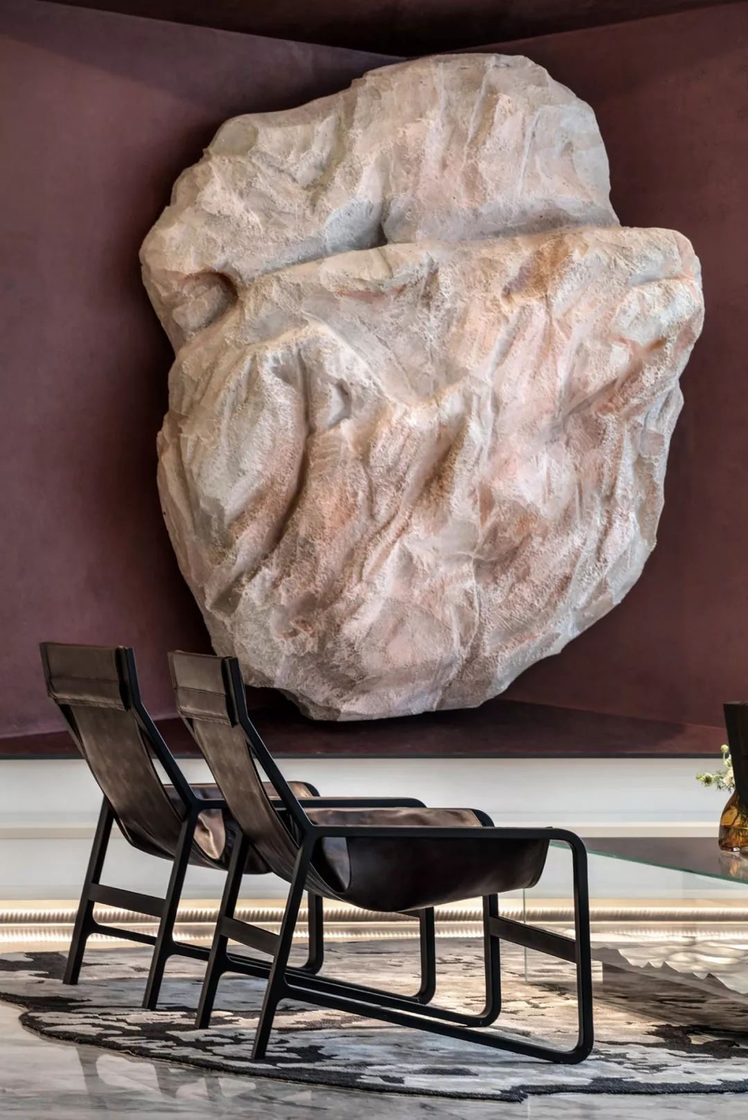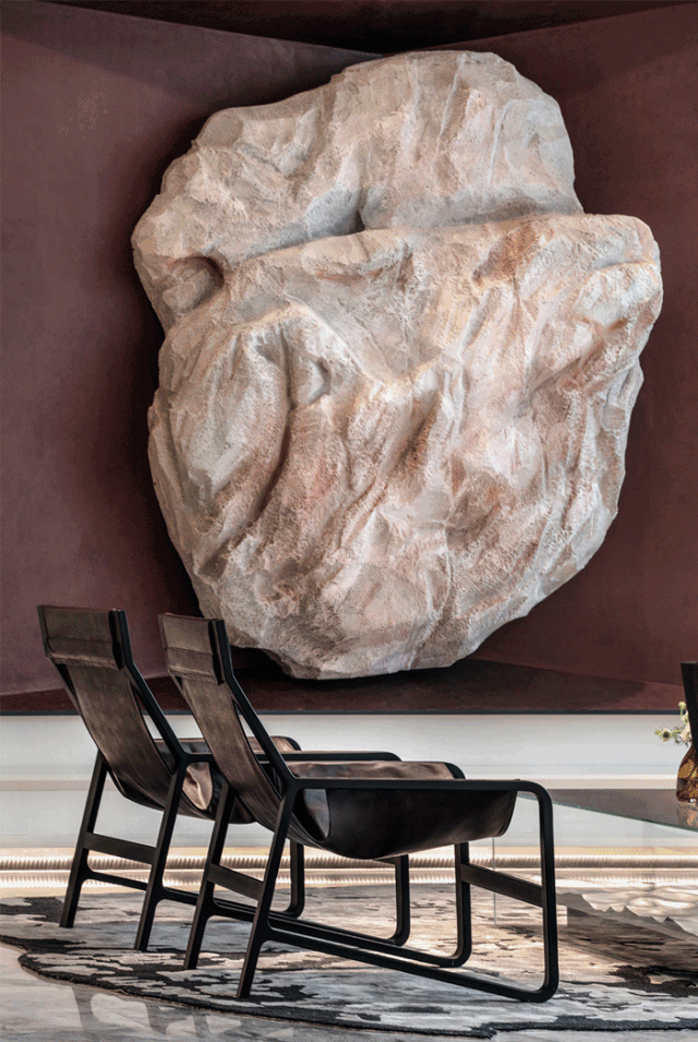 在设计师特意为临雕塑存在而转面折入的墙体上,雕塑成为安然而有力的象征,置身其中,感受到温暖和力量,也是洽谈区人与人相围而坐信任氛围的漫延和建立。而这幅作品原有的意义就是反抗“无情的商业化”,建立艺术家内心去艺术纯粹的精神追求。