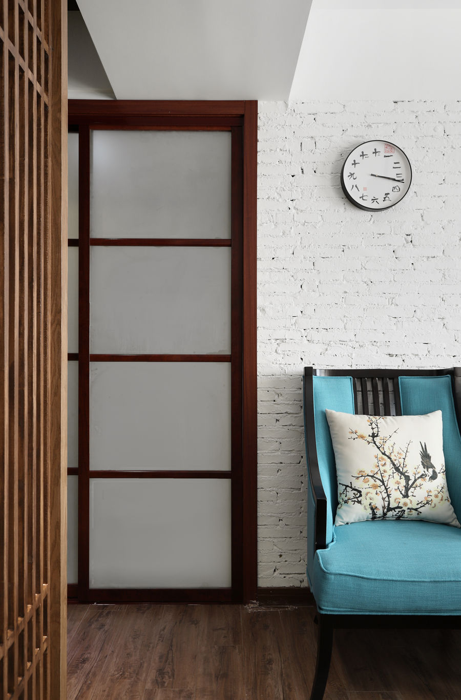 装饰物件协调统一,雅致的抱枕让空间更为柔美。挂画的外框和隔断的木质感也是有意识的统一呼应。