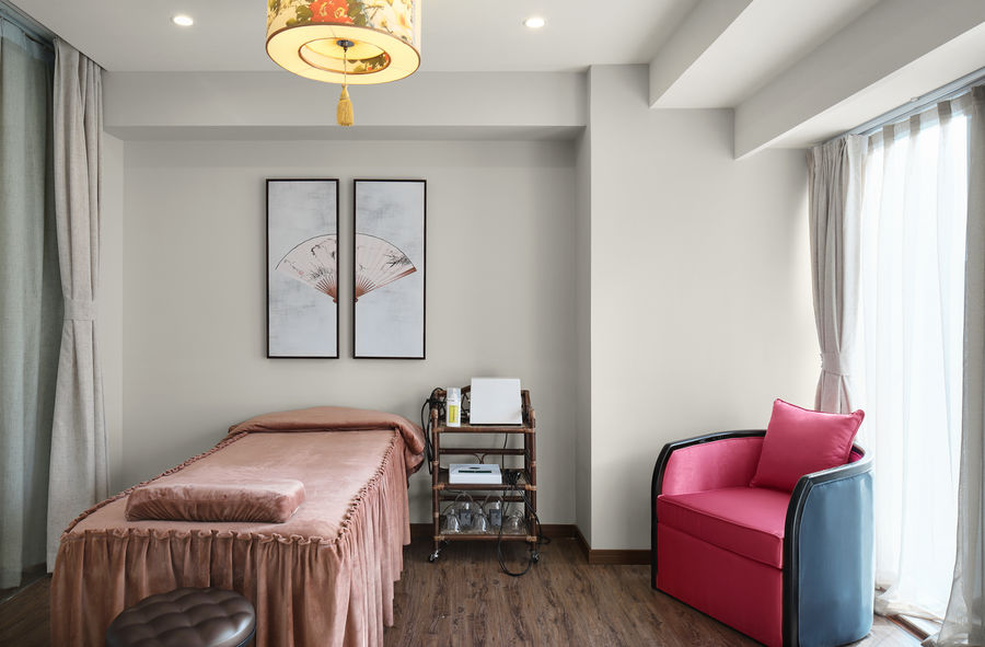 因为是女性养生会所,因此选择了白色的墙壁搭配粉色系的床和单人沙发,整个空间和谐统一,赋予一种小资感,令来访的客户可以得到片刻的宁静和享受。