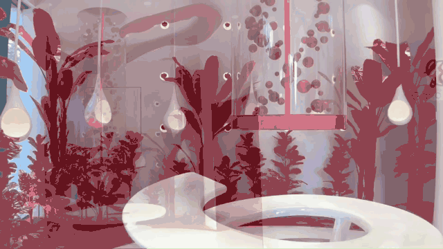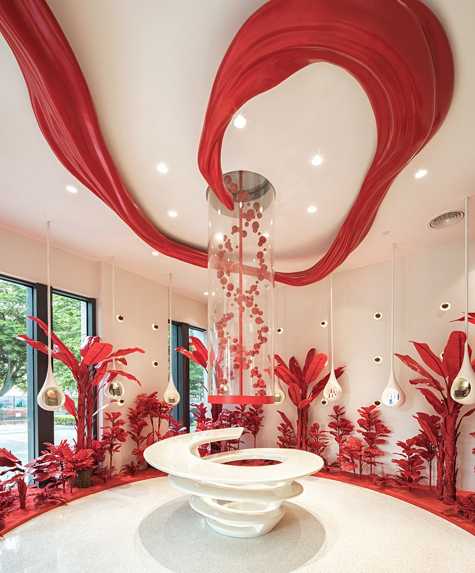 为此特别设计的DNA艺术动感装置,象征健康活力的血液向上旋转缓缓流动,连接延展生长在天花上的的红色飘带,巧妙的功能区分跟空间动线延伸扩展,也使体验空间显得更整体。雨滴展示装置的随机下落停留在整个热带雨林布景中更直接明了的展示灵芝生长环境。