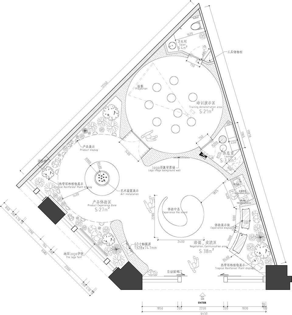为了可以应对各种活动及其他需求,我们设计了一个多功能的空间 ,以不同的展示方式及灯光表现为特色。白色墙面在紫外光源的照射下走入又一个梦幻神秘的雨林奇境:在正常的自然灯光下则是一个培训及休息的区域。创造一个活力、热情、人与自然对话的空间,让从热带雨林走出来的精灵为人民带来更加健康的生活体验。