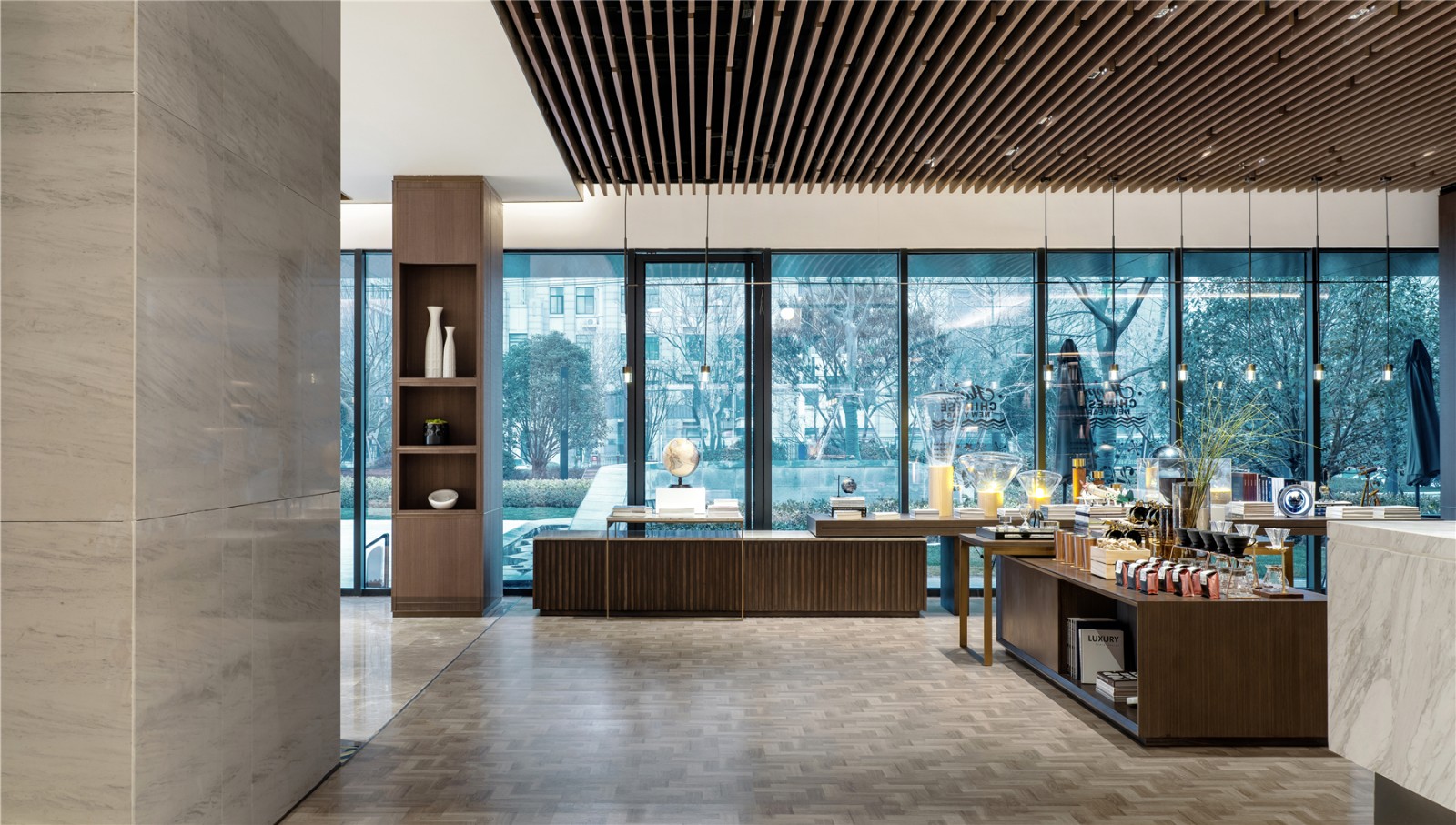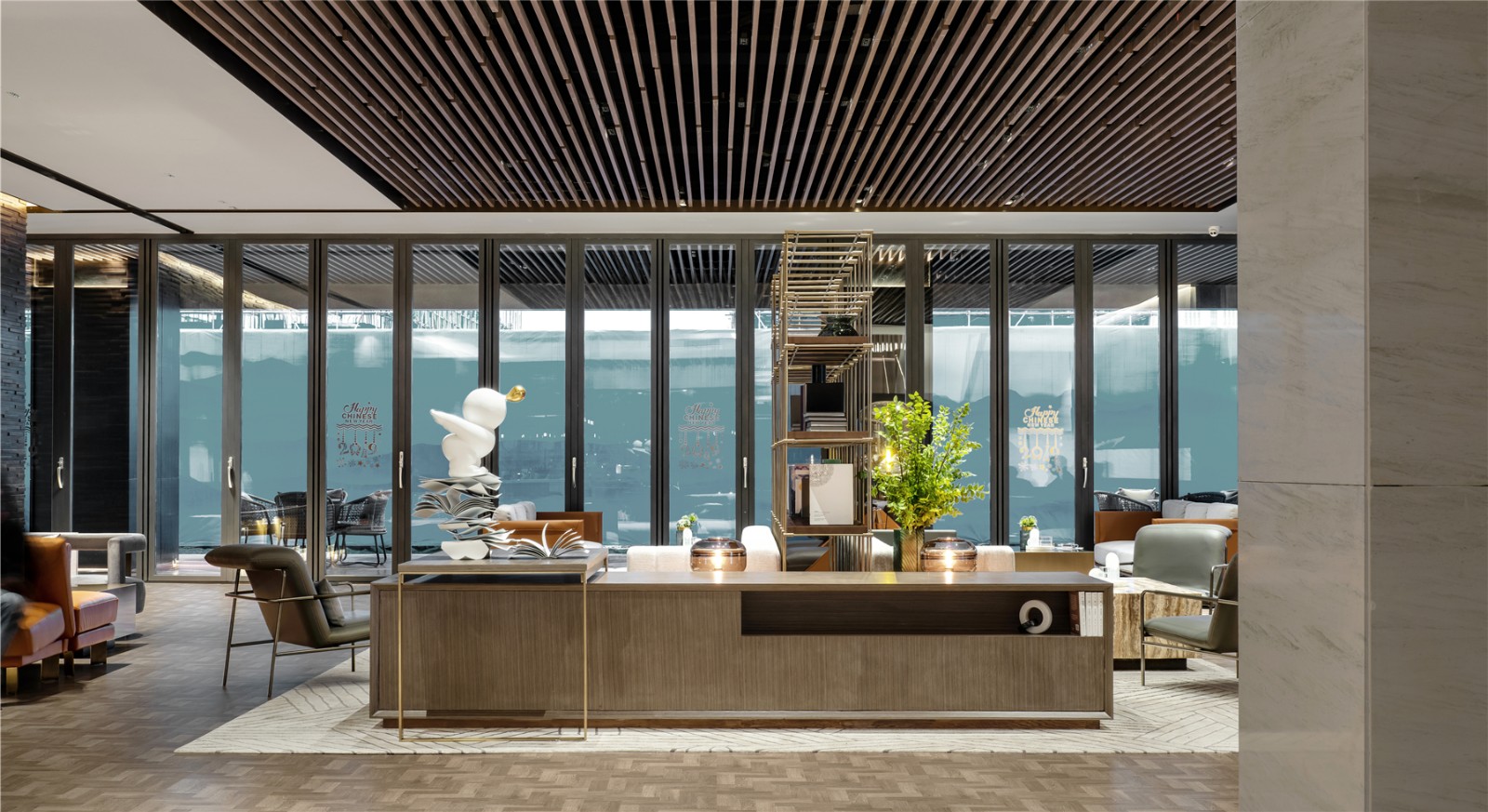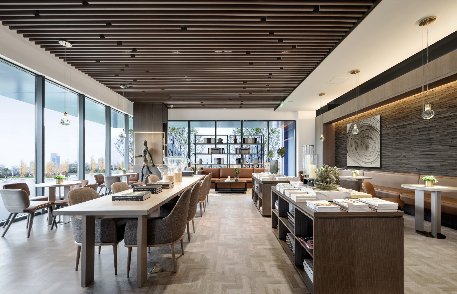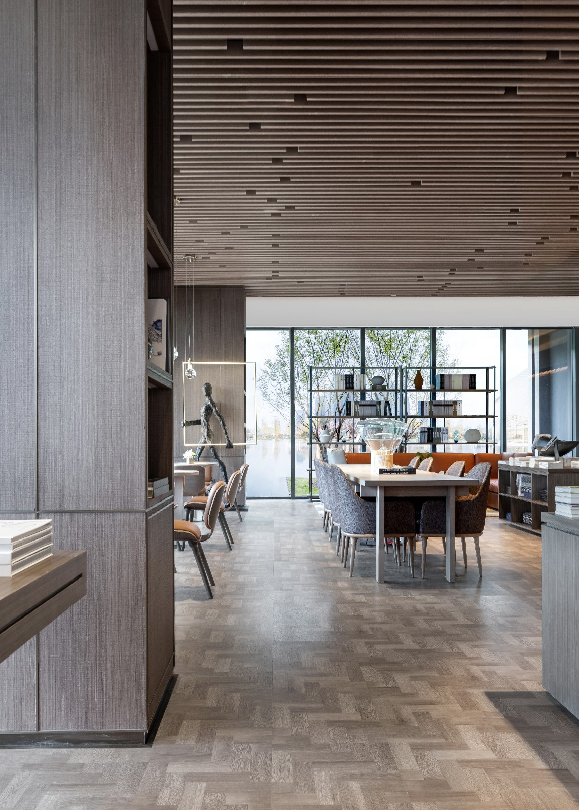 设计师引入书吧的概念,用极具场景体验性的表现形式,模糊售楼功能与文化场所的边界。接待前厅以木饰面与石材组合穿插,线条简约的艺术装置,给人温馨而宁静的感觉。