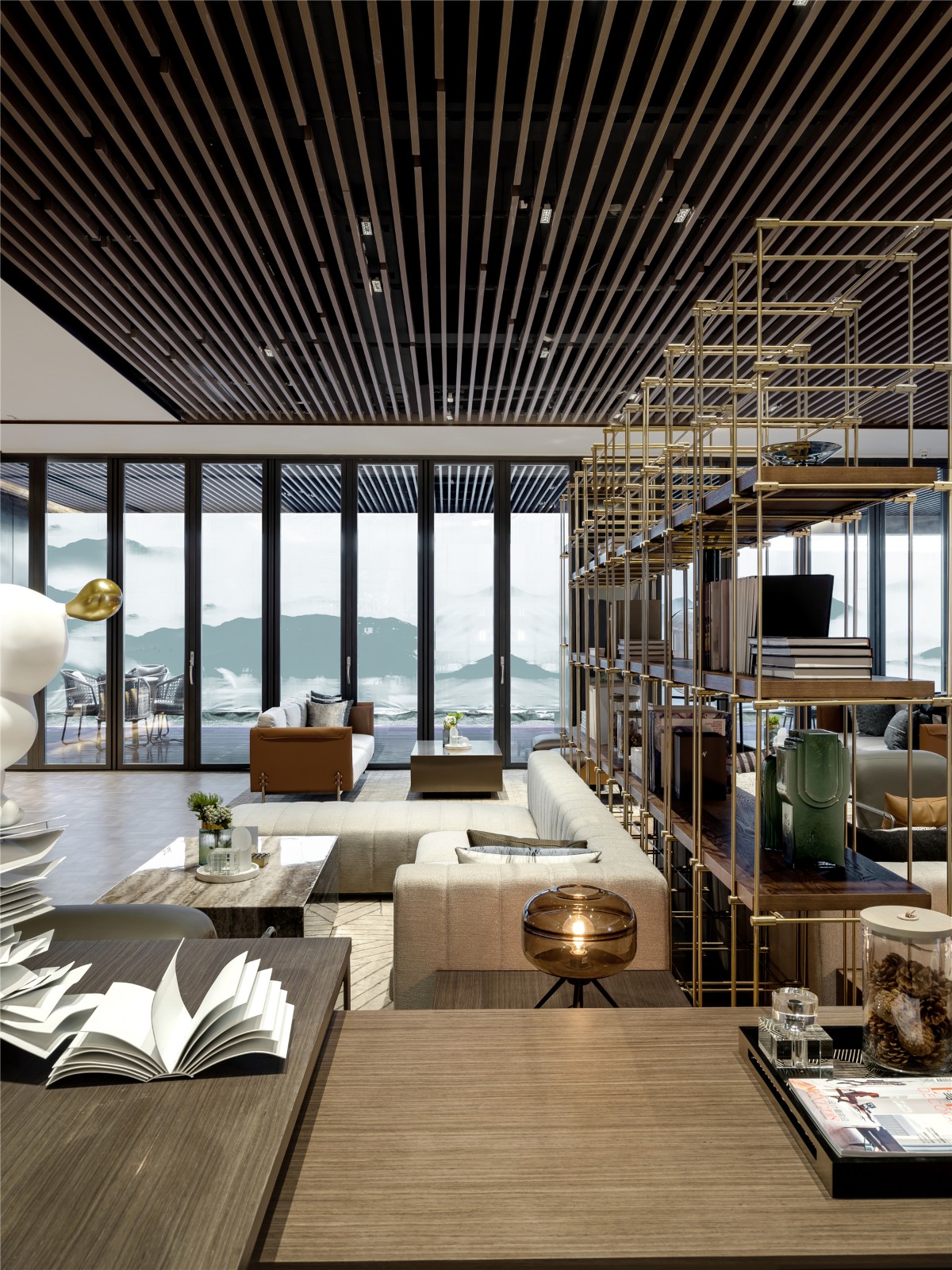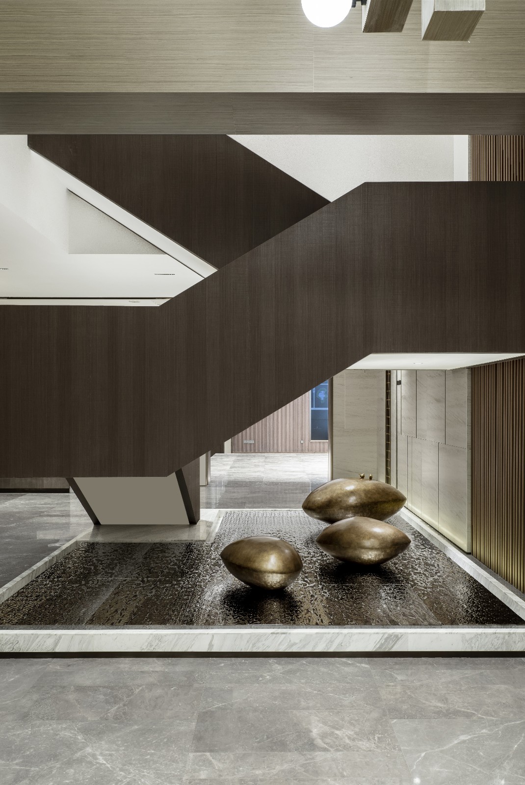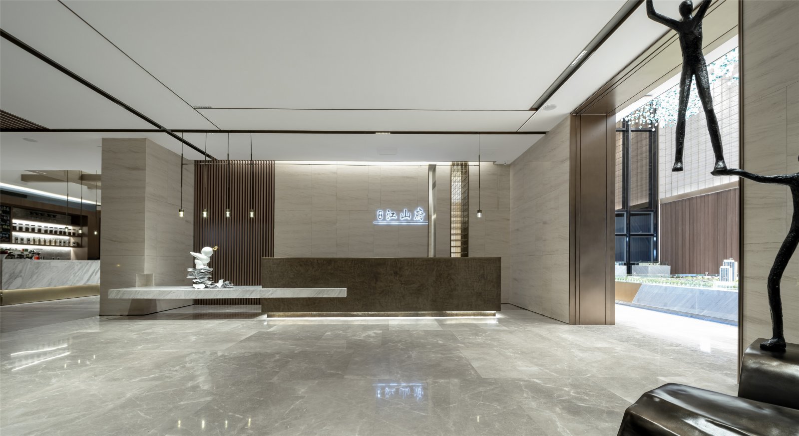 设计师引入书吧的概念,用极具场景体验性的表现形式,模糊售楼功能与文化场所的边界。接待前厅以木饰面与石材组合穿插,线条简约的艺术装置,给人温馨而宁静的感觉。