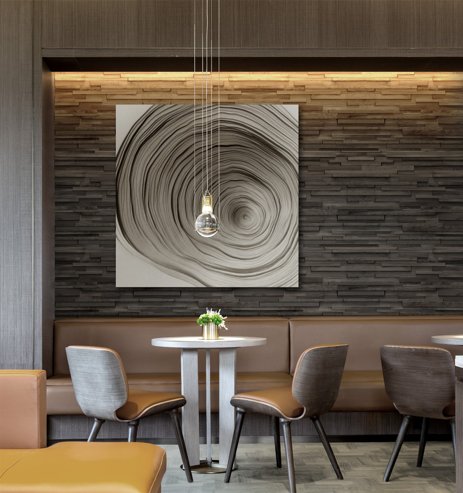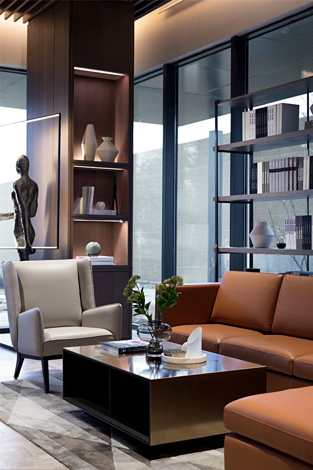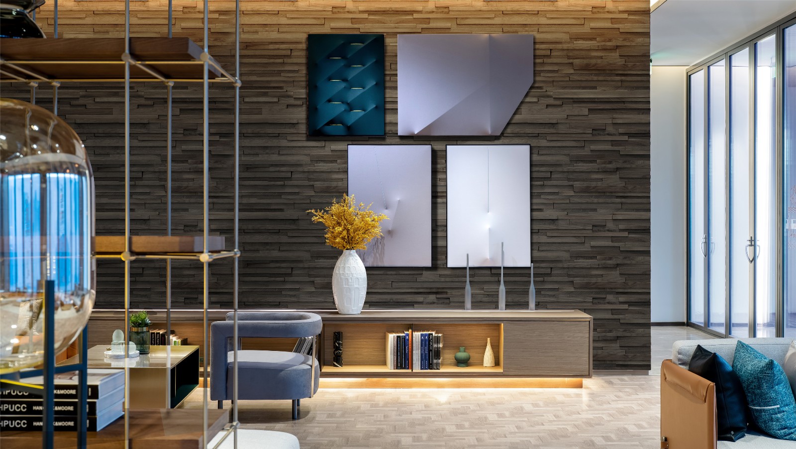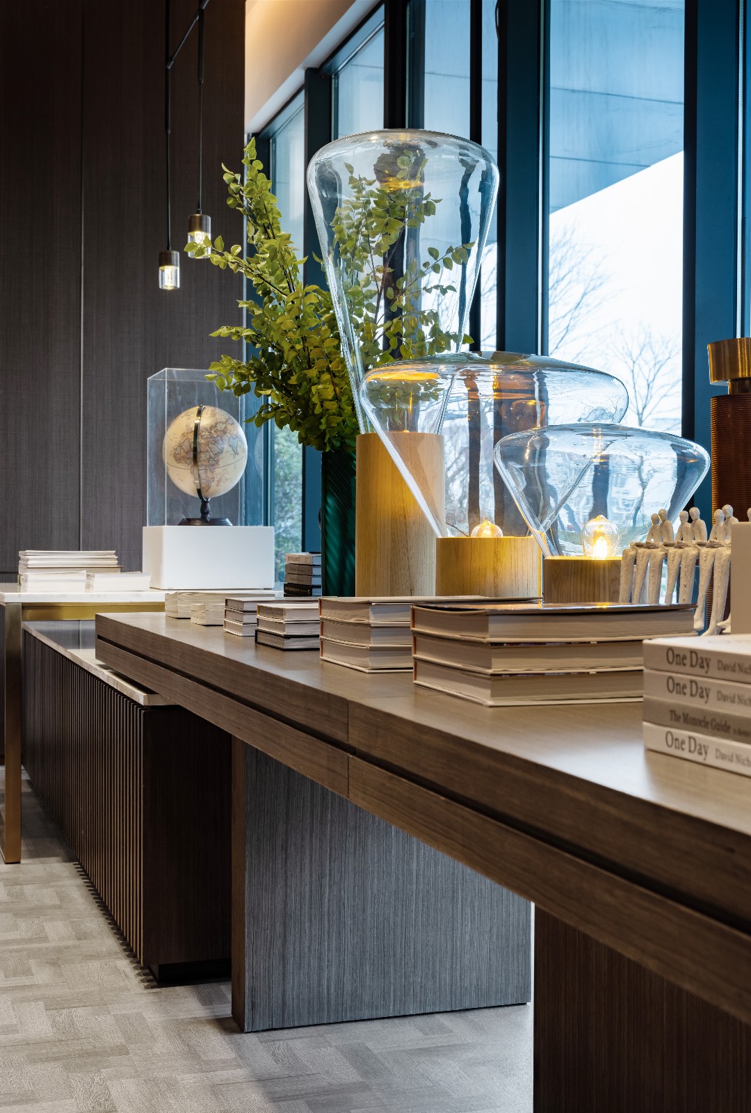 设计师引入书吧的概念,用极具场景体验性的表现形式,模糊售楼功能与文化场所的边界。接待前厅以木饰面与石材组合穿插,线条简约的艺术装置,给人温馨而宁静的感觉。
