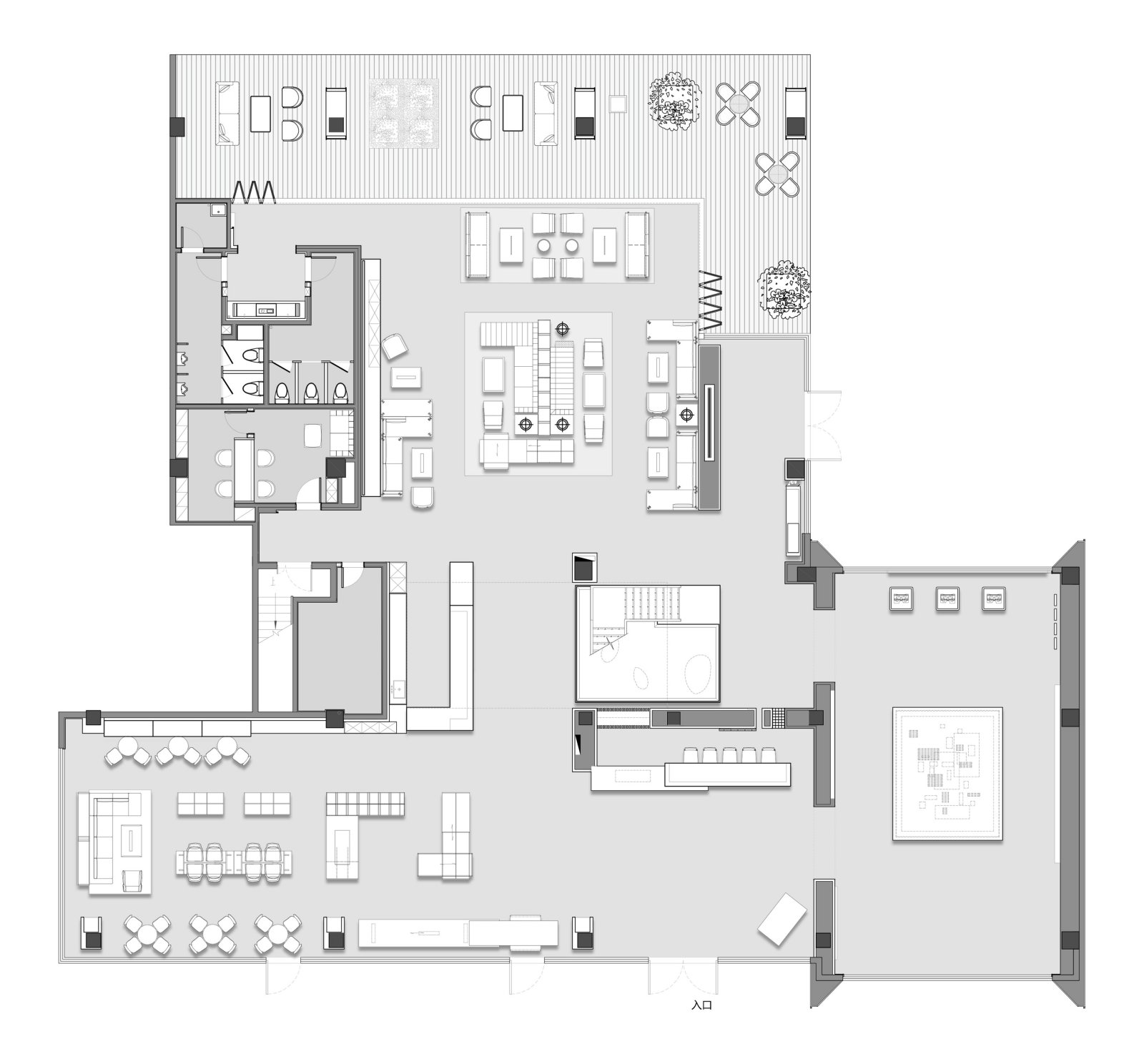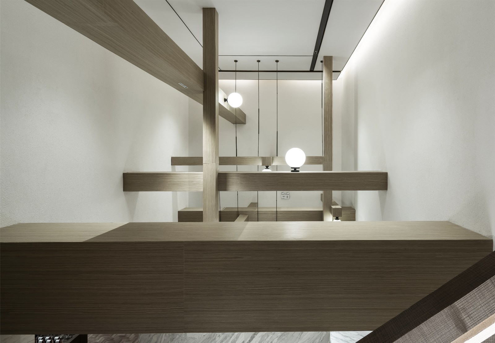 前厅左侧功能为洽谈区,然而置身其中,首先会被空间里的书香所打动。空间视觉通透,木质的温润和亲和力让人沉静下来,翻阅几本好书,找一处临窗的座位坐下来喝一杯手冲咖啡。冷暖光的交错,让图书陈列区和阅读洽谈区分别营造出了不同的空间氛围。天花的原木线条与线型书架形成有序美感,赋予通透空间以层次和变化,在秩序中表现灵动。