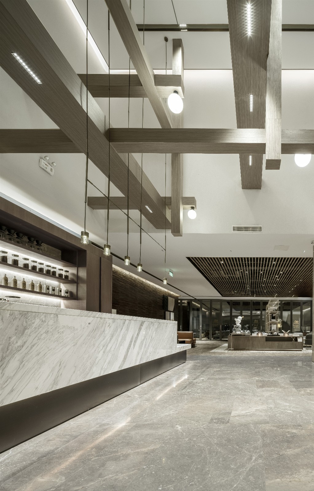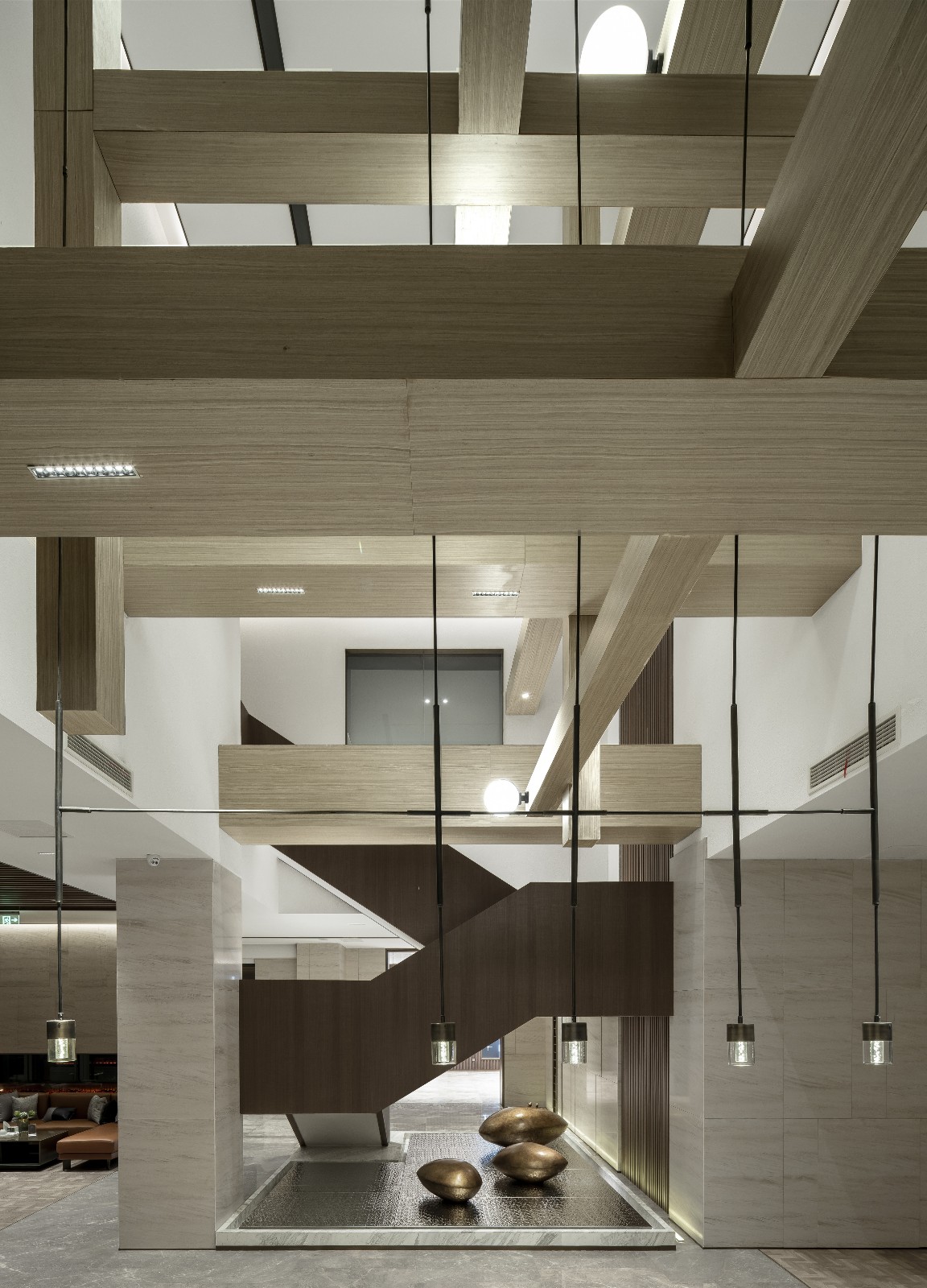 咖啡吧上方建筑挑空,尺度比例厚重的浅木色线条穿插形成建筑美感,几盏白光质朴的圆形灯具取珍珠的意向点缀其中,书海的浩瀚,文化的厚重,与现代感的咖啡吧相结合,就可撷取一隅的轻松。