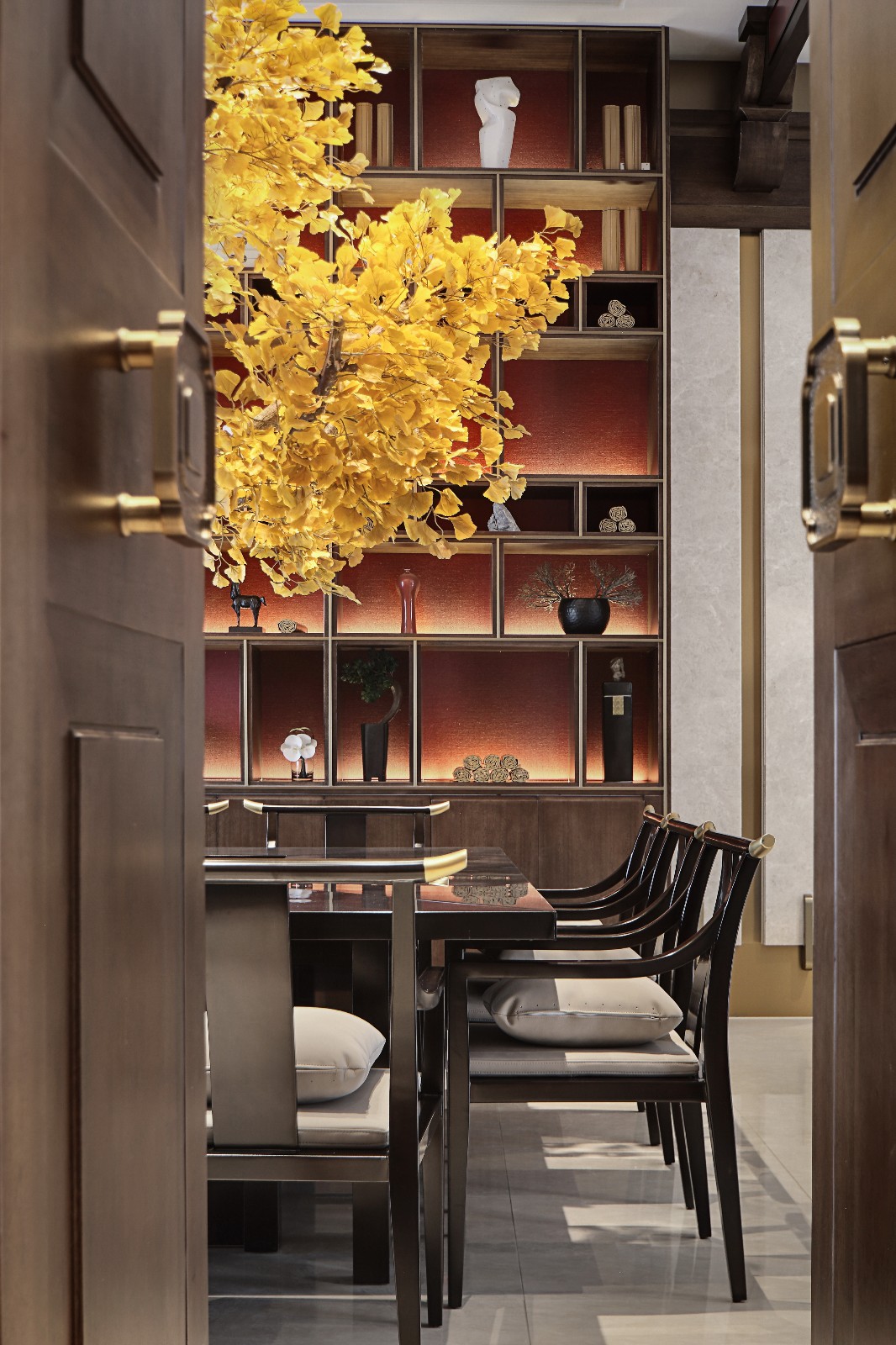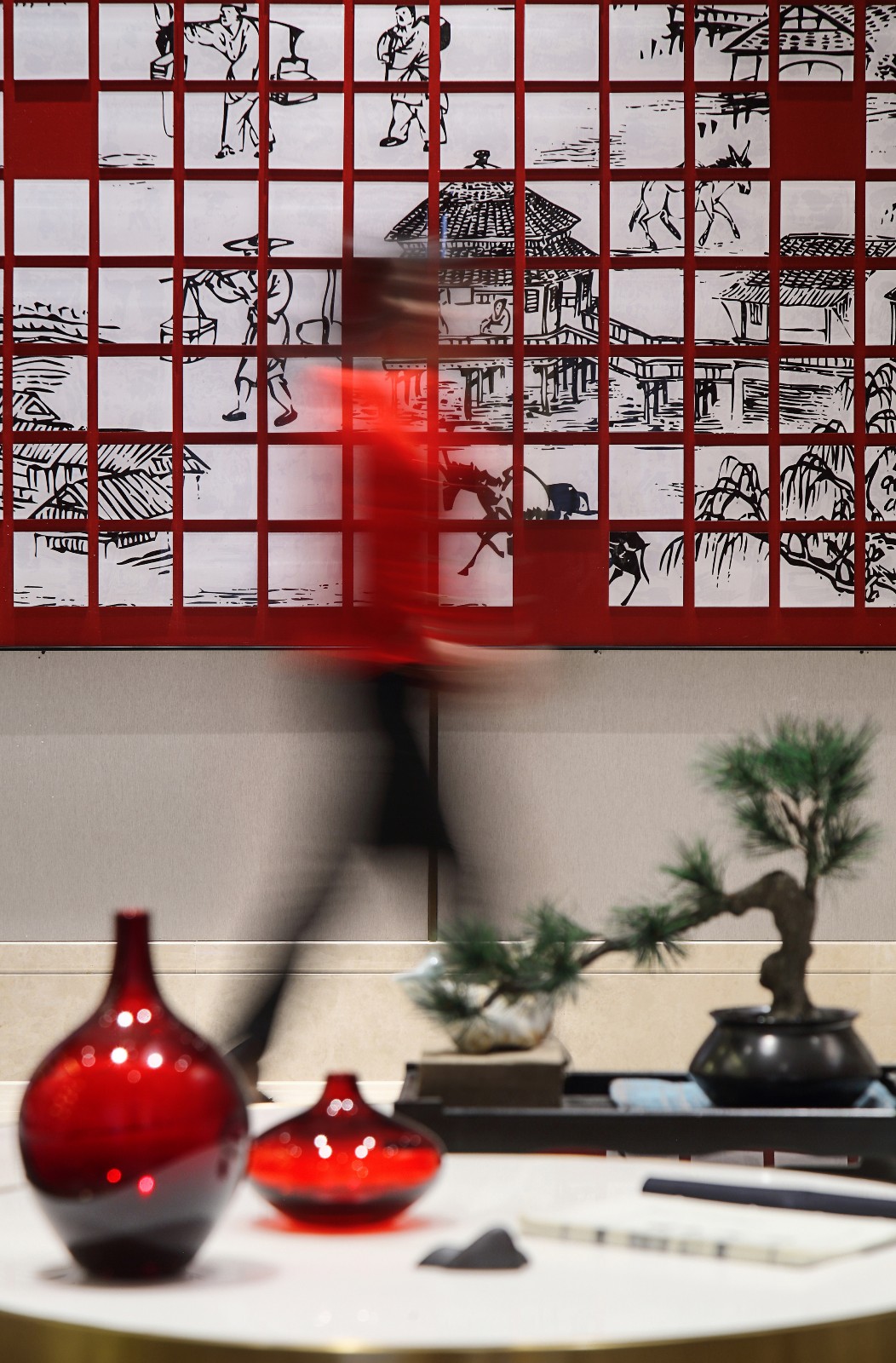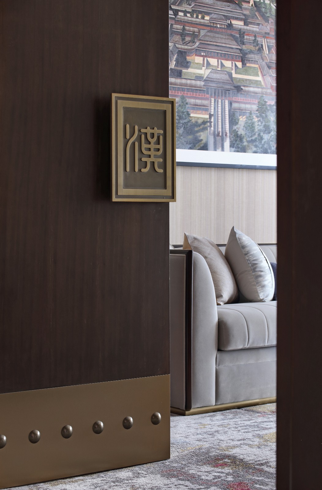 水吧与书吧遥相呼应,竹简与陶瓷茶罐依次摆放于壁橱之中,卷卷刻有汉史的竹简将汉时文化具象于点滴之中,意蕴悠长。陶瓷茶罐将茶与文化有机结合,不仅运用茶文化体现室内设计传达的物质文化与精神文化,更以茶文化为载体,传达出华夏千年文化的待客之道与传统礼仪。