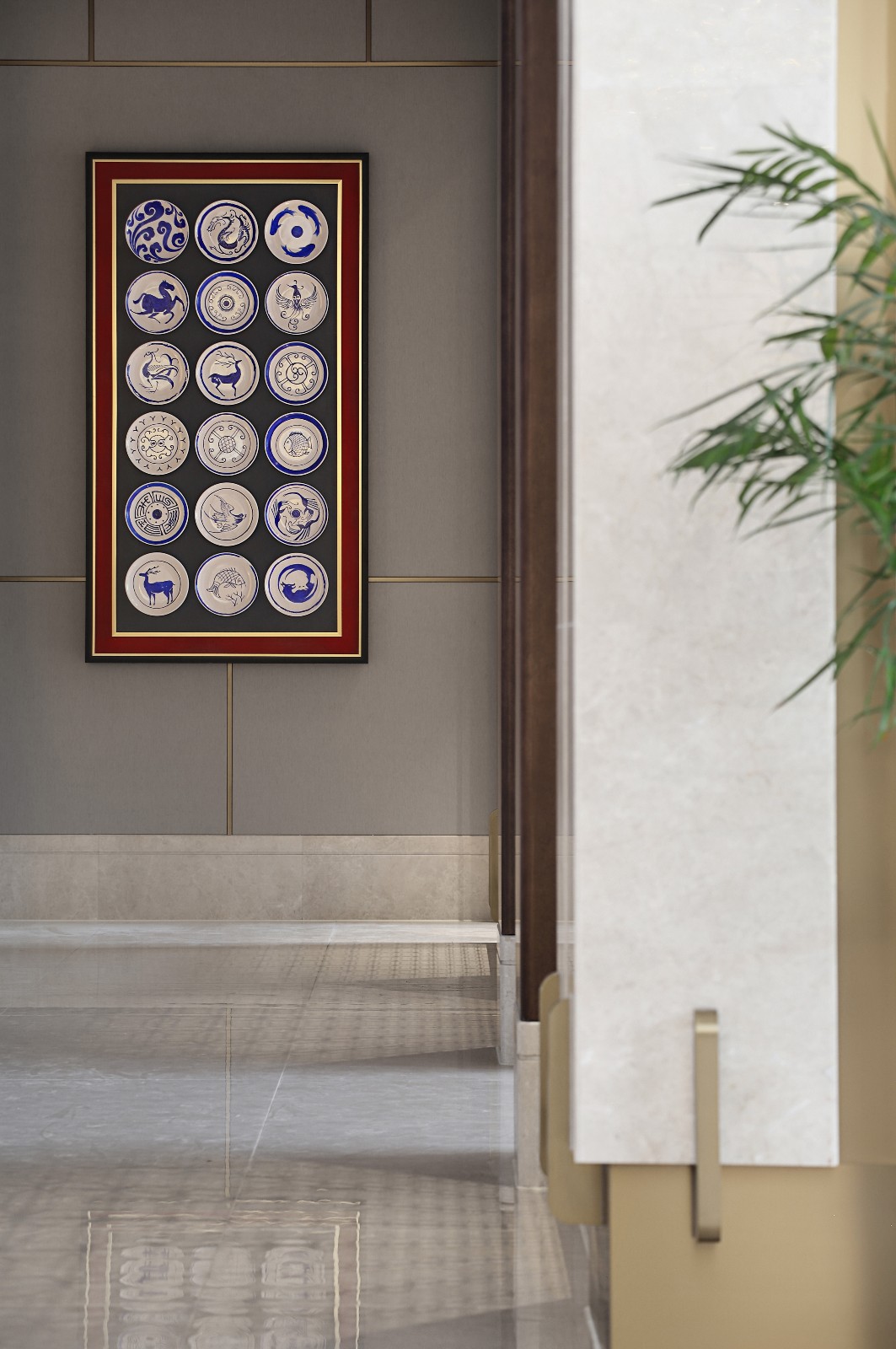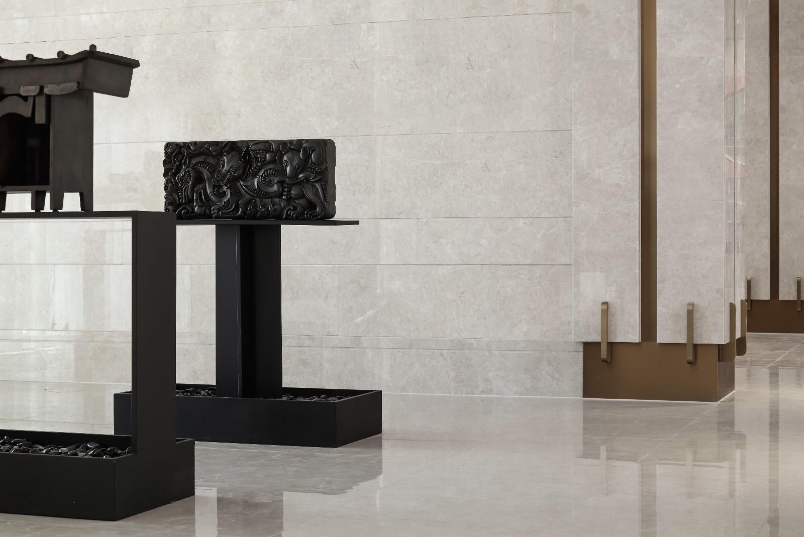 设计师在整个空间中运用大量浮雕手法,呈现出邳州人自汉下邳时期“昂扬向上、坚韧挺拔、心无旁骛,精诚团结”的积极生活面貌。走廊尽头运用纹样精美的瓦当元素,在瓦当之上雕刻神鹿与祥云,神鹿跳跃于祥云之间,寓意吉祥如意。