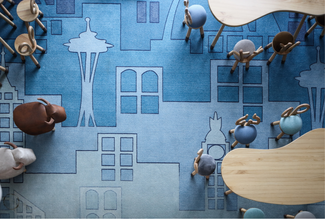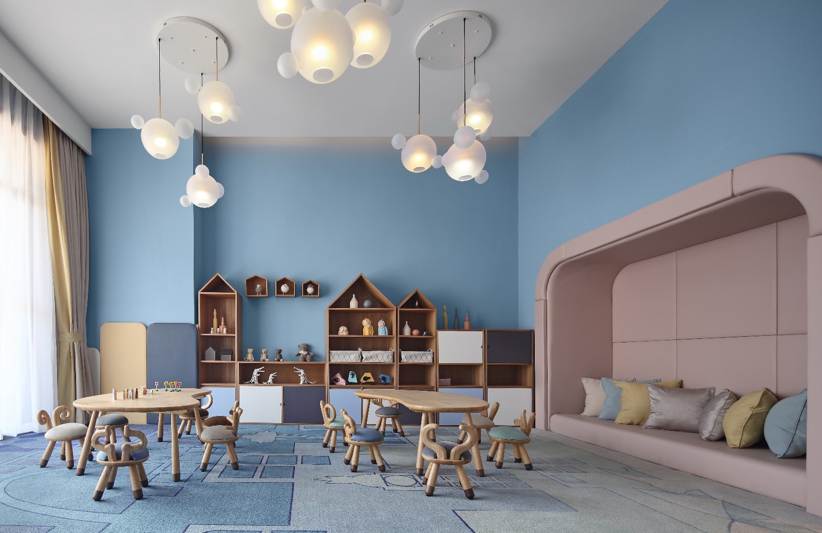 儿童活动区域,设计师在繁华古风中开辟一隅现代清新。“绵羊”在海洋中自由穿梭,海底矗立着都市中的摩天大厦,童趣与梦幻浪漫相随;那一抹清新和温情,曼妙而和谐,倏尔之间将空间点亮。