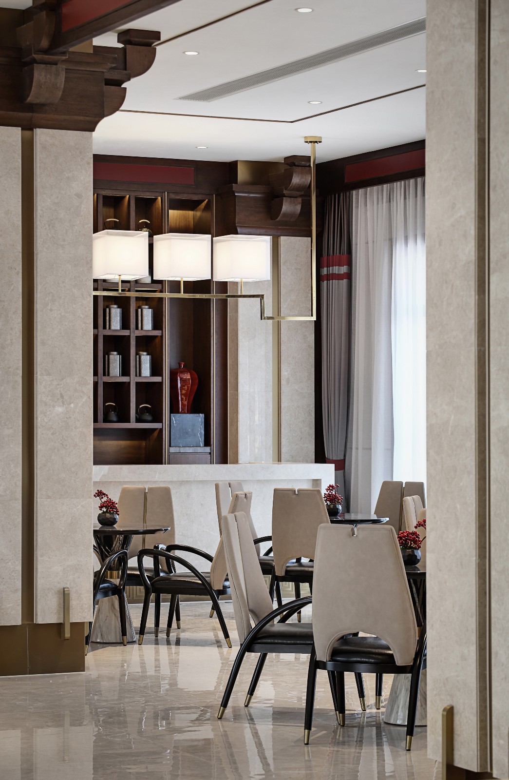 在设计中,以汉代皇室建筑未央宫为主线,以此来奠定室内恢宏大气的格局。室内运用大量斗栱元素,斗栱立于白色大理石柱之上,既提升室内层次,又塑造两汉文化的大气磅礴之势。