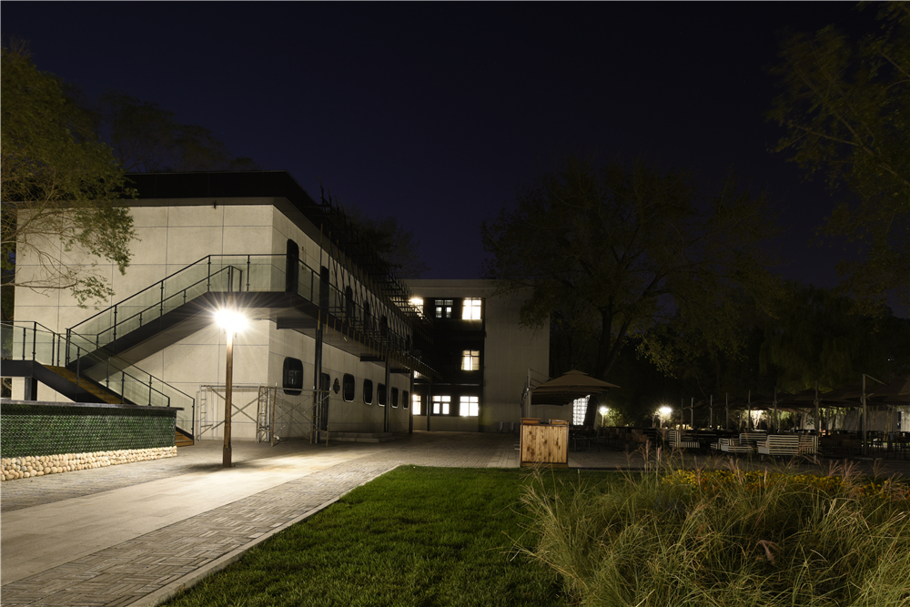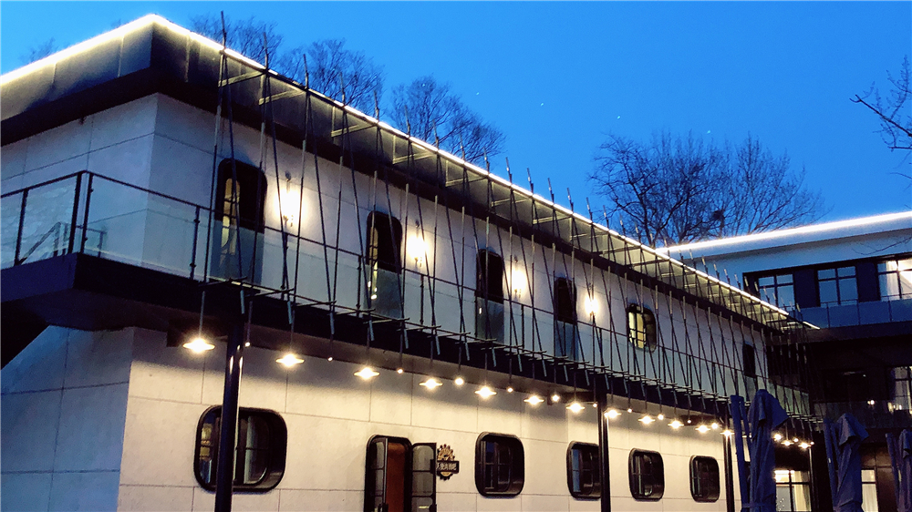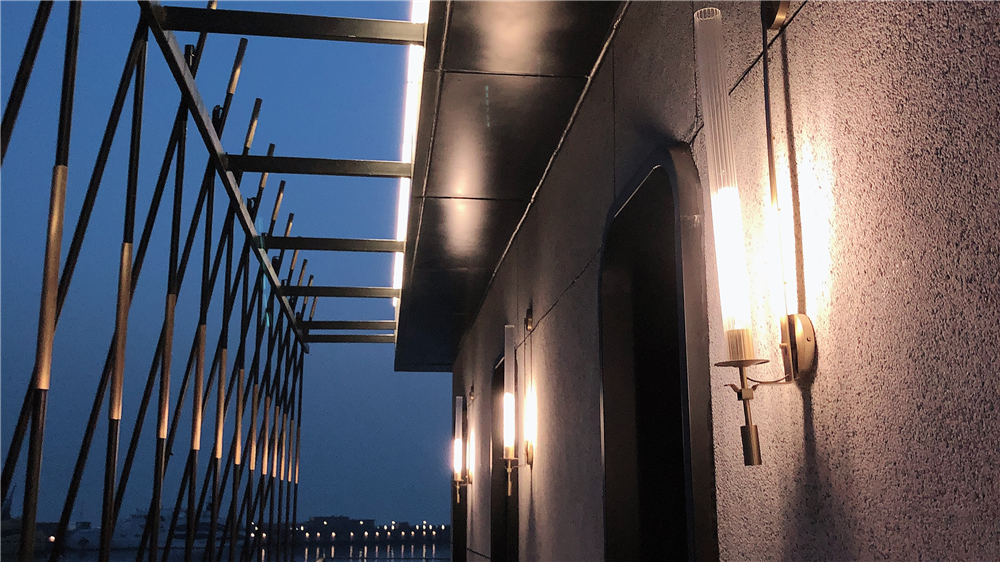 酒吧外立面巧妙的融合了船桨形态的元素,立面体型以及细部元素简单干净,体现了现代建筑点、线、面的空间造型特点,整体和谐平衡、通透美观,切合主题设计理念,来到这里的人仿佛置身浩瀚大海中,聆听海浪的声音,享受无拘无束的心境。